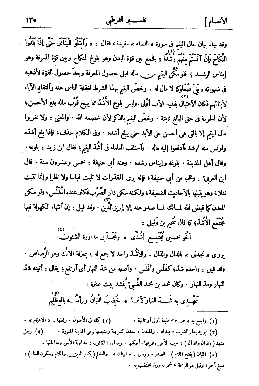 وَقَدْ جَاءَ بَيَانُ حَالِ الْيَتِيمِ فِي سُورَةِ" النِّسَاءِ" مُقَيَّدَةً، فَقَالَ:" وَابْتَلُوا الْيَتامى حَتَّى إِذا بَلَغُوا النِّكاحَ فَإِنْ آنَسْتُمْ مِنْهُمْ رُشْداً «١» " فَجَمَعَ بَيْنَ قُوَّةِ الْبَدَنِ وَهُوَ بُلُوغُ النِّكَاحِ، وَبَيْنَ قُوَّةِ الْمَعْرِفَةِ وَهُوَ إِينَاسُ الرُّشْدِ، فَلَوْ مُكِّنَ الْيَتِيمُ مِنْ مَالِهِ قَبْلَ حُصُولِ الْمَعْرِفَةِ وَبَعْدَ حُصُولِ الْقُوَّةِ لَأَذْهَبَهُ فِي شَهْوَتِهِ وَبَقِيَ صُعْلُوكًا لَا مَالَ لَهُ. وَخُصَّ الْيَتِيمُ بِهَذَا الشَّرْطِ لغفلة الناس عنه وافتقاد الآباء لأبنائهم فَكَانَ الِاهْتِبَالُ «٢» بِفَقِيدِ الْأَبِ أَوْلَى. وَلَيْسَ بُلُوغُ الْأَشُدِّ مِمَّا يُبِيحُ قُرْبَ مَالِهِ بِغَيْرِ الْأَحْسَنِ، لِأَنَّ الْحُرْمَةَ فِي حَقِّ الْبَالِغِ ثَابِتَةٌ. وَخُصَّ الْيَتِيمُ بِالذِّكْرِ لِأَنَّ خَصْمَهُ اللَّهُ. وَالْمَعْنَى: وَلَا تَقْرَبُوا مَالَ الْيَتِيمِ إِلَّا بِالَّتِي هِيَ أَحْسَنُ عَلَى الْأَبَدِ حَتَّى يَبْلُغَ أَشُدَّهُ. وَفِي الْكَلَامِ حَذْفٌ، فَإِذَا بَلَغَ أَشُدَّهُ وَأُونِسَ مِنْهُ الرُّشْدُ فَادْفَعُوا إِلَيْهِ مَالَهُ. وَاخْتَلَفَ الْعُلَمَاءُ فِي أَشُدِّ الْيَتِيمِ، فَقَالَ ابْنُ زَيْدٍ: بُلُوغُهُ. وَقَالَ أَهْلُ الْمَدِينَةِ. بُلُوغُهُ وَإِينَاسُ رُشْدِهِ. وَعِنْدَ أَبِي حَنِيفَةَ: خَمْسٌ وَعِشْرُونَ سَنَةً. قَالَ ابْنُ الْعَرَبِيِّ: وَعَجَبًا مِنْ أَبِي حَنِيفَةَ، فَإِنَّهُ يَرَى أَنَّ الْمُقَدَّرَاتِ لَا تَثْبُتُ قِيَاسًا وَلَا نَظَرًا وَإِنَّمَا تَثْبُتُ نَقْلًا، وَهُوَ يُثْبِتُهَا بِالْأَحَادِيثِ الضَّعِيفَةِ، وَلَكِنَّهُ سَكَنَ دَارَ الضَّرْبِ فَكَثُرَ عِنْدَهُ الْمُدَلِّسُ، وَلَوْ سَكَنَ الْمَعْدِنَ كَمَا قَيَّضَ اللَّهُ لِمَالِكٍ لِمَا صَدَرَ عَنْهُ إِلَّا إِبْرِيزُ الدِّينِ «٣». وَقَدْ قِيلَ: إِنَّ انْتِهَاءَ الْكُهُولَةِ فِيهَا مُجْتَمَعُ الْأَشُدِّ، كَمَا قَالَ سُحَيْمُ بْنُ وَثِيلٍ: