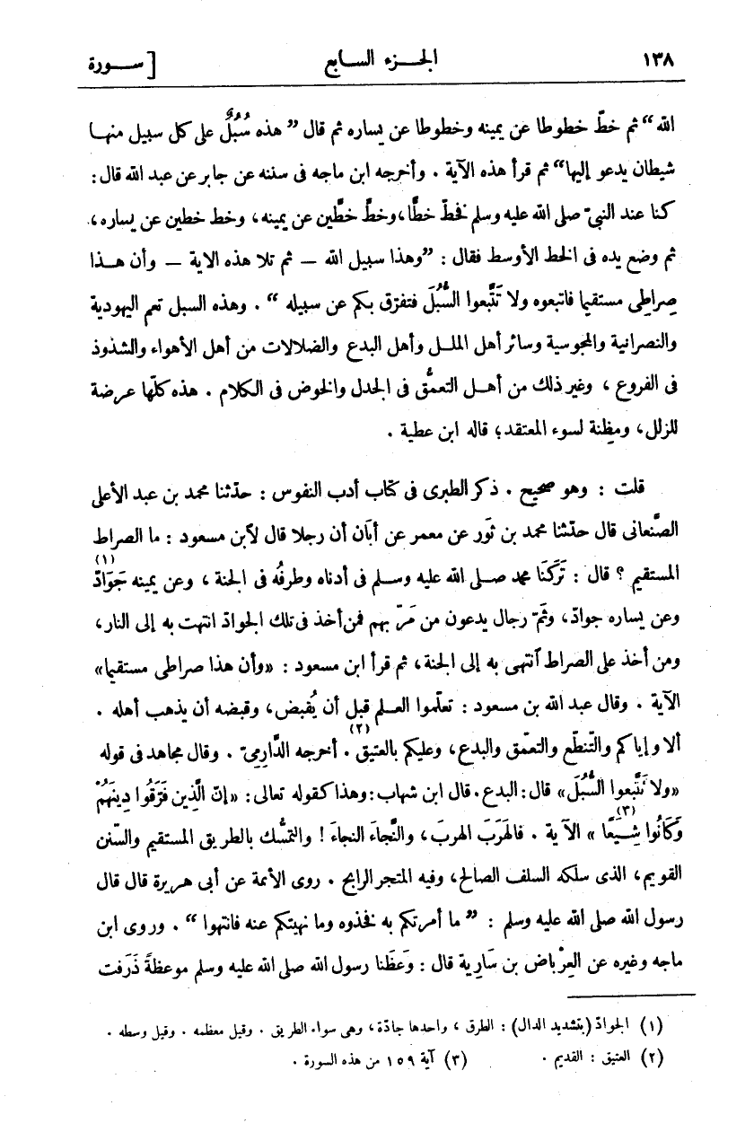 مِنْهَا شَيْطَانٌ يَدْعُو إِلَيْهَا) ثُمَّ قَرَأَ هَذِهِ الْآيَةَ. وَأَخْرَجَهُ ابْنُ مَاجَهْ فِي سُنَنِهِ عَنْ جَابِرِ بْنِ عَبْدِ اللَّهِ قَالَ: كُنَّا عِنْدَ النَّبِيِّ صَلَّى اللَّهُ عَلَيْهِ وَسَلَّمَ فَخَطَّ خَطًّا، وَخَطَّ خَطَّيْنِ عَنْ يَمِينِهِ، وَخَطَّ خَطَّيْنِ عَنْ يَسَارِهِ، ثُمَّ وَضَعَ يَدَهُ فِي الْخَطِّ الْأَوْسَطِ فَقَالَ: (هَذَا سَبِيلُ اللَّهِ- ثُمَّ تَلَا هَذِهِ الْآيَةَ-" وَأَنَّ هَذَا صِراطِي مُسْتَقِيماً فَاتَّبِعُوهُ وَلا تَتَّبِعُوا السُّبُلَ فَتَفَرَّقَ بِكُمْ عَنْ سَبِيلِهِ". وَهَذِهِ السُّبُلُ تَعُمُّ الْيَهُودِيَّةَ وَالنَّصْرَانِيَّةَ وَالْمَجُوسِيَّةَ وَسَائِرَ أَهْلِ الْمِلَلِ وَأَهْلِ الْبِدَعِ وَالضَّلَالَاتِ مِنْ أَهْلِ الْأَهْوَاءِ وَالشُّذُوذِ فِي الْفُرُوعِ، وَغَيْرَ ذَلِكَ مِنْ أَهْلِ التَّعَمُّقِ فِي الْجَدَلِ وَالْخَوْضِ فِي الْكَلَامِ. هَذِهِ كلها عرضة للزلل، ومظنة لسوء المعتقد، قال ابْنُ عَطِيَّةَ. قُلْتُ: وَهُوَ الصَّحِيحُ. ذَكَرَ الطَّبَرِيُّ فِي كِتَابِ آدَابِ النُّفُوسِ: حَدَّثَنَا مُحَمَّدُ بْنُ عَبْدِ الْأَعْلَى الصَّنْعَانِيُّ قَالَ حَدَّثَنَا مُحَمَّدُ بْنُ ثَوْرٍ عَنْ مَعْمَرٍ عَنْ أَبَانٍ أَنَّ رَجُلًا قَالَ لِابْنِ مَسْعُودٍ: مَا الصِّرَاطُ الْمُسْتَقِيمُ؟ قَالَ: تَرَكَنَا مُحَمَّدٌ صَلَّى اللَّهُ عَلَيْهِ وَسَلَّمَ فِي أَدْنَاهُ وَطَرَفُهُ فِي الْجَنَّةِ، وَعَنْ يَمِينِهِ جَوَادٌ «١» وَعَنْ يَسَارِهِ جَوَادٌ، وَثَمَّ رِجَالٌ يَدْعُونَ مَنْ مَرَّ بِهِمْ فَمَنْ أَخَذَ فِي تِلْكَ الْجَوَادِ انْتَهَتْ بِهِ إِلَى النَّارِ، وَمَنْ أَخَذَ عَلَى الصِّرَاطِ انْتَهَى بِهِ إِلَى الْجَنَّةِ، ثُمَّ قَرَأَ ابْنُ مَسْعُودٍ:" وَأَنَّ هَذَا صِرَاطِي مُسْتَقِيمًا" الْآيَةَ. وَقَالَ عَبْدُ اللَّهِ بْنُ مَسْعُودٍ: تَعَلَّمُوا الْعِلْمَ قَبْلَ أَنْ يُقْبَضَ، وَقَبْضُهُ أَنْ يَذْهَبَ أَهْلُهُ، أَلَا وَإِيَّاكُمْ وَالتَّنَطُّعَ وَالتَّعَمُّقَ وَالْبِدَعَ «٢»، وَعَلَيْكُمْ بِالْعَتِيقِ «٣». أَخْرَجَهُ الدَّارِمِيُّ. وَقَالَ مُجَاهِدٌ فِي قَوْلِهِ:" وَلا تَتَّبِعُوا السُّبُلَ" قَالَ: الْبِدَعَ. قَالَ ابْنُ شِهَابٍ: وَهَذَا كَقَوْلِهِ تَعَالَى:" إِنَّ الَّذِينَ فَرَّقُوا دِينَهُمْ وَكانُوا شِيَعاً «٤» " الْآيَةَ. فَالْهَرَبَ الْهَرَبَ، وَالنَّجَاةَ النَّجَاةَ! وَالتَّمَسُّكَ بِالطَّرِيقِ الْمُسْتَقِيمِ وَالسَّنَنِ الْقَوِيمِ، الَّذِي سَلَكَهُ السَّلَفُ الصَّالِحُ، وَفِيهِ الْمَتْجَرُ الرَّابِحُ. رَوَى الْأَئِمَّةُ عَنْ أَبِي هُرَيْرَةَ قَالَ قَالَ رَسُولُ اللَّهِ صَلَّى اللَّهُ عَلَيْهِ وَسَلَّمَ: (مَا أَمَرْتُكُمْ بِهِ فَخُذُوهُ وَمَا نَهَيْتُكُمْ عَنْهُ فَانْتَهُوا). وَرَوَى ابْنُ مَاجَهْ وَغَيْرُهُ عَنِ الْعِرْبَاضِ بْنِ سَارِيَةَ قَالَ: وَعَظَنَا رَسُولُ اللَّهِ صَلَّى اللَّهُ عَلَيْهِ وَسَلَّمَ موعظة ذرفت