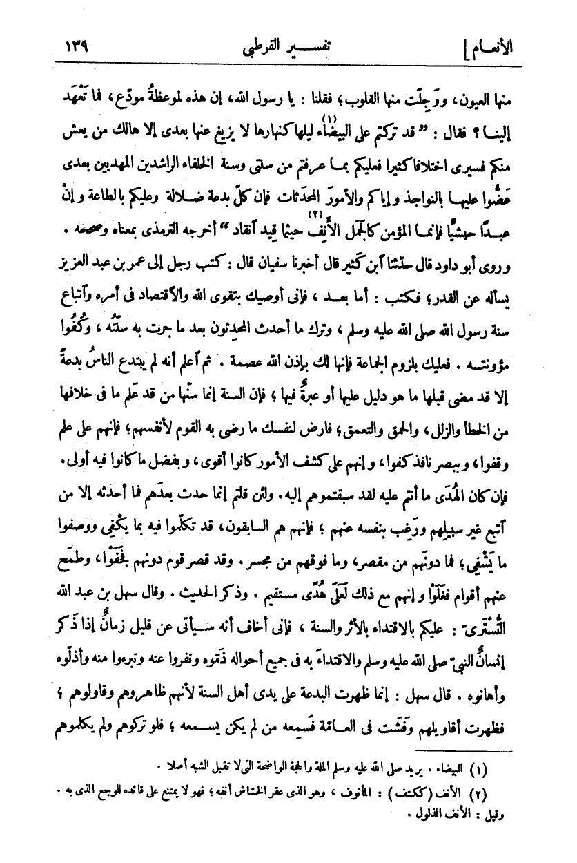مِنْهَا الْعُيُونُ، وَوَجِلَتْ مِنْهَا الْقُلُوبُ، فَقُلْنَا: يَا رَسُولَ اللَّهِ، إِنَّ هَذِهِ لَمَوْعِظَةُ مُوَدِّعٍ، فَمَا تَعْهَدُ إِلَيْنَا؟ فَقَالَ: (قَدْ تَرَكْتُكُمْ عَلَى الْبَيْضَاءِ «١» لَيْلُهَا كَنَهَارِهَا لَا يَزِيغُ عَنْهَا بَعْدِي إِلَّا هَالِكٌ مَنْ يَعِشْ مِنْكُمْ فَسَيَرَى اخْتِلَافًا كَثِيرًا فَعَلَيْكُمْ بِمَا عَرَفْتُمْ مِنْ سُنَّتِي وَسُنَّةِ الْخُلَفَاءِ الرَّاشِدِينَ الْمَهْدِيِّينَ بَعْدِي عَضُّوا عَلَيْهَا بِالنَّوَاجِذِ وَإِيَّاكُمْ وَالْأُمُورَ الْمُحْدَثَاتِ فَإِنَّ كُلَّ بِدْعَةٍ ضَلَالَةٌ وَعَلَيْكُمْ بالطاعة وإن عبد احبشيا فَإِنَّمَا الْمُؤْمِنُ كَالْجَمَلِ الْأَنِفِ «٢» حَيْثُمَا قِيدَ انْقَادَ) أَخْرَجَهُ التِّرْمِذِيُّ بِمَعْنَاهُ وَصَحَّحَهُ. وَرَوَى أَبُو دَاوُدَ قَالَ حَدَّثَنَا ابْنُ كَثِيرٍ قَالَ أَخْبَرَنَا سُفْيَانُ قَالَ: كَتَبَ رَجُلٌ إِلَى عُمَرَ بْنِ عَبْدِ العزيز يسأل عَنِ الْقَدَرِ، فَكَتَبَ (إِلَيْهِ «٣»): أَمَّا بَعْدُ، فَإِنِّي أُوصِيكَ بِتَقْوَى اللَّهِ وَالِاقْتِصَادِ فِي أَمْرِهِ وَاتِّبَاعِ سُنَّةِ رَسُولِ اللَّهِ صَلَّى اللَّهُ عَلَيْهِ وَسَلَّمَ، وَتَرْكِ مَا أَحْدَثَ الْمُحْدِثُونَ بَعْدَ مَا جَرَتْ بِهِ سُنَّتُهُ، وَكُفُوا مَئُونَتَهُ، فَعَلَيْكَ بِلُزُومِ الْجَمَاعَةِ فَإِنَّهَا لَكَ بِإِذْنِ اللَّهِ عِصْمَةٌ، ثُمَّ اعْلَمْ أَنَّهُ لَمْ يَبْتَدِعِ النَّاسُ بِدْعَةً إِلَّا قَدْ مَضَى قَبْلَهَا مَا هُوَ دَلِيلٌ عَلَيْهَا أَوْ عِبْرَةٌ فِيهَا، فَإِنَّ السُّنَّةَ إِنَّمَا سَنَّهَا مَنْ قَدْ عَلِمَ مَا فِي خِلَافِهَا مِنَ الْخَطَأِ وَالزَّلَلِ، وَالْحُمْقِ وَالتَّعَمُّقِ، فَارْضَ لِنَفْسِكَ مَا رَضِيَ بِهِ الْقَوْمُ لِأَنْفُسِهِمْ، فَإِنَّهُمْ عَلَى عِلْمٍ وَقَفُوا، وَبِبَصَرٍ نَافِذٍ كُفُوا، وَإِنَّهُمْ عَلَى كَشْفِ الْأُمُورِ كَانُوا أَقْوَى، وَبِفَضْلِ مَا كَانُوا فِيهِ أَوْلَى، فَإِنْ كَانَ الْهُدَى مَا أَنْتُمْ عَلَيْهِ فَقَدْ سبقتموهم إليه، ولين قُلْتُمْ إِنَّمَا حَدَثَ بَعْدَهُمْ فَمَا أَحْدَثَهُ إِلَّا مَنِ اتَّبَعَ غَيْرَ سَبِيلِهِمْ وَرَغِبَ بِنَفْسِهِ عَنْهُمْ، فَإِنَّهُمْ هُمُ السَّابِقُونَ، قَدْ تَكَلَّمُوا فِيهِ بِمَا يَكْفِي وَوَصَفُوا مَا يَشْفِي، فَمَا دُونَهُمْ مِنْ مُقَصِّرٍ، وَمَا فَوْقَهُمْ مِنْ مُجَسِّرٍ، وَقَدْ قَصَّرَ قَوْمٌ دُونَهُمْ فَجَفَوْا، وَطَمَحَ عَنْهُمْ أَقْوَامٌ فَغَلَوْا وإنهم مع «٤» ذلك لعلى مُسْتَقِيمٍ. وَذَكَرَ الْحَدِيثَ. وَقَالَ سَهْلُ بْنُ عَبْدِ اللَّهِ التُّسْتَرِيُّ: عَلَيْكُمْ بِالِاقْتِدَاءِ بِالْأَثَرِ وَالسُّنَّةِ، فَإِنِّي أَخَافُ أَنَّهُ سَيَأْتِي عَنْ قَلِيلٍ زَمَانٌ إِذَا ذَكَرَ إِنْسَانٌ النَّبِيَّ صَلَّى اللَّهُ عَلَيْهِ وَسَلَّمَ والاقتداء به في جميع أحوال ذَمُّوهُ وَنَفَرُوا عَنْهُ وَتَبْرَءُوا مِنْهُ وَأَذَلُّوهُ وَأَهَانُوهُ. قَالَ سَهْلٌ: إِنَّمَا ظَهَرَتِ الْبِدْعَةُ عَلَى يَدَيْ أَهْلِ السُّنَّةِ لِأَنَّهُمْ ظَاهَرُوهُمْ وَقَاوَلُوهُمْ «٥»، فَظَهَرَتْ أَقَاوِيلُهُمْ وَفَشَتْ فِي الْعَامَّةِ فَسَمِعَهُ مَنْ لَمْ يَكُنْ يسمعه، فلو تركوهم