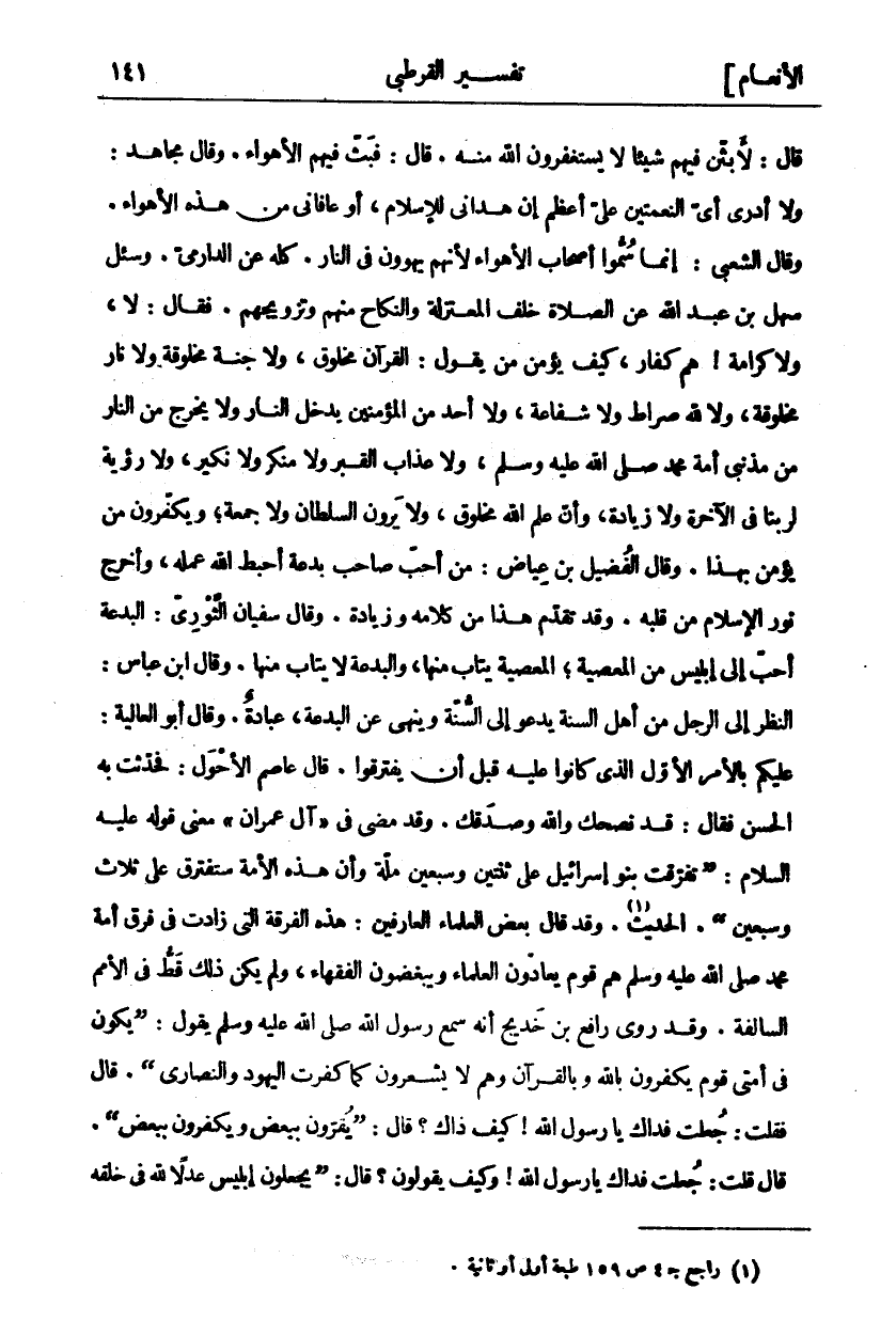 هيهات! ذلك شي قُرِنَ بِالتَّوْحِيدِ. قَالَ: لَأَبُثَّنَّ فِيهِمْ شَيْئًا لَا يَسْتَغْفِرُونَ اللَّهَ مِنْهُ. قَالَ: فَبَثَّ فِيهِمُ الْأَهْوَاءَ. وَقَالَ مُجَاهِدٌ: وَلَا أَدْرِي أَيَّ النِّعْمَتَيْنِ عَلَيَّ أَعْظَمَ أَنْ هَدَانِي لِلْإِسْلَامِ، أَوْ عَافَانِي مِنْ هَذِهِ الْأَهْوَاءِ. وَقَالَ الشَّعْبِيُّ: إِنَّمَا سُمُّوا أَصْحَابَ الْأَهْوَاءِ لِأَنَّهُمْ يَهْوُونَ فِي النَّارِ. كُلُّهُ عَنِ الدارمي. وسيل سَهْلُ بْنُ عَبْدِ اللَّهِ عَنِ الصَّلَاةِ خَلْفَ المعتزلة والنكاح منهم وتزوجهم. فَقَالَ: لَا، وَلَا كَرَامَةَ! هُمْ كُفَّارٌ «١»، كَيْفَ يُؤْمِنُ مَنْ يَقُولُ: الْقُرْآنُ مَخْلُوقٌ، وَلَا جَنَّةَ مَخْلُوقَةٌ وَلَا نَارَ مَخْلُوقَةٌ، وَلَا لِلَّهِ صِرَاطٌ وَلَا شَفَاعَةٌ، وَلَا أَحَدَ مِنَ الْمُؤْمِنِينَ يَدْخُلُ النَّارَ وَلَا يَخْرُجُ مِنَ النَّارِ مِنْ مُذْنِبِي أُمَّةِ مُحَمَّدٍ صَلَّى اللَّهُ عَلَيْهِ وَسَلَّمَ، وَلَا عَذَابَ الْقَبْرِ وَلَا مُنْكَرَ وَلَا نَكِيرَ، وَلَا رُؤْيَةَ لِرَبِّنَا فِي الْآخِرَةِ وَلَا زِيَادَةَ، وَأَنَّ عِلْمَ اللَّهِ مَخْلُوقٌ، وَلَا يَرَوْنَ السُّلْطَانَ وَلَا جُمُعَةَ، وَيُكَفِّرُونَ مَنْ يُؤْمِنُ بِهَذَا. وَقَالَ الْفُضَيْلُ بْنُ عِيَاضٍ: مَنْ أَحَبَّ صَاحِبَ بِدْعَةٍ أَحْبَطَ اللَّهُ عَمَلَهُ، وَأَخْرَجَ نُورَ الْإِسْلَامِ مِنْ قَلْبِهِ. وَقَالَ سُفْيَانُ الثَّوْرِيُّ: الْبِدْعَةُ أَحَبُّ إِلَى إِبْلِيسَ مِنَ الْمَعْصِيَةِ، الْمَعْصِيَةُ يُتَابُ مِنْهَا، وَالْبِدْعَةُ لَا يُتَابُ مِنْهَا. وَقَالَ ابْنُ عَبَّاسٍ: النَّظَرُ إِلَى الرَّجُلِ مِنْ أَهْلِ السُّنَّةِ يَدْعُو إِلَى السُّنَّةِ وَيَنْهَى عَنِ الْبِدْعَةِ، عِبَادَةٌ. وَقَالَ أَبُو الْعَالِيَةِ: عَلَيْكُمْ بِالْأَمْرِ الْأَوَّلِ الَّذِي كَانُوا عَلَيْهِ قَبْلَ أَنْ يَفْتَرِقُوا. قَالَ عَاصِمٌ الْأَحْوَلُ: فَحَدَّثْتُ بِهِ الْحَسَنَ فَقَالَ: قَدْ نَصَحَكَ وَاللَّهِ وَصَدَقَكَ. وَقَدْ مضى في" آل عمران" معنى قول عَلَيْهِ السَّلَامُ: (تَفَرَّقَتْ بَنُو إِسْرَائِيلَ عَلَى ثِنْتَيْنِ وَسَبْعِينَ فِرْقَةً وَإِنَّ هَذِهِ الْأُمَّةَ سَتَفْتَرِقُ عَلَى ثَلَاثٍ وَسَبْعِينَ). الْحَدِيثَ «٢». وَقَدْ قَالَ بَعْضُ الْعُلَمَاءِ الْعَارِفِينَ: هَذِهِ الْفِرْقَةُ الَّتِي زَادَتْ فِي فِرَقِ أُمَّةِ مُحَمَّدٍ صَلَّى اللَّهُ عَلَيْهِ وَسَلَّمَ هُمْ قَوْمٌ يُعَادُونَ الْعُلَمَاءَ وَيُبْغِضُونَ الْفُقَهَاءَ، وَلَمْ يَكُنْ ذَلِكَ قَطُّ فِي الْأُمَمِ السَّالِفَةِ. وَقَدْ رَوَى رَافِعُ بْنُ خَدِيجٍ أَنَّهُ سَمِعَ رَسُولَ اللَّهِ صَلَّى اللَّهُ عَلَيْهِ وَسَلَّمَ يَقُولُ: (يَكُونُ فِي أُمَّتِي قَوْمٌ يَكْفُرُونَ بِاللَّهِ وَبِالْقُرْآنِ وَهُمْ لَا يَشْعُرُونَ كَمَا كَفَرَتِ الْيَهُودُ وَالنَّصَارَى). قَالَ فَقُلْتُ: جُعِلْتُ فِدَاكَ يَا رَسُولَ اللَّهِ! كَيْفَ ذَاكَ؟ قَالَ: (يُقِرُّونَ بِبَعْضٍ وَيَكْفُرُونَ بِبَعْضٍ). قَالَ قُلْتُ: جُعِلْتُ فِدَاكَ يَا رَسُولَ اللَّهِ! وَكَيْفَ يَقُولُونَ؟ قَالَ: (يَجْعَلُونَ إِبْلِيسَ عَدْلًا لِلَّهِ فِي خَلْقِهِ