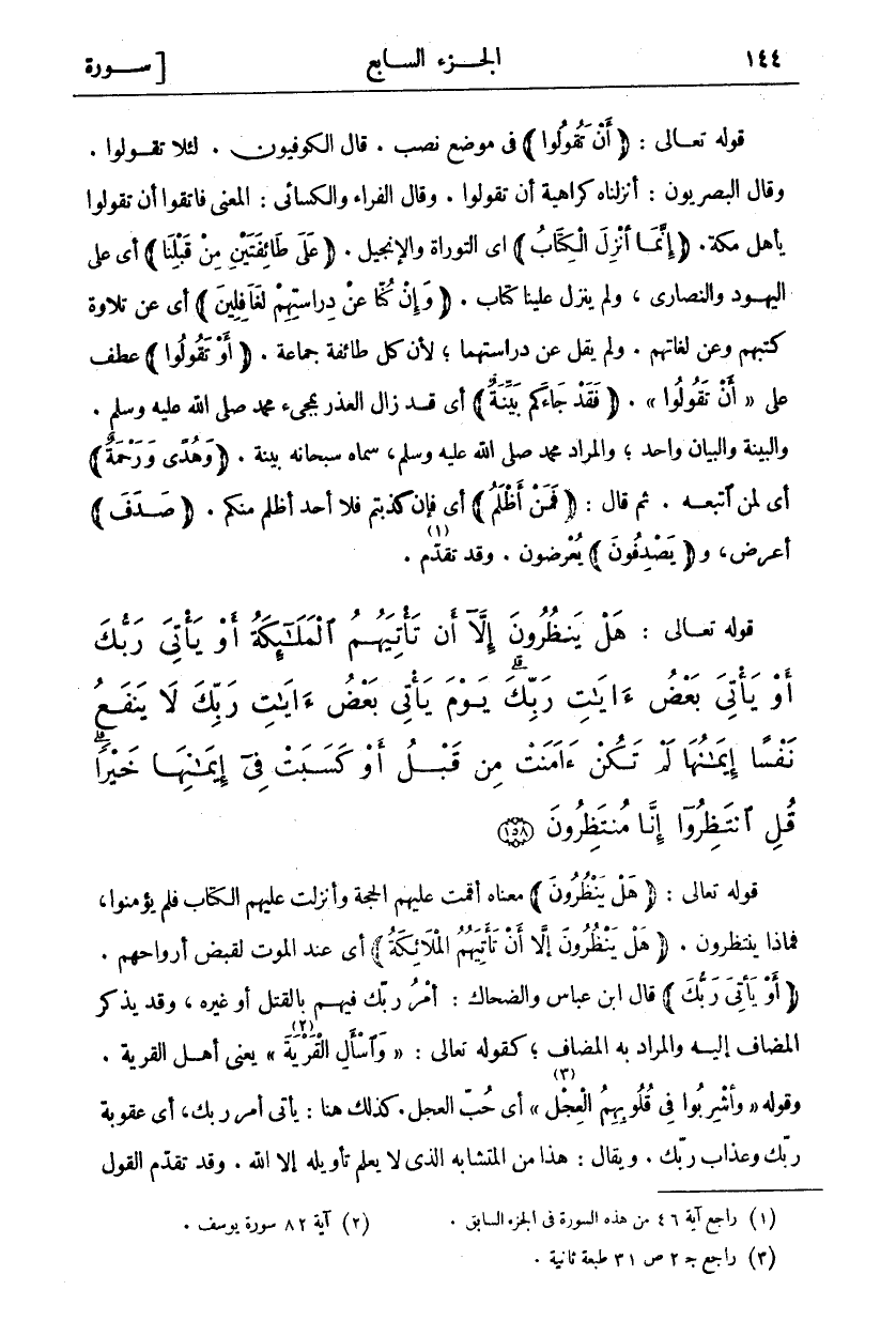 قَوْلُهُ تَعَالَى: (أَنْ تَقُولُوا) فِي مَوْضِعِ نَصْبٍ. قَالَ الْكُوفِيُّونَ. لِئَلَّا تَقُولُوا. وَقَالَ الْبَصْرِيُّونَ: أَنْزَلْنَاهُ كَرَاهِيَةَ أَنْ تَقُولُوا. وَقَالَ الْفَرَّاءُ وَالْكِسَائِيُّ: الْمَعْنَى فَاتَّقُوا أَنْ تَقُولُوا يَا أَهْلَ مَكَّةَ. (إِنَّما أُنْزِلَ الْكِتابُ) أَيِ التَّوْرَاةُ وَالْإِنْجِيلُ. (عَلى طائِفَتَيْنِ مِنْ قَبْلِنا) أَيْ عَلَى الْيَهُودِ وَالنَّصَارَى، وَلَمْ يَنْزِلْ عَلَيْنَا كِتَابٌ. (وَإِنْ كُنَّا عَنْ دِراسَتِهِمْ لَغافِلِينَ) أَيْ عَنْ تِلَاوَةِ كُتُبِهِمْ وَعَنْ لُغَاتِهِمْ. وَلَمْ يَقُلْ عَنْ دِرَاسَتِهِمَا، لِأَنَّ كُلَّ طَائِفَةٍ جماعة. (أَوْ تَقُولُوا) عُطِفَ عَلَى" أَنْ تَقُولُوا". (فَقَدْ جاءَكُمْ بَيِّنَةٌ مِنْ رَبِّكُمْ) أَيْ قَدْ زَالَ الْعُذْرُ بِمَجِيءِ مُحَمَّدٍ صَلَّى اللَّهُ عَلَيْهِ وَسَلَّمَ. وَالْبَيِّنَةُ وَالْبَيَانُ وَاحِدٌ، وَالْمُرَادُ مُحَمَّدٌ صَلَّى اللَّهُ عَلَيْهِ وَسَلَّمَ، سَمَّاهُ سُبْحَانَهُ بَيِّنَةً. (وَهُدىً وَرَحْمَةٌ) أَيْ لِمَنِ أتبعه. ثم قال: (فَمَنْ أَظْلَمُ) أَيْ فَإِنْ كَذَّبْتُمْ فَلَا أَحَدَ أَظْلَمُ مِنْكُمْ. (صَدَفَ) أعرض، يصدفون (يَصْدِفُونَ) يعرضون. وقد تقدم «١».