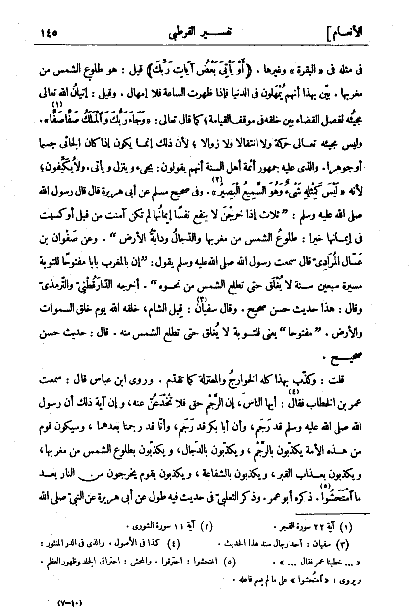 صَفًّا" وَلَيْسَ مَجِيئُهُ تَعَالَى حَرَكَةً وَلَا انْتِقَالًا وَلَا زَوَالًا، لِأَنَّ ذَلِكَ إِنَّمَا يَكُونُ إِذَا كَانَ الْجَائِي جِسْمًا أَوْ جَوْهَرًا. وَالَّذِي عَلَيْهِ جُمْهُورُ أَئِمَّةِ أَهْلِ السنة أنهم يقولون: يجئ وَيَنْزِلُ وَيَأْتِي. وَلَا يُكَيِّفُونَ، لِأَنَّهُ" لَيْسَ كَمِثْلِهِ شَيْءٌ وَهُوَ السَّمِيعُ الْبَصِيرُ «٢» " وَفِي صَحِيحِ مُسْلِمٍ عَنْ أَبِي هُرَيْرَةَ قَالَ قَالَ رَسُولُ اللَّهِ صَلَّى اللَّهُ عَلَيْهِ وَسَلَّمَ: (ثَلَاثٌ إِذَا خَرَجْنَ لَا يَنْفَعُ نَفْسًا إِيمَانُهَا لَمْ تَكُنْ آمَنَتْ مِنْ قَبْلُ أَوْ كَسَبَتْ فِي إِيمَانِهَا خَيْرًا: طُلُوعُ الشَّمْسِ مِنْ مَغْرِبِهَا وَالدَّجَّالُ وَدَابَّةُ الْأَرْضِ (. وَعَنْ صَفْوَانَ بْنِ عَسَّالٍ الْمُرَادِيِّ قَالَ سَمِعْتُ رَسُولَ اللَّهِ صَلَّى اللَّهُ عَلَيْهِ وَسَلَّمَ يقول:) إن بالمغرب باب مَفْتُوحًا لِلتَّوْبَةِ مَسِيرَةَ سَبْعِينَ سَنَةً لَا يُغْلَقُ حَتَّى تَطْلُعَ الشَّمْسُ مِنْ نَحْوِهِ (. أَخْرَجَهُ الدَّارَقُطْنِيُّ وَالدَّارِمِيُّ «٣» وَالتِّرْمِذِيُّ وَقَالَ: هَذَا حَدِيثٌ حَسَنٌ صَحِيحٌ. وَقَالَ سُفْيَانُ «٤»: قِبَلَ الشَّامِ، خَلَقَهُ اللَّهُ يَوْمَ خَلَقَ السَّمَاوَاتِ وَالْأَرْضَ.) مَفْتُوحًا) يَعْنِي لِلتَّوْبَةِ لَا يُغْلَقُ حَتَّى تَطْلُعَ الشَّمْسُ مِنْهُ. قَالَ: حَدِيثٌ حَسَنٌ صَحِيحٌ. قُلْتُ: وَكَذَّبَ بِهَذَا كُلِّهِ الْخَوَارِجُ «٥» وَالْمُعْتَزِلَةُ كَمَا تَقَدَّمَ. وَرَوَى ابْنُ عَبَّاسٍ قَالَ: سَمِعْتُ عُمَرَ بْنَ الْخَطَّابِ فَقَالَ «٦»: أَيُّهَا النَّاسُ، إِنَّ الرَّجْمَ حَقٌّ فَلَا تُخْدَعُنَّ عَنْهُ، وَإِنَّ آيَةَ ذَلِكَ أَنَّ رَسُولَ اللَّهِ صَلَّى اللَّهُ عَلَيْهِ وَسَلَّمَ قَدْ رَجَمَ، وَأَنَّ أَبَا بَكْرٍ قَدْ رَجَمَ وَأَنَّا قَدْ رَجَمْنَا بَعْدَهُمَا، وَسَيَكُونُ قَوْمٌ مِنْ هَذِهِ الْأُمَّةِ يُكَذِّبُونَ بِالرَّجْمِ، وَيُكَذِّبُونَ بِالدَّجَّالِ، وَيُكَذِّبُونَ بِطُلُوعِ الشَّمْسِ مِنْ مَغْرِبِهَا، وَيُكَذِّبُونَ بِعَذَابِ الْقَبْرِ، وَيُكَذِّبُونَ بِالشَّفَاعَةِ، وَيُكَذِّبُونَ بِقَوْمٍ يَخْرُجُونَ من النار بعد ما امتحشوا «٧». ذكر أَبُو عُمَرَ. وَذَكَرَ الثَّعْلَبِيُّ فِي حَدِيثٍ فِيهِ طُولٌ عَنْ أَبِي هُرَيْرَةَ عَنِ النَّبِيِّ صَلَّى اللَّهُ