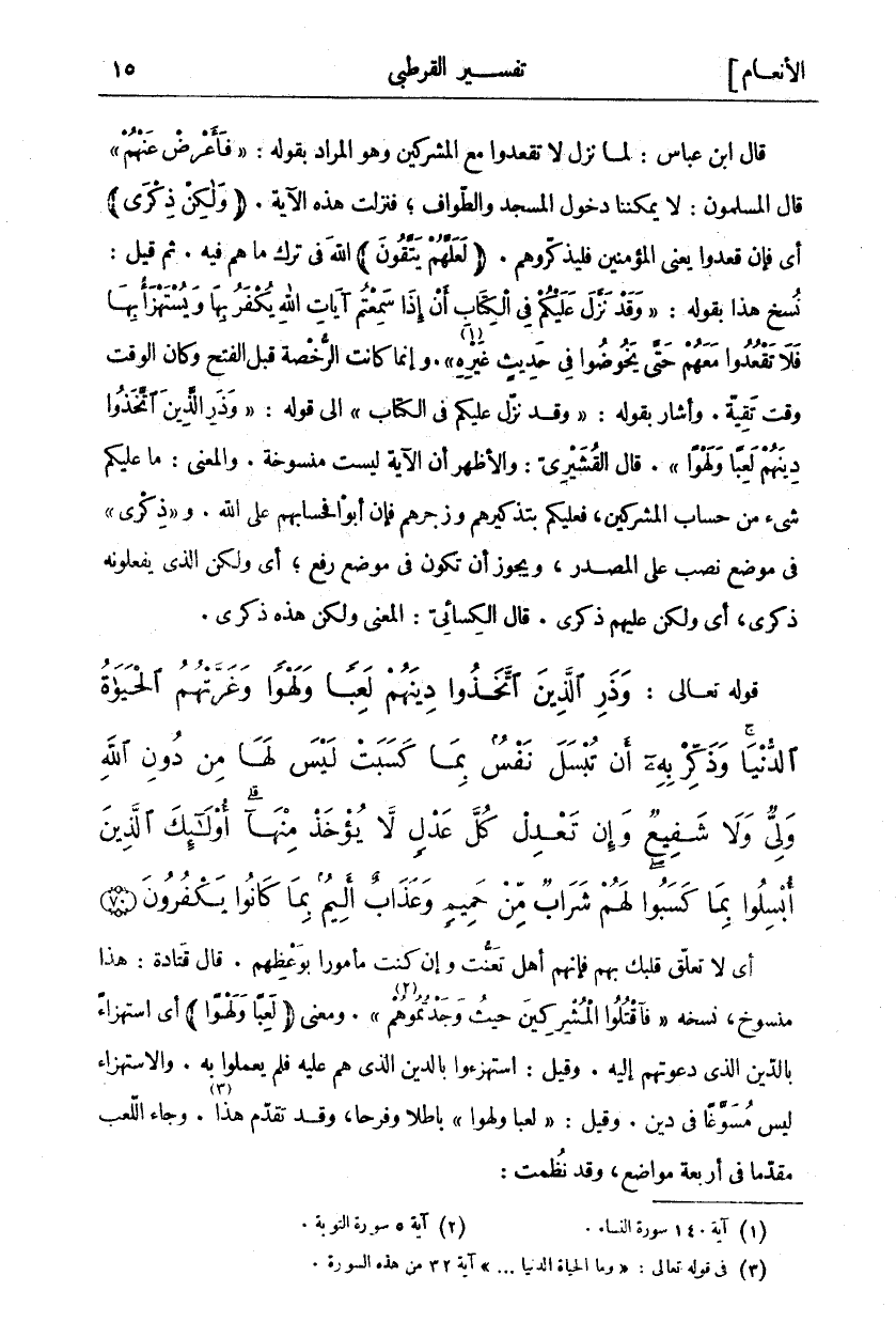 أَيْ لَا تُعَلِّقْ قَلْبَكَ بهم فإنهم أهل تعنت إن كُنْتَ مَأْمُورًا بِوَعْظِهِمْ. قَالَ قَتَادَةُ: هَذَا مَنْسُوخٌ، نَسَخَهُ" فَاقْتُلُوا الْمُشْرِكِينَ حَيْثُ وَجَدْتُمُوهُمْ" «٢». وَمَعْنَى" لَعِباً وَلَهْواً" أَيِ اسْتِهْزَاءً بِالدِّينِ الَّذِي دَعَوْتَهُمْ إِلَيْهِ. وَقِيلَ: اسْتَهْزَءُوا بِالدِّينِ الَّذِي هُمْ عَلَيْهِ فَلَمْ يَعْمَلُوا بِهِ. وَالِاسْتِهْزَاءُ لَيْسَ مُسَوَّغًا فِي دِينٍ. وَقِيلَ:" لَعِباً وَلَهْواً" بَاطِلًا وَفَرَحًا، وَقَدْ تَقَدَّمَ «٣» هَذَا. وَجَاءَ اللَّعِبُ مُقَدَّمًا فِي أَرْبَعَةِ مَوَاضِعَ، وقد نظمت.