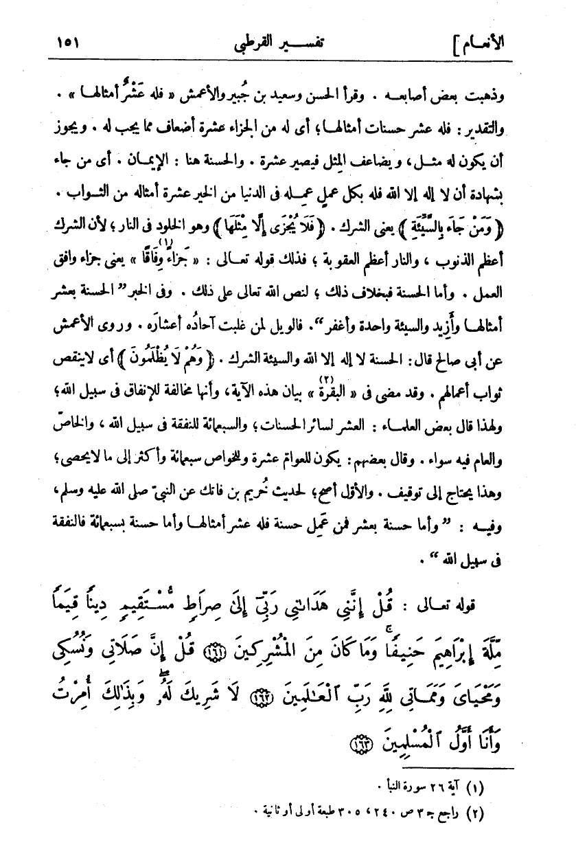 قُلْ إِنَّنِي هَدانِي رَبِّي إِلى صِراطٍ مُسْتَقِيمٍ دِيناً قِيَماً مِلَّةَ إِبْراهِيمَ حَنِيفاً وَما كانَ مِنَ الْمُشْرِكِينَ (١٦١) قُلْ إِنَّ صَلاتِي وَنُسُكِي وَمَحْيايَ وَمَماتِي لِلَّهِ رَبِّ الْعالَمِينَ (١٦٢) لَا شَرِيكَ لَهُ وَبِذلِكَ أُمِرْتُ وَأَنَا أَوَّلُ الْمُسْلِمِينَ (١٦٣)
