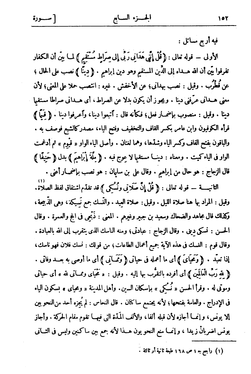 فِيهِ أَرْبَعُ مَسَائِلَ: الْأُولَى- قَوْلُهُ تَعَالَى: (قُلْ إِنَّنِي هَدانِي رَبِّي إِلى صِراطٍ مُسْتَقِيمٍ) لَمَّا بَيَّنَ تَعَالَى أَنَّ الْكُفَّارَ تَفَرَّقُوا بَيَّنَ أَنَّ اللَّهَ هَدَاهُ إِلَى الدِّينِ الْمُسْتَقِيمِ وَهُوَ دِينُ إِبْرَاهِيمَ (دِيناً) نُصِبَ عَلَى الْحَالِ، عَنْ قُطْرُبٍ. وَقِيلَ: نُصِبَ بِ" هَدانِي" عَنِ الْأَخْفَشِ. (قَالَ «١») غَيْرُهُ: انْتُصِبَ حَمْلًا عَلَى الْمَعْنَى، لِأَنَّ مَعْنَى هَدَانِي عَرَّفَنِي دِينًا. وَيَجُوزُ أَنْ يَكُونَ بَدَلًا مِنَ الصِّرَاطِ، أَيْ هَدَانِي صِرَاطًا مُسْتَقِيمًا دِينًا. وَقِيلَ: مَنْصُوبٌ بِإِضْمَارِ فِعْلٍ، فَكَأَنَّهُ قَالَ: اتَّبِعُوا دِينًا، وَاعْرَفُوا دِينًا. (قِيَمًا) قَرَأَهُ الْكُوفِيُّونَ وَابْنُ عَامِرٍ «٢» بِكَسْرِ الْقَافِ وَالتَّخْفِيفِ وَفَتْحِ الْيَاءِ، مَصْدَرٌ كَالشِّبَعِ فَوُصِفَ بِهِ. وَالْبَاقُونَ بِفَتْحِ الْقَافِ وَكَسْرِ الْيَاءِ وَشَدِّهَا، وَهُمَا لُغَتَانِ. وَأَصْلُ الْيَاءِ الْوَاوُ" قَيُّومٌ" ثُمَّ أُدْغِمَتِ الْوَاوُ فِي الْيَاءِ كَمَيِّتٍ. وَمَعْنَاهُ دِينًا مُسْتَقِيمًا لَا عِوَجَ فِيهِ (مِلَّةَ إِبْراهِيمَ) بَدَلَ (حَنِيفاً) قَالَ الزَّجَّاجُ: هُوَ حَالٌ مِنْ إِبْرَاهِيمَ. وَقَالَ عَلِيُّ بْنُ سُلَيْمَانَ: هُوَ نَصْبٌ بِإِضْمَارِ أَعْنِي. الثَّانِيَةُ- قَوْلُهُ تَعَالَى: (قُلْ إِنَّ صَلاتِي وَنُسُكِي) قَدْ تَقَدَّمَ اشْتِقَاقُ لَفْظِ الصَّلَاةِ «٣». وَقِيلَ: الْمُرَادُ بِهَا هُنَا صَلَاةُ اللَّيْلِ. وَقِيلَ: صَلَاةُ الْعِيدِ. وَالنُّسُكُ جَمْعُ نَسِيكَةٍ، وَهِيَ الذَّبِيحَةُ، وَكَذَلِكَ قَالَ مُجَاهِدٌ وَالضَّحَّاكُ وَسَعِيدُ بْنُ جُبَيْرٍ وَغَيْرُهُمْ. وَالْمَعْنَى: ذَبْحِي فِي الْحَجِّ وَالْعُمْرَةِ. وَقَالَ الْحَسَنُ: نُسُكِي دِينِيٌّ. وَقَالَ الزَّجَّاجُ: عِبَادَتِي، وَمِنْهُ النَّاسِكُ الَّذِي يَتَقَرَّبُ إِلَى اللَّهِ بِالْعِبَادَةِ. وَقَالَ قَوْمٌ: النُّسُكُ فِي هَذِهِ الْآيَةِ جَمِيعُ أَعْمَالِ (الْبِرِّ «٤») وَالطَّاعَاتِ، مِنْ قَوْلِكَ نَسَكَ فُلَانٌ فهو ناسك، إذا تعبد. (وَمَحْيايَ) شأي مَا أَعْمَلُهُ فِي حَيَاتِي (وَمَماتِي) أَيْ مَا أُوصِي بِهِ بَعْدَ وَفَاتِي. لِلَّهِ رَبِّ الْعَالَمِينَ أَيْ أُفْرِدُهُ بِالتَّقَرُّبِ بِهَا إِلَيْهِ. وَقِيلَ:" وَمَحْيايَ وَمَماتِي لِلَّهِ" أَيْ حَيَاتِي وَمَوْتِي لَهُ. وَقَرَأَ الْحَسَنُ:" نُسْكِي" بِإِسْكَانِ السِّينِ. وَأَهْلُ الْمَدِينَةِ" وَمَحْيَايْ" بِسُكُونِ الْيَاءِ فِي الْإِدْرَاجِ. وَالْعَامَّةُ بِفَتْحِهَا، لِأَنَّهُ يَجْتَمِعُ سَاكِنَانِ. قَالَ النَّحَّاسُ: لَمْ يُجِزْهُ أَحَدٌ مِنَ النَّحْوِيِّينَ إِلَّا يُونُسُ، وَإِنَّمَا أَجَازَهُ لِأَنَّ قَبْلَهُ أَلِفًا، وَالْأَلِفُ الْمَدَّةُ الَّتِي فِيهَا تَقُومُ مَقَامَ الْحَرَكَةِ. وَأَجَازَ يُونُسُ اضْرِبَانِ زَيْدًا، وَإِنَّمَا مَنَعَ النَّحْوِيُّونَ هَذَا لِأَنَّهُ جَمَعَ بَيْنَ سَاكِنَيْنِ وليس في الثاني