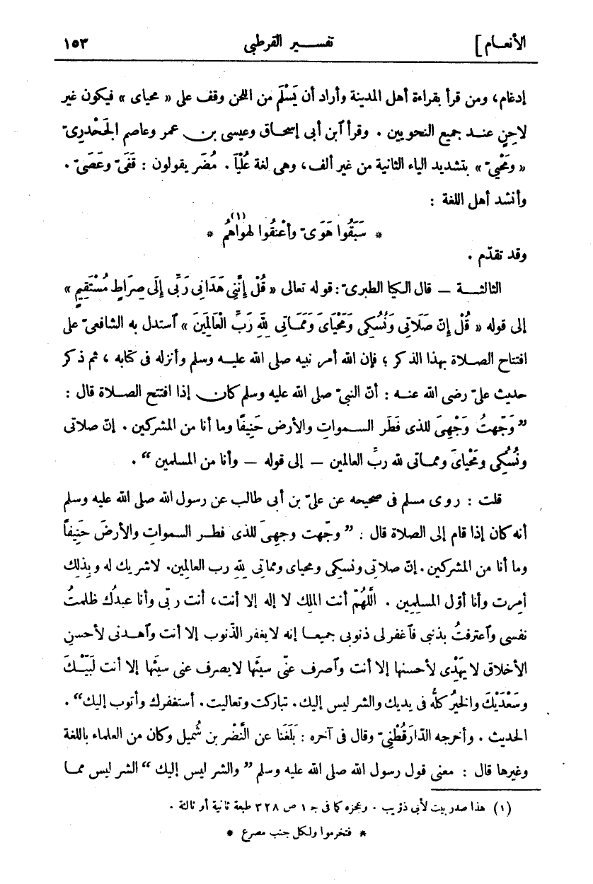 وقد تقدم. الثانية- قَالَ إِلْكِيَا الطَّبَرِيُّ: قَوْلُهُ تَعَالَى:" قُلْ إِنَّنِي هَدانِي رَبِّي إِلى صِراطٍ مُسْتَقِيمٍ" إِلَى قَوْلِهِ:" قُلْ إِنَّ صَلاتِي وَنُسُكِي وَمَحْيايَ وَمَماتِي لِلَّهِ رَبِّ الْعالَمِينَ" اسْتَدَلَّ بِهِ الشَّافِعِيُّ عَلَى افْتِتَاحِ الصَّلَاةِ بِهَذَا الذِّكْرِ، فَإِنَّ اللَّهَ أَمَرَ نَبِيَّهُ صَلَّى اللَّهُ عَلَيْهِ وَسَلَّمَ وأنزل فِي كِتَابِهِ، ثُمَّ ذَكَرَ حَدِيثَ عَلِيٍّ رَضِيَ اللَّهُ عَنْهُ: أَنَّ النَّبِيَّ صَلَّى اللَّهُ عَلَيْهِ وَسَلَّمَ كَانَ إِذَا افْتَتَحَ الصَّلَاةَ قَالَ:" وَجَّهْتُ وَجْهِيَ لِلَّذِي فَطَرَ السَّمَاوَاتِ وَالْأَرْضَ حَنِيفًا وَمَا أَنَا مِنَ الْمُشْرِكِينَ."" إِنَّ صَلاتِي وَنُسُكِي وَمَحْيايَ وَمَماتِي لِلَّهِ رَبِّ الْعالَمِينَ"- إِلَى قَوْلِهِ-" وَأَنَا مِنَ الْمُسْلِمِينَ" (. قُلْتُ: رَوَى مُسْلِمٌ فِي صَحِيحِهِ عَنْ عَلِيِّ بْنِ أَبِي طَالِبٍ عَنْ رَسُولِ اللَّهِ صَلَّى اللَّهُ عَلَيْهِ وَسَلَّمَ أَنَّهُ كَانَ إِذَا قَامَ إِلَى الصَّلَاةِ قَالَ:) وَجَّهْتُ وَجْهِيَ لِلَّذِي فَطَرَ السَّمَاوَاتِ وَالْأَرْضَ حَنِيفًا وَمَا أَنَا مِنَ الْمُشْرِكِينَ. إِنَّ صَلَاتِي وَنُسُكِي وَمَحْيَايَ وَمَمَاتِي لِلَّهِ رَبِّ الْعَالَمِينَ لَا شَرِيكَ لَهُ وَبِذَلِكَ أُمِرْتُ وَأَنَا أَوَّلُ الْمُسْلِمِينَ. اللَّهُمَّ أَنْتَ الْمَلِكُ لَا إِلَهَ إِلَّا أَنْتَ، أَنْتَ رَبِّي وَأَنَا عَبْدُكَ ظَلَمْتُ نَفْسِي وَاعْتَرَفْتُ بِذَنْبِي فَاغْفِرْ لِي ذُنُوبِي جَمِيعًا إِنَّهُ لَا يَغْفِرُ الذُّنُوبَ إِلَّا أَنْتَ وَاهْدِنِي لِأَحْسَنِ الْأَخْلَاقِ لَا يَهْدِي لِأَحْسَنِهَا إِلَّا أَنْتَ وَاصْرِفْ عَنِّي سَيِّئَهَا لَا يَصْرِفُ عَنِّي سَيِّئَهَا إِلَّا أَنْتَ لَبَّيْكَ وَسَعْدَيْكَ وَالْخَيْرُ كُلُّهُ فِي يَدَيْكَ وَالشَّرُّ لَيْسَ إِلَيْكَ. تَبَارَكْتَ وَتَعَالَيْتَ. أَسْتَغْفِرُكَ وَأَتُوبُ إِلَيْكَ (. الْحَدِيثَ. وَأَخْرَجَهُ الدَّارَقُطْنِيُّ وَقَالَ فِي آخِرِهِ: بَلَغَنَا عَنِ النَّضْرِ بْنِ شُمَيْلٍ وَكَانَ مِنَ الْعُلَمَاءِ بِاللُّغَةِ وَغَيْرِهَا قَالَ: مَعْنَى قَوْلِ رَسُولِ اللَّهِ صَلَّى اللَّهُ عَلَيْهِ وَسَلَّمَ (وَالشَّرُّ لَيْسَ إِلَيْكَ) الشَّرُّ لَيْسَ مِمَّا