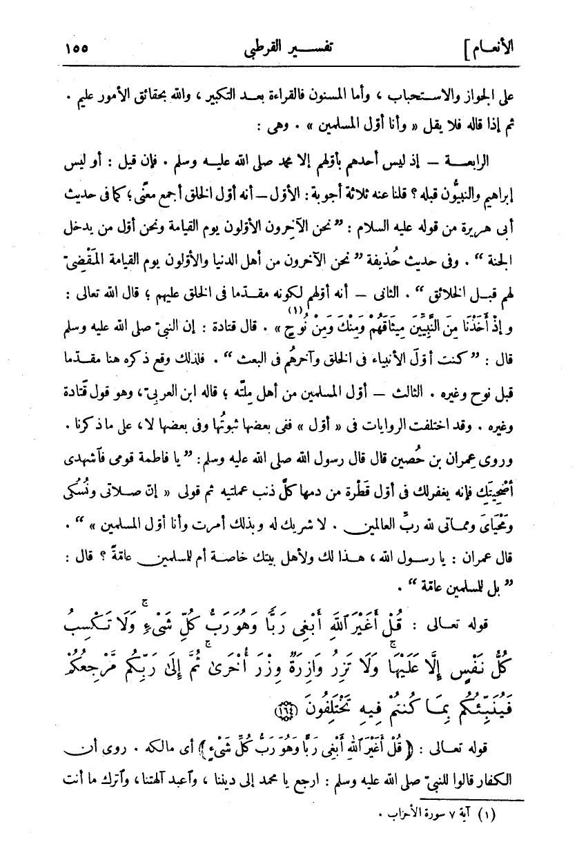 عَلَى الْجَوَازِ وَالِاسْتِحْبَابِ، وَأَمَّا الْمَسْنُونُ فَالْقِرَاءَةُ بَعْدَ التَّكْبِيرِ، وَاللَّهُ بِحَقَائِقِ الْأُمُورِ عَلِيمٌ. ثُمَّ إِذَا قال فَلَا يَقُلْ:" وَأَنَا أَوَّلُ الْمُسْلِمِينَ". وَهِيَ: الرَّابِعَةُ- إِذْ لَيْسَ أَحَدُهُمْ بِأَوَّلِهِمْ إِلَّا مُحَمَّدًا صَلَّى اللَّهُ عَلَيْهِ وَسَلَّمَ. فإن قيل: أو ليس إِبْرَاهِيمُ وَالنَّبِيُّونَ قَبْلَهُ؟ قُلْنَا عَنْهُ ثَلَاثَةَ أَجْوِبَةٍ: الْأَوَّلُ: أَنَّهُ أَوَّلُ الْخَلْقِ أَجْمَعُ مَعْنًى، كَمَا فِي حَدِيثِ أَبِي هُرَيْرَةَ مِنْ قَوْلِهِ عَلَيْهِ السَّلَامُ: (نَحْنُ الْآخِرُونَ الْأَوَّلُونَ يَوْمَ الْقِيَامَةِ وَنَحْنُ أَوَّلُ مَنْ يَدْخُلُ الْجَنَّةَ). وَفِي حَدِيثِ حُذَيْفَةَ (نَحْنُ الْآخِرُونَ مِنْ أَهْلِ الدُّنْيَا وَالْأَوَّلُونَ يَوْمَ الْقِيَامَةِ الْمَقْضِيُّ لَهُمْ قَبْلَ الْخَلَائِقِ) الثَّانِي: أَنَّهُ أَوَّلُهُمْ لِكَوْنِهِ مُقَدَّمًا فِي الْخَلْقِ عَلَيْهِمْ، قَالَ اللَّهُ تَعَالَى:" وَإِذْ أَخَذْنا مِنَ النَّبِيِّينَ مِيثاقَهُمْ وَمِنْكَ وَمِنْ نُوحٍ «١» ". قَالَ قَتَادَةَ: أَنَّ النَّبِيَّ صَلَّى اللَّهُ عَلَيْهِ وَسَلَّمَ قَالَ: (كُنْتُ أَوَّلَ الْأَنْبِيَاءِ فِي الْخَلْقِ وَآخِرَهُمْ فِي الْبَعْثِ «٢». فَلِذَلِكَ وَقَعَ ذِكْرُهُ هُنَا مُقَدَّمًا قَبْلَ نُوحٍ وَغَيْرِهِ. الثالث: أول المسلمين من أهل ملته، قال ابْنُ الْعَرَبِيِّ وَهُوَ قَوْلُ قَتَادَةَ وَغَيْرِهِ. وَاخْتَلَفَتِ الرِّوَايَاتُ فِي" أَوَّلُ" فَفِي بَعْضِهَا ثُبُوتُهَا وَفِي بَعْضِهَا لَا، عَلَى مَا ذَكَرْنَا. وَرَوَى عِمْرَانُ بْنُ حُصَيْنٍ قَالَ قَالَ رَسُولُ اللَّهِ صَلَّى اللَّهُ عَلَيْهِ وَسَلَّمَ: (يَا فَاطِمَةُ قُومِي فَاشْهَدِي أُضْحِيَّتِكِ فَإِنَّهُ يُغْفَرُ لَكِ فِي أَوَّلِ قَطْرَةٍ مِنْ دَمِهَا كُلُّ ذَنْبٍ عَمِلْتِيهِ ثُمَّ قَوْلِي:" إِنَّ صَلاتِي وَنُسُكِي وَمَحْيايَ وَمَماتِي لِلَّهِ رَبِّ الْعالَمِينَ. لَا شَرِيكَ لَهُ وَبِذلِكَ أُمِرْتُ وَأَنَا أَوَّلُ الْمُسْلِمِينَ". قَالَ عِمْرَانُ: يَا رَسُولَ اللَّهِ، هَذَا لَكَ وَلِأَهْلِ بَيْتِكَ خَاصَّةً أَمْ لِلْمُسْلِمِينَ عَامَّةً؟ قَالَ: (بَلْ لِلْمُسْلِمِينَ عامة).
