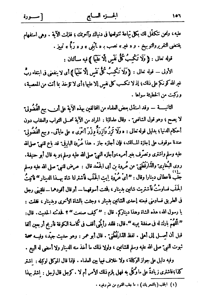 عَلَيْهِ، وَنَحْنُ نَتَكَفَّلُ لَكَ بِكُلِّ تِبَاعَةٍ تَتَوَقَّعُهَا فِي دُنْيَاكَ وَآخِرَتِكَ، فَنَزَلَتِ الْآيَةُ. وَهِيَ اسْتِفْهَامٌ يَقْتَضِي التَّقْرِيرَ وَالتَّوْبِيخَ. وَ" غَيْرَ" نُصِبَ" بِ" أَبْغِي" وَ" رَبًّا" تَمْيِيزٌ. قَوْلُهُ تَعَالَى: (وَلا تَكْسِبُ كُلُّ نَفْسٍ إِلَّا عَلَيْها) فِيهِ مَسْأَلَتَانِ: الْأُولَى: قَوْلُهُ تَعَالَى:" وَلا تَكْسِبُ كُلُّ نَفْسٍ إِلَّا عَلَيْها" أَيْ لَا يَنْفَعُنِي فِي ابْتِغَاءِ رب غير الله كونكم على ذلك، إلا تَكْسِبُ كُلُّ نَفْسٍ إِلَّا عَلَيْهَا، أَيْ لَا يُؤْخَذُ بِمَا أَتَتْ مِنَ الْمَعْصِيَةِ، وَرَكِبَتْ مِنَ الْخَطِيئَةِ سِوَاهَا. الثَّانِيَةُ: وَقَدِ اسْتَدَلَّ بَعْضُ الْعُلَمَاءِ مِنَ الْمُخَالِفِينَ بِهَذِهِ الْآيَةِ عَلَى أَنَّ بَيْعَ الْفُضُولِيِّ لَا يَصِحُّ، وَهُوَ قَوْلُ الشَّافِعِيِّ. وَقَالَ عُلَمَاؤُنَا: الْمُرَادُ مِنَ الْآيَةِ تَحَمُّلُ الثَّوَابِ وَالْعِقَابِ دون أحكام الدنيا، بدليل قول تَعَالَى:" وَلا تَزِرُ وازِرَةٌ وِزْرَ أُخْرى " عَلَى مَا يَأْتِي. وَبَيْعُ الْفُضُولِيِّ عِنْدَنَا مَوْقُوفٌ عَلَى إِجَازَةِ الْمَالِكِ، فَإِنْ أَجَازَهُ جَازَ. هَذَا عُرْوَةُ الْبَارِقِيُّ قَدْ بَاعَ لِلنَّبِيِّ صَلَّى اللَّهُ عَلَيْهِ وَسَلَّمَ وَاشْتَرَى وَتَصَرَّفَ بِغَيْرِ أَمْرِهِ، فَأَجَازَهُ النَّبِيُّ صَلَّى اللَّهُ عَلَيْهِ وَسَلَّمَ، وَبِهِ قَالَ أَبُو حَنِيفَةَ. وَرَوَى الْبُخَارِيُّ وَالدَّارَقُطْنِيُّ عَنْ عُرْوَةَ بْنِ أَبِي الْجَعْدِ قَالَ: عُرِضَ لِلنَّبِيِّ صَلَّى اللَّهُ عَلَيْهِ وَسَلَّمَ جَلَبٌ «١» فَأَعْطَانِي دِينَارًا وَقَالَ: (أَيْ عُرْوَةُ ايتِ الْجَلَبَ فَاشْتَرِ لَنَا شَاةً بِهَذَا الدِّينَارِ) فَأَتَيْتُ الْجَلَبَ فَسَاوَمْتُ فَاشْتَرَيْتُ شَاتَيْنِ بِدِينَارٍ، فَجِئْتُ أَسُوقُهُمَا- أَوْ قَالَ أَقُودُهُمَا- فَلَقِيَنِي رَجُلٌ فِي الطَّرِيقِ فَسَاوَمَنِي فَبِعْتُهُ إِحْدَى الشَّاتَيْنِ بِدِينَارٍ، وَجِئْتُ بِالشَّاةِ الْأُخْرَى وَبِدِينَارٍ، فَقُلْتُ: يَا رَسُولَ اللَّهِ، هَذِهِ الشَّاةُ وَهَذَا دِينَارُكُمْ. قَالَ: (كَيْفَ صَنَعْتَ)؟ فَحَدَّثْتُهُ الْحَدِيثَ. قَالَ: (اللَّهُمَّ بَارِكْ لَهُ فِي صَفْقَةِ يَمِينِهِ). قَالَ: فَلَقَدْ رَأَيْتُنِي أَقِفُ فِي كُنَاسَةِ «٢» الْكُوفَةِ فَأَرْبَحُ أَرْبَعِينَ أَلْفًا قَبْلَ أَنْ أَصِلَ إِلَى أَهْلِي. لَفْظُ الدَّارَقُطْنِيِّ. قَالَ أَبُو عُمَرَ: وَهُوَ حَدِيثٌ جَيِّدٌ، وَفِيهِ «٣» صِحَّةُ ثُبُوتِ النَّبِيِّ صَلَّى اللَّهُ عَلَيْهِ وَسَلَّمَ لِلشَّاتَيْنِ «٤»، وَلَوْلَا ذَلِكَ مَا أَخَذَ مِنْهُ الدِّينَارَ وَلَا أَمْضَى لَهُ الْبَيْعَ. وَفِيهِ دَلِيلٌ عَلَى جَوَازِ الْوَكَالَةِ، وَلَا خِلَافَ فِيهَا بَيْنَ الْعُلَمَاءِ. فَإِذَا قال الموكل لو كيله: اشْتَرِ كَذَا، فَاشْتَرَى زِيَادَةً عَلَى مَا وُكِّلَ بِهِ فَهَلْ يَلْزَمُ ذَلِكَ الْأَمْرُ أَمْ لَا؟. كرجل قال لرجل: أشتر بهذا