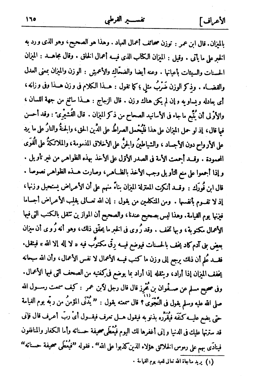 بِالْمِيزَانِ. قَالَ ابْنُ عُمَرَ: تُوزَنُ صَحَائِفُ أَعْمَالِ الْعِبَادِ. وَهَذَا هُوَ الصَّحِيحُ، وَهُوَ الَّذِي وَرَدَ بِهِ الْخَبَرُ عَلَى مَا يَأْتِي. وَقِيلَ: الْمِيزَانُ الْكِتَابُ الَّذِي فِيهِ أَعْمَالُ الْخَلْقِ. وَقَالَ مُجَاهِدٌ: الْمِيزَانُ الْحَسَنَاتُ وَالسَّيِّئَاتُ بِأَعْيَانِهَا. وَعَنْهُ أَيْضًا وَالضَّحَّاكِ وَالْأَعْمَشِ: الْوَزْنُ وَالْمِيزَانُ بِمَعْنَى الْعَدْلِ وَالْقَضَاءِ، وَذِكْرُ الْوَزْنِ ضَرْبُ مَثَلٍ، كَمَا تَقُولُ: هَذَا الْكَلَامُ فِي وَزْنِ هَذَا وَفِي وِزَانِهِ، أَيْ يُعَادِلُهُ وَيُسَاوِيهِ وَإِنْ لَمْ يَكُنْ هُنَاكَ وَزْنٌ. قَالَ الزَّجَّاجُ: هَذَا سَائِغٌ مِنْ جِهَةِ اللِّسَانِ، وَالْأَوْلَى أَنْ يُتَّبَعَ مَا جَاءَ فِي الْأَسَانِيدِ الصِّحَاحِ مِنْ ذِكْرِ الْمِيزَانِ. قَالَ الْقُشَيْرِيُّ: وَقَدْ أَحْسَنَ فِيمَا قَالَ، إِذْ لَوْ حُمِلَ الْمِيزَانُ عَلَى هذا فليحمل الصراط على الذين الْحَقِّ، وَالْجَنَّةُ وَالنَّارُ عَلَى مَا يَرِدُ عَلَى الْأَرْوَاحِ دُونَ الْأَجْسَادِ، وَالشَّيَاطِينُ وَالْجِنُّ عَلَى الْأَخْلَاقِ الْمَذْمُومَةِ، وَالْمَلَائِكَةُ عَلَى الْقُوَى الْمَحْمُودَةِ. وَقَدْ أَجْمَعَتِ الْأُمَّةُ فِي الصَّدْرِ الْأَوَّلِ عَلَى الْأَخْذِ بِهَذِهِ الظَّوَاهِرِ مِنْ غَيْرِ تَأْوِيلٍ. وَإِذَا أَجْمَعُوا عَلَى مَنْعِ التَّأْوِيلِ وَجَبَ الْأَخْذُ بِالظَّاهِرِ، وَصَارَتْ هَذِهِ الظَّوَاهِرُ نُصُوصًا. قَالَ ابْنُ فُورَكَ: وَقَدْ أَنْكَرَتِ الْمُعْتَزِلَةُ «١» الْمِيزَانَ بِنَاءً مِنْهُمْ عَلَى أَنَّ الْأَعْرَاضَ يَسْتَحِيلُ وَزْنُهَا، إِذْ لَا تَقُومُ بِأَنْفُسِهَا. وَمِنَ الْمُتَكَلِّمِينَ مَنْ يَقُولُ: إِنَّ اللَّهَ تَعَالَى يَقْلِبُ الْأَعْرَاضَ أَجْسَامًا فَيَزِنُهَا يَوْمَ الْقِيَامَةِ. وَهَذَا لَيْسَ بِصَحِيحٍ عِنْدَنَا، وَالصَّحِيحُ أَنَّ الْمَوَازِينَ تَثْقُلُ بِالْكُتُبِ الَّتِي فِيهَا الْأَعْمَالُ مَكْتُوبَةٌ، وَبِهَا تَخِفُّ. وَقَدْ رُوِيَ فِي الْخَبَرِ مَا يُحَقِّقُ ذَلِكَ، وَهُوَ أَنَّهُ رُوِيَ (أَنَّ مِيزَانَ بَعْضِ بَنِي آدَمَ كَادَ يَخِفُّ بِالْحَسَنَاتِ فَيُوضَعُ فِيهِ رَقٌّ مَكْتُوبٌ فِيهِ" لَا إِلَهَ إِلَّا اللَّهُ" فَيَثْقُلُ). فَقَدْ علم أن لك يَرْجِعُ إِلَى وَزْنِ مَا كُتِبَ فِيهِ الْأَعْمَالُ لَا نَفْسَ الْأَعْمَالِ، وَأَنَّ اللَّهَ سُبْحَانَهُ يُخَفِّفُ الْمِيزَانَ إِذَا أَرَادَ، وَيُثَقِّلُهُ إِذَا أَرَادَ بِمَا يُوضَعُ فِي كِفَّتَيْهِ مِنَ الصُّحُفِ الَّتِي فِيهَا الْأَعْمَالُ. وَفِي صَحِيحِ مُسْلِمٍ عَنْ صَفْوَانَ بْنِ مُحْرِزٍ قَالَ قَالَ رَجُلٌ لِابْنِ عُمَرَ: كَيْفَ سَمِعْتُ رَسُولَ اللَّهِ صَلَّى اللَّهُ عَلَيْهِ وَسَلَّمَ فِي النَّجْوَى «٢»؟ قَالَ سَمِعْتُهُ يَقُولُ: (يُدْنَى الْمُؤْمِنُ مِنْ رَبِّهِ يَوْمَ الْقِيَامَةِ حَتَّى يَضَعَ عَلَيْهِ كَنَفَهُ فَيُقْرِرُهُ بِذُنُوبِهِ فَيَقُولُ هَلْ تَعْرِفُ فَيَقُولُ أَيْ رَبِّ أَعْرِفُ قَالَ فَإِنِّي قَدْ سَتَرْتُهَا عَلَيْكَ فِي الدُّنْيَا وَإِنِّي أَغْفِرُهَا لَكَ الْيَوْمَ فَيُعْطَى صَحِيفَةَ حَسَنَاتِهِ وَأَمَّا الْكُفَّارُ وَالْمُنَافِقُونَ فَيُنَادَى بِهِمْ عَلَى رُءُوسِ الْخَلَائِقِ هَؤُلَاءِ الَّذِينَ كَذَبُوا على الله (. فقوله:) فيعطى صحيفة حسناته)