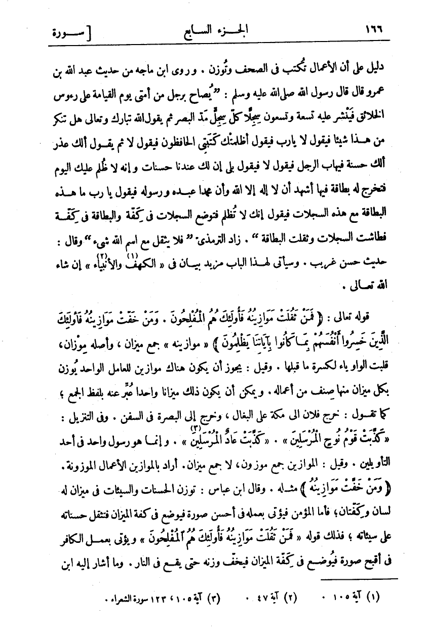 دَلِيلٌ عَلَى أَنَّ الْأَعْمَالَ تُكْتَبُ فِي الصُّحُفِ وَتُوزَنُ. وَرَوَى ابْنُ مَاجَهْ مِنْ حَدِيثِ عَبْدِ اللَّهِ بْنِ عَمْرٍو قَالَ قَالَ رَسُولُ اللَّهِ صَلَّى اللَّهُ عَلَيْهِ وَسَلَّمَ: (يُصَاحُ بِرَجُلٍ مِنْ أُمَّتِي يَوْمَ الْقِيَامَةِ عَلَى رُءُوسِ الْخَلَائِقِ فَيُنْشَرُ عَلَيْهِ تِسْعَةٌ وَتِسْعُونَ سِجِلًّا كُلُّ سِجِلٍّ مَدِّ الْبَصَرِ ثُمَّ يَقُولُ اللَّهُ تَبَارَكَ وَتَعَالَى هَلْ تُنْكِرُ مِنْ هَذَا شَيْئًا فَيَقُولُ لَا يَا رَبِّ فَيَقُولُ أَظْلَمَتْكَ كَتَبَتِي الْحَافِظُونَ فَيَقُولُ لَا ثُمَّ يَقُولُ أَلَكَ عُذْرٌ أَلَكَ حَسَنَةٌ فَيَهَابُ الرَّجُلُ فَيَقُولُ لَا فَيَقُولُ بَلَى إِنَّ لَكَ عِنْدَنَا حَسَنَاتٍ وَإِنَّهُ لَا ظُلْمَ عَلَيْكَ الْيَوْمَ فَتُخْرَجُ لَهُ بِطَاقَةٌ فِيهَا أَشْهَدُ أَنْ لَا إِلَهَ إِلَّا اللَّهُ وَأَنَّ مُحَمَّدًا عَبْدُهُ وَرَسُولُهُ فَيَقُولُ يَا رَبِّ مَا هَذِهِ الْبِطَاقَةُ مَعَ هَذِهِ السِّجِلَّاتِ فَيَقُولُ إِنَّكَ لَا تُظْلَمُ فَتُوضَعُ السِّجِلَّاتُ فِي كِفَّةٍ وَالْبِطَاقَةُ فِي كِفَّةٍ فَطَاشَتِ السِّجِلَّاتُ وَثَقُلَتِ الْبِطَاقَةُ (. زَادَ التِّرْمِذِيُّ (فَلَا يَثْقُلُ مع اسم الله شي) وَقَالَ: حَدِيثٌ حَسَنٌ غَرِيبٌ. وَسَيَأْتِي لِهَذَا الْبَابِ مَزِيدُ بَيَانٍ فِي" الْكَهْفِ «١» وَالْأَنْبِيَاءِ «٢» " إِنْ شَاءَ اللَّهُ تَعَالَى. قَوْلُهُ تَعَالَى:" فَمَنْ ثَقُلَتْ مَوازِينُهُ فَأُولئِكَ هُمُ الْمُفْلِحُونَ. وَمَنْ خَفَّتْ مَوازِينُهُ فَأُولئِكَ الَّذِينَ خَسِرُوا أَنْفُسَهُمْ بِما كانُوا بِآياتِنا يَظْلِمُونَ"" مَوازِينُهُ" جَمْعُ مِيزَانٍ، وَأَصْلُهُ مِوْزَانٌ، قُلِبَتِ الْوَاوُ يَاءً لِكَسْرَةِ مَا قَبْلَهَا. وَقِيلَ: يَجُوزُ أَنْ يَكُونَ هُنَاكَ مَوَازِينُ لِلْعَامِلِ الْوَاحِدِ يُوزَنُ بِكُلِ مِيزَانٍ مِنْهَا صِنْفٌ مِنْ أَعْمَالِهِ. وَيُمْكِنُ أَنْ يَكُونَ ذَلِكَ مِيزَانًا وَاحِدًا عُبِّرَ عَنْهُ بِلَفْظِ الْجَمْعِ، كَمَا تَقُولُ: خَرَجَ فُلَانٌ إِلَى مَكَّةَ عَلَى الْبِغَالِ، وَخَرَجَ إِلَى الْبَصْرَةِ فِي السُّفُنِ. وَفِي التَّنْزِيلِ:" كَذَّبَتْ قَوْمُ نُوحٍ الْمُرْسَلِينَ"." كَذَّبَتْ عادٌ الْمُرْسَلِينَ «٣» ". وَإِنَّمَا هُوَ رَسُولٌ وَاحِدٌ فِي أَحَدِ التَّأْوِيلَيْنِ. وَقِيلَ: الْمَوَازِينُ جَمْعُ مَوْزُونٍ، لَا جَمْعُ مِيزَانٍ. أَرَادَ بِالْمَوَازِينِ الْأَعْمَالَ الْمَوْزُونَةَ." وَمَنْ خَفَّتْ مَوازِينُهُ" مثله. وقال ابْنُ عَبَّاسٍ: تُوزَنُ الْحَسَنَاتُ وَالسَّيِّئَاتُ فِي مِيزَانٍ له لسان كفتان، فَأَمَّا الْمُؤْمِنُ فَيُؤْتَى بِعَمَلِهِ فِي أَحْسَنِ صُورَةٍ فَيُوضَعُ فِي كِفَّةِ الْمِيزَانِ فَتَثْقُلُ حَسَنَاتُهُ عَلَى سَيِّئَاتِهِ، فَذَلِكَ قَوْلُهُ:" فَمَنْ ثَقُلَتْ مَوازِينُهُ فَأُولئِكَ هُمُ الْمُفْلِحُونَ" وَيُؤْتَى بِعَمَلِ الْكَافِرِ فِي أَقْبَحِ صُورَةٍ فَيُوضَعُ فِي كِفَّةِ الْمِيزَانِ فَيَخِفُّ وَزْنُهُ حَتَّى يَقَعَ فِي النَّارِ. وَمَا أَشَارَ إِلَيْهِ