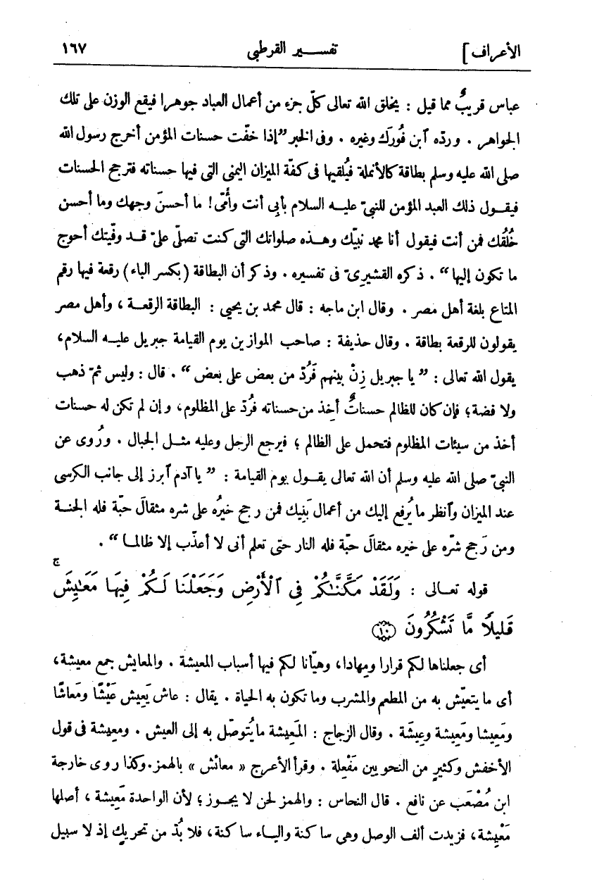 ابْنُ عَبَّاسٍ قَرِيبٌ مِمَّا قِيلَ: يَخْلُقُ اللَّهُ تَعَالَى كُلَّ جُزْءٍ مِنْ أَعْمَالِ الْعِبَادِ جَوْهَرًا فَيَقَعُ الْوَزْنُ عَلَى تِلْكَ الْجَوَاهِرِ. وَرَدَّهُ ابْنُ فُورَكَ وَغَيْرُهُ. وَفِي الْخَبَرِ (إِذَا خَفَّتْ حَسَنَاتُ المؤمن أخرج رسول الله صل اللَّهُ عَلَيْهِ وَسَلَّمَ بِطَاقَةً كَالْأُنْمُلَةِ فَيُلْقِيهَا فِي كِفَّةِ الْمِيزَانِ الْيُمْنَى الَّتِي فِيهَا حَسَنَاتُهُ فَتَرْجَحُ الْحَسَنَاتُ فَيَقُولُ ذَلِكَ الْعَبْدُ الْمُؤْمِنُ لِلنَّبِيِّ صَلَّى اللَّهُ عَلَيْهِ وَسَلَّمَ بِأَبِي أَنْتَ وَأُمِّي! مَا أَحْسَنَ وَجْهَكَ وَمَا أَحْسَنَ خَلْقَكَ فَمَنْ أَنْتَ؟ فَيَقُولُ أَنَا مُحَمَّدٌ نَبِيُّكَ وَهَذِهِ صَلَوَاتُكَ الَّتِي كُنْتَ تُصَلِّي عَلَيَّ قَدْ وَفَّيْتُكَ أَحْوَجَ مَا تَكُونُ إِلَيْهَا (. ذَكَرَهُ الْقُشَيْرِيُّ فِي تَفْسِيرِهِ. وَذَكَرَ أَنَّ الْبِطَاقَةَ (بِكَسْرِ الْبَاءِ) رُقْعَةٌ فِيهَا رَقْمُ الْمَتَاعِ بِلُغَةِ. أَهْلِ مِصْرَ. وَقَالَ ابْنُ مَاجَهْ: قَالَ مُحَمَّدُ بْنُ يَحْيَى: الْبِطَاقَةُ الرُّقْعَةُ، وَأَهْلُ مِصْرَ يَقُولُونَ لِلرُّقْعَةِ بِطَاقَةٌ. وَقَالَ حُذَيْفَةُ: صَاحِبُ الْمَوَازِينِ يَوْمَ الْقِيَامَةِ جِبْرِيلُ عَلَيْهِ السَّلَامُ، يَقُولُ اللَّهُ تَعَالَى: (يَا جِبْرِيلُ زِنْ بَيْنَهُمْ فَرُدَّ مِنْ بَعْضٍ عَلَى بَعْضٍ). قَالَ: وَلَيْسَ ثَمَّ ذَهَبٌ وَلَا فِضَّةٌ، فَإِنْ كَانَ لِلظَّالِمِ حَسَنَاتٌ أُخِذَ مِنْ حَسَنَاتِهِ فَرُدَّ عَلَى الْمَظْلُومِ، وَإِنْ لَمْ تَكُنْ لَهُ حَسَنَاتٌ أُخِذَ مِنْ سَيِّئَاتِ الْمَظْلُومِ فَتُحْمَلُ عَلَى الظَّالِمِ، فَيَرْجِعُ الرَّجُلُ وَعَلَيْهِ مِثْلُ الْجِبَالِ. وَرُوِيَ عَنِ النَّبِيِّ صَلَّى اللَّهُ عَلَيْهِ وَسَلَّمَ: (أَنَّ اللَّهَ تَعَالَى يَقُولُ يَوْمَ الْقِيَامَةِ يَا آدَمُ ابْرُزْ إِلَى جَانِبِ الْكُرْسِيِّ عِنْدَ الْمِيزَانِ وَانْظُرْ مَا يُرْفَعُ إِلَيْكَ مِنْ أَعْمَالِ بَنِيكَ فَمَنْ رَجَحَ خَيْرُهُ عَلَى شَرِّهِ مِثْقَالَ حَبَّةٍ فَلَهُ الْجَنَّةُ وَمَنْ رَجَحَ شَرُّهُ عَلَى خَيْرِهِ مِثْقَالَ حَبَّةٍ فَلَهُ النَّارُ حَتَّى تعلم أني لا أعذب إلا ظالما).