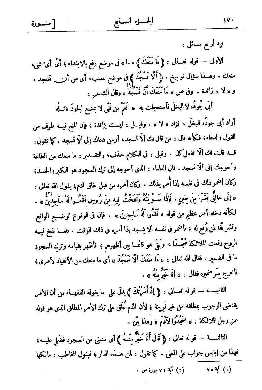 فِيهِ أَرْبَعُ مَسَائِلَ: الْأُولَى- قَوْلُهُ تَعَالَى: (مَا مَنَعَكَ) " مَا" فِي مَوْضِعِ رَفْعٍ بِالِابْتِدَاءِ، أَيْ أي شي مَنَعَكَ. وَهَذَا سُؤَالُ تَوْبِيخٍ. أَلَّا تَسْجُدَ فِي مَوْضِعِ نَصْبٍ، أَيْ مِنْ أَنْ تَسْجُدَ. وَ" لَا" زَائِدَةٌ. وَفِي ص" مَا مَنَعَكَ أَنْ تَسْجُدَ «١» " وَقَالَ الشَّاعِرُ: