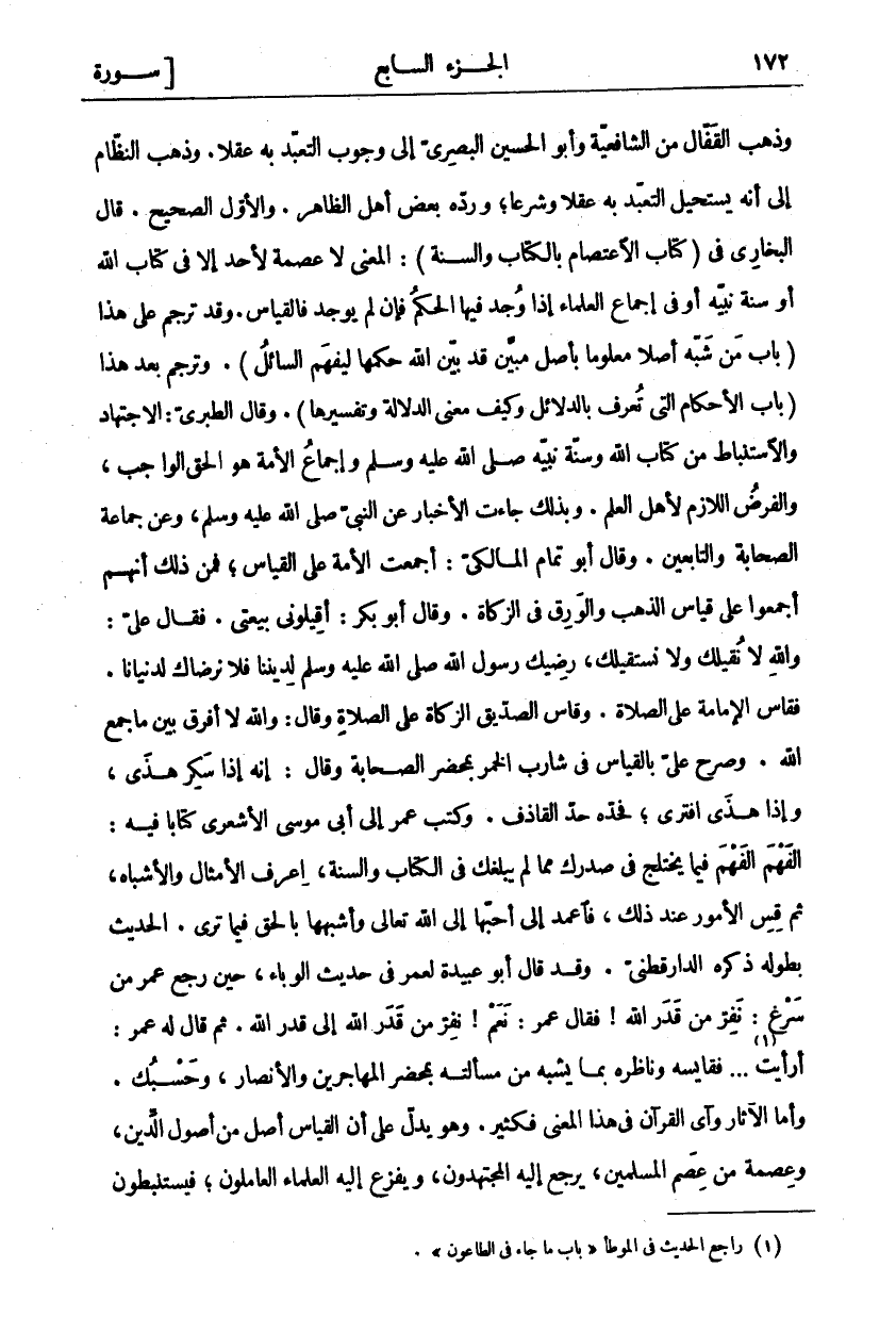 وذهب القفال من الشافعية وأبو الحسين الْبَصْرِيِّ إِلَى وُجُوبِ التَّعَبُّدِ بِهِ عَقْلًا. وَذَهَبَ النَّظَّامُ إِلَى أَنَّهُ يَسْتَحِيلُ التَّعَبُّدُ بِهِ عَقْلًا وَشَرْعًا، وَرَدَّهُ بَعْضُ أَهْلُ الظَّاهِرِ. وَالْأَوَّلُ الصَّحِيحُ. قَالَ الْبُخَارِيُّ فِي (كِتَابِ الِاعْتِصَامِ بِالْكِتَابِ وَالسُّنَّةِ): الْمَعْنَى لَا عِصْمَةَ لِأَحَدٍ إِلَّا فِي كِتَابِ اللَّهِ أَوْ سُنَّةِ نَبِيِّهِ أَوْ فِي إِجْمَاعِ الْعُلَمَاءِ إِذَا وُجِدَ فِيهَا الْحُكْمُ فَإِنْ لَمْ يُوجَدْ فَالْقِيَاسُ. وَقَدْ تَرْجَمَ عَلَى هَذَا (بَابُ مَنْ شَبَّهَ أَصْلًا مَعْلُومًا بِأَصْلٍ مُبَيَّنٍ قَدْ بين الله حكمها لِيُفْهِمَ السَّائِلَ). وَتَرْجَمَ بَعْدَ هَذَا (بَابُ الْأَحْكَامِ الَّتِي تُعْرَفُ بِالدَّلَائِلِ وَكَيْفَ مَعْنَى الدَّلَالَةِ وَتَفْسِيرِهَا). وَقَالَ الطَّبَرِيُّ: الِاجْتِهَادُ وَالِاسْتِنْبَاطُ مِنْ كِتَابِ اللَّهِ وَسُنَّةِ نَبِيِّهِ صَلَّى اللَّهُ عَلَيْهِ وَسَلَّمَ وَإِجْمَاعُ الْأُمَّةِ هُوَ الْحَقُّ الْوَاجِبُ، وَالْفَرْضُ اللَّازِمُ لِأَهْلِ الْعِلْمِ. وَبِذَلِكَ جَاءَتِ الْأَخْبَارِ عَنِ النَّبِيِّ صَلَّى اللَّهُ عَلَيْهِ وَسَلَّمَ، وَعَنْ جَمَاعَةِ الصَّحَابَةِ وَالتَّابِعِينَ. وَقَالَ أَبُو تَمَّامٍ الْمَالِكِيُّ: أَجْمَعَتِ الْأُمَّةُ عَلَى الْقِيَاسِ، فَمِنْ ذَلِكَ أَنَّهُمْ أَجْمَعُوا عَلَى قِيَاسِ الذَّهَبِ وَالْوَرِقِ فِي الزَّكَاةِ. وَقَالَ أَبُو بَكْرٍ: أَقِيلُونِي بَيْعَتِي. فَقَالَ عَلِيٌّ: وَاللَّهِ لَا نُقِيلُكَ وَلَا نَسْتَقِيلُكَ، رَضِيَكَ رَسُولُ اللَّهِ صَلَّى اللَّهُ عَلَيْهِ وَسَلَّمَ لِدِينِنَا أَفَلَا نَرْضَاكَ لِدُنْيَانَا؟ فَقَاسَ الْإِمَامَةَ عَلَى الصَّلَاةِ. وَقَاسَ الصِّدِّيقُ الزَّكَاةَ عَلَى الصَّلَاةِ وَقَالَ: وَاللَّهِ لَا أُفَرِّقُ بَيْنَ مَا جَمَعَ اللَّهُ. وَصَرَّحَ عَلِيٌّ بِالْقِيَاسِ فِي شَارِبِ الْخَمْرِ بِمَحْضَرٍ مِنَ الصَّحَابَةِ وَقَالَ: إِنَّهُ إِذَا سَكِرَ هَذَى، وَإِذَا هَذَى افْتَرَى، فَحَدُّهُ حَدُ الْقَاذِفِ. وَكَتَبَ عُمَرُ إِلَى أَبِي مُوسَى الْأَشْعَرِيِّ كتابا فيه: الْفَهْمَ فِيمَا يَخْتَلِجُ فِي صَدْرِكَ مِمَّا لَمْ يَبْلُغْكَ فِي الْكِتَابِ وَالسُّنَّةِ، اعْرِفِ الْأَمْثَالَ وَالْأَشْبَاهَ، ثُمَّ قِسِ الْأُمُورَ عِنْدَ ذَلِكَ، فَاعْمِدْ إِلَى أَحَبِّهَا إِلَى اللَّهِ تَعَالَى وَأَشْبَهِهَا بِالْحَقِّ فِيمَا تَرَى. الْحَدِيثُ بِطُولِهِ ذَكَرَهُ الدَّارقُطْنِيُّ. وَقَدْ قَالَ أَبُو عُبَيْدَةَ لِعُمَرَ (رَضِيَ اللَّهُ «١» عَنْهُمَا) فِي حَدِيثِ الْوَبَاءِ، حِينَ رَجَعَ عُمَرُ مِنْ سَرْغَ «٢»: نَفِرُّ مِنْ قَدَرِ اللَّهِ؟ فَقَالَ عُمَرُ: نَعَمْ! نَفِرُّ مِنْ قَدَرِ اللَّهِ إِلَى قَدَرِ اللَّهِ. ثُمَّ قَالَ لَهُ عُمَرُ: أَرَأَيْتَ «٣» ... فَقَايَسَهُ وَنَاظَرَهُ بِمَا يُشْبِهُ مِنْ مَسْأَلَتِهِ بِمَحْضَرِ الْمُهَاجِرِينَ وَالْأَنْصَارِ، وَحَسْبُكَ. وَأَمَّا الْآثَارُ وَآيُ الْقُرْآنِ فِي هَذَا الْمَعْنَى فَكَثِيرٌ. وَهُوَ يَدُلُّ عَلَى أَنَّ الْقِيَاسَ أَصْلٌ مِنْ أُصُولِ الدِّينِ، وَعِصْمَةٌ مِنْ عِصَمِ الْمُسْلِمِينَ، يَرْجِعُ إِلَيْهِ الْمُجْتَهِدُونَ، وَيَفْزَعُ إِلَيْهِ الْعُلَمَاءُ العاملون، فيستنبطون