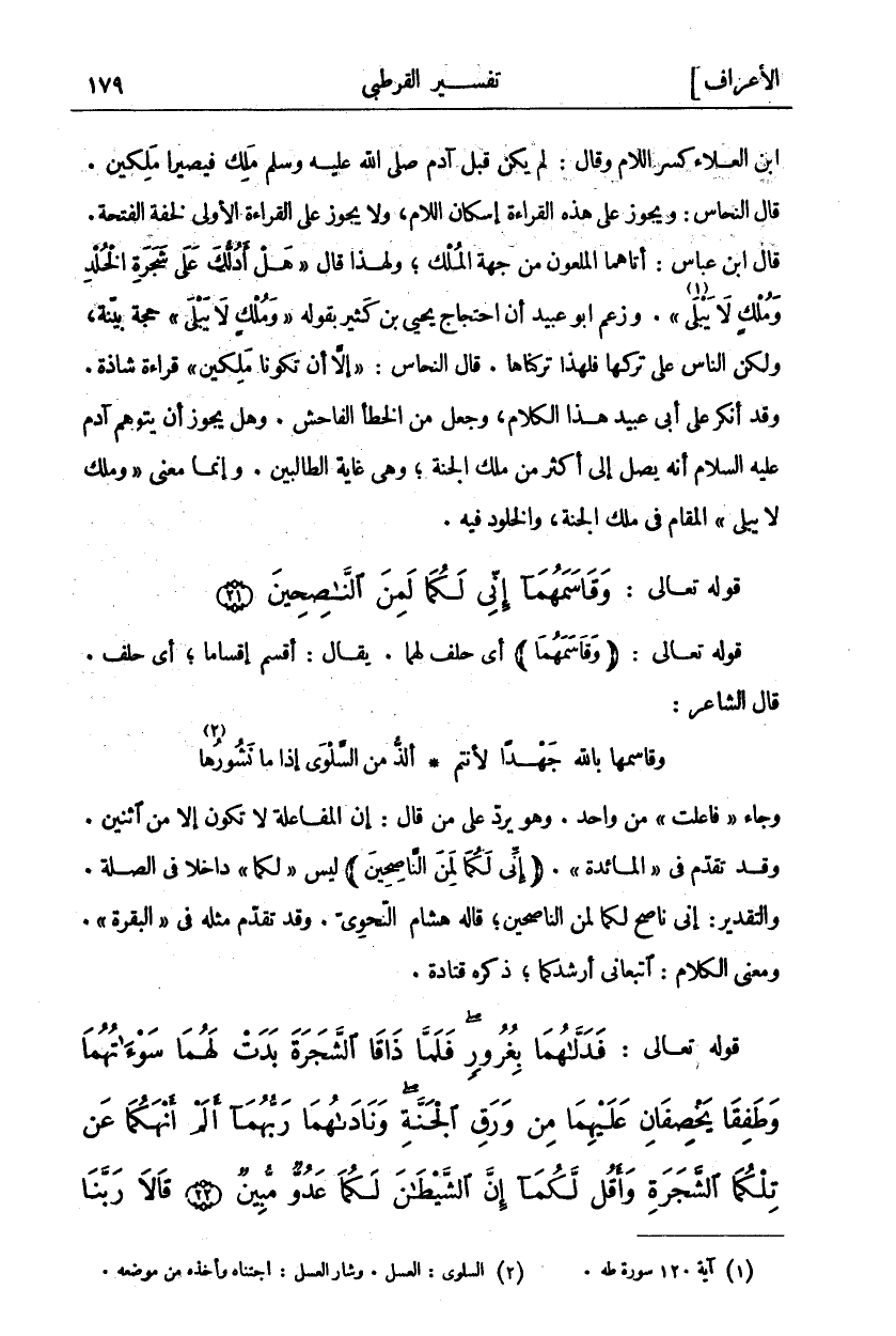 أَبُو عَمْرِو بْنُ الْعَلَاءِ كَسْرَ اللَّامِ وَقَالَ: لَمْ يَكُنْ قَبْلَ آدَمَ صَلَّى اللَّهُ عَلَيْهِ وَسَلَّمَ. مَلِكٌ فَيَصِيرَا مَلِكَيْنِ. قَالَ النَّحَّاسُ: وَيَجُوزُ عَلَى هَذِهِ الْقِرَاءَةِ إِسْكَانُ اللَّامِ، وَلَا يَجُوزُ عَلَى الْقِرَاءَةِ الْأُولَى لِخِفَّةِ الْفَتْحَةِ. قَالَ ابْنُ عَبَّاسٍ: أَتَاهُمَا الْمَلْعُونُ مِنْ جِهَةِ الْمُلْكِ، وَلِهَذَا قَالَ:" هَلْ أَدُلُّكَ عَلى شَجَرَةِ الْخُلْدِ وَمُلْكٍ لَا يَبْلى «١» ". وَزَعَمَ أَبُو عُبَيْدٍ أَنَّ احْتِجَاجَ يَحْيَى بْنِ أَبِي كَثِيرٍ بِقَوْلِهِ:" وَمُلْكٍ لَا يَبْلى " حُجَّةٌ بَيِّنَةٌ، وَلَكِنَّ النَّاسَ عَلَى تَرْكِهَا فلهذا تركناها. قال النحاس:" إلا أن تكون مُلْكَيْنِ" قِرَاءَةٌ شَاذَّةٌ. وَقَدْ أُنْكِرَ عَلَى أَبِي عُبَيْدٍ هَذَا الْكَلَامَ، وَجُعِلَ مِنَ الْخَطَأِ الْفَاحِشِ. وَهَلْ يَجُوزُ أَنْ يَتَوَهَّمَ آدَمُ عَلَيْهِ السَّلَامُ أَنَّهُ يَصِلُ إِلَى أَكْثَرَ مِنْ مُلْكِ الْجَنَّةِ، وَهُوَ غَايَةُ الطَّالِبِينَ. وَإِنَّمَا مَعْنَى" وَمُلْكٍ لَا يَبْلى " الْمُقَامُ فِي مُلْكِ الْجَنَّةِ، وَالْخُلُودُ فِيهِ.