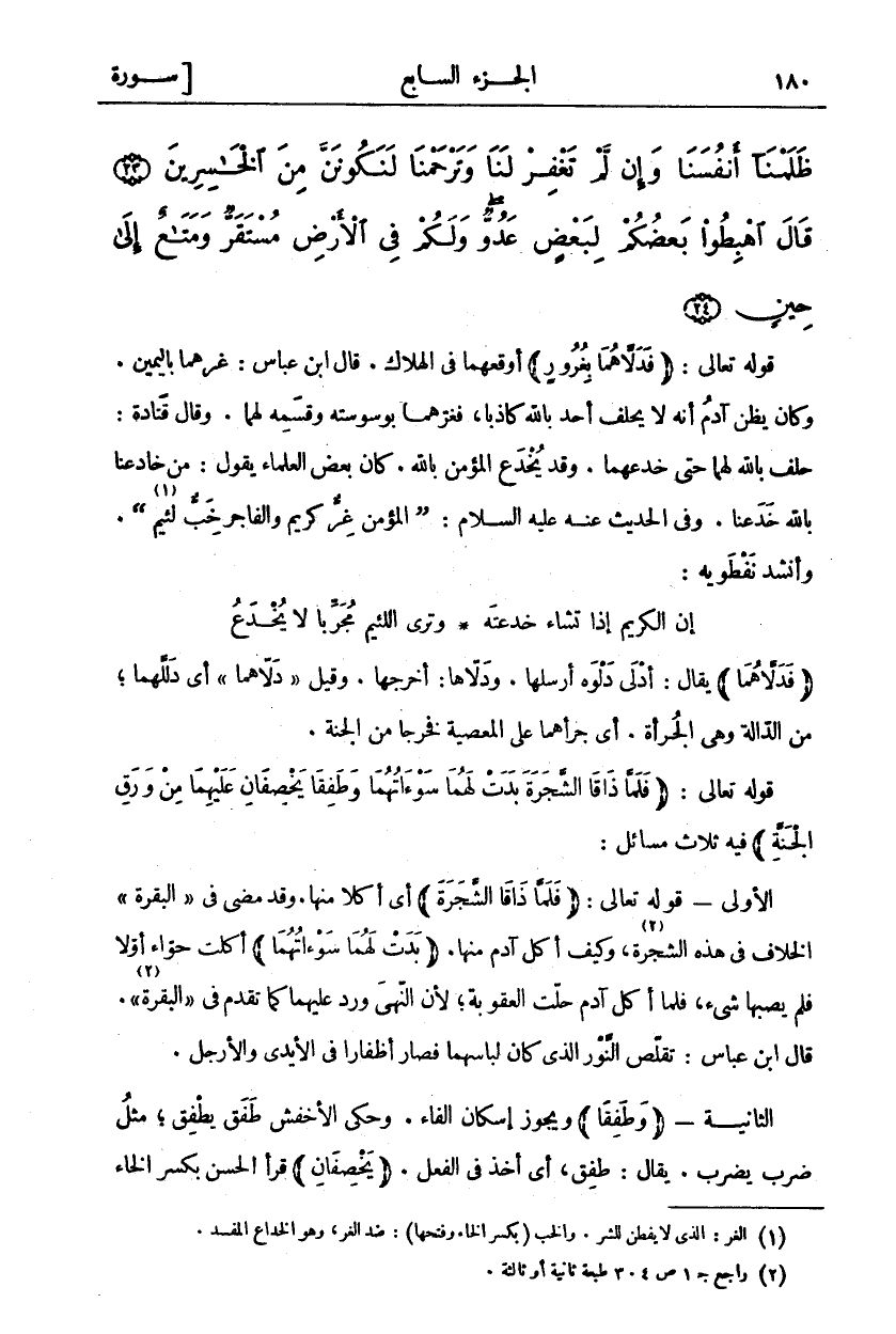 " فَدَلَّاهُما" يُقَالُ: أَدْلَى دلوه: أرسلها. ودلاها: أخرجها. وقيل:" فَدَلَّاهُما" أَيْ دَلَّلَهُمَا، مِنَ الدَّالَّةِ وَهِيَ الْجُرْأَةُ. أَيْ جَرَّأَهُمَا عَلَى الْمَعْصِيَةِ فَخَرَجَا مِنَ الْجَنَّةِ. قَوْلُهُ تَعَالَى: (فَلَمَّا ذاقَا الشَّجَرَةَ بَدَتْ لَهُما سَوْآتُهُما وَطَفِقا يَخْصِفانِ عَلَيْهِما مِنْ وَرَقِ الْجَنَّةِ) فِيهِ ثَلَاثُ مَسَائِلَ: الْأُولَى- قَوْلُهُ تَعَالَى:" فَلَمَّا ذاقَا الشَّجَرَةَ" أَيْ أَكَلَا مِنْهَا. وَقَدْ مَضَى فِي" الْبَقَرَةِ" الْخِلَافُ فِي هَذِهِ الشَّجَرَةِ «٢»، وَكَيْفَ أَكَلَ آدَمُ مِنْهَا." بَدَتْ لَهُما سَوْآتُهُما" أَكَلَتْ حَوَّاءُ أولا فلم يصبها شي، فَلَمَّا أَكَلَ آدَمُ حَلَّتِ الْعُقُوبَةُ، لِأَنَّ النَّهْيَ وَرَدَ عَلَيْهِمَا كَمَا تَقَدَّمَ فِي" الْبَقَرَةِ «٣» ". قَالَ ابْنُ عَبَّاسٍ: تَقَلَّصَ النُّورُ الَّذِي كَانَ لِبَاسَهُمَا فَصَارَ أَظْفَارًا فِي الْأَيْدِي وَالْأَرْجُلِ. الثَّانِيَةُ-" وَطَفِقا" وَيَجُوزُ إِسْكَانُ «٤» الْفَاءِ. وَحَكَى الْأَخْفَشُ طَفِقَ يَطْفِقُ، مِثْلَ ضَرَبَ يَضْرِبُ. يُقَالُ: طَفِقَ، أَيْ أَخَذَ فِي الْفِعْلِ." يَخْصِفانِ" وَقَرَأَ الْحَسَنُ بِكَسْرِ الْخَاءِ وَشَدِّ الصَّادِ. وَالْأَصْلُ" يَخْتَصِفَانِ" فَأُدْغِمَ، وَكُسِرَ الْخَاءُ