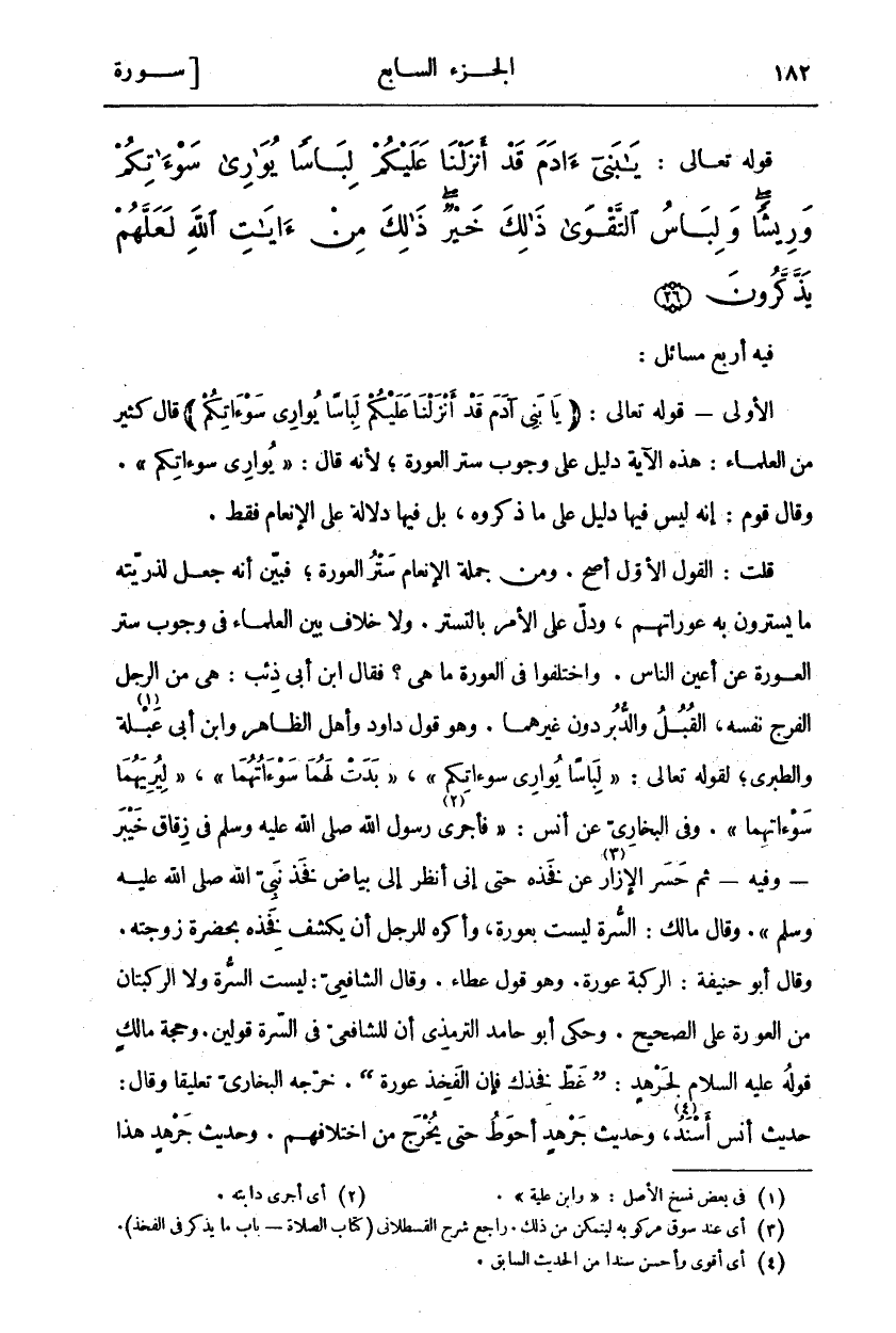 فِيهِ أَرْبَعُ مَسَائِلَ: الْأُولَى- قَوْلُهُ تَعَالَى: (يَا بَنِي آدَمَ قَدْ أَنْزَلْنا عَلَيْكُمْ لِباساً يُوارِي سَوْآتِكُمْ) قَالَ كَثِيرٌ مِنَ الْعُلَمَاءِ: هَذِهِ الْآيَةُ دَلِيلٌ عَلَى وُجُوبِ سَتْرِ الْعَوْرَةِ، لِأَنَّهُ قَالَ:" يُوارِي سَوْآتِكُمْ". وَقَالَ قَوْمٌ إِنَّهُ لَيْسَ فِيهَا دَلِيلٌ عَلَى مَا ذَكَرُوهُ، بَلْ فِيهَا دَلَالَةٌ عَلَى الْإِنْعَامِ فَقَطْ. قُلْتُ: الْقَوْلُ الْأَوَّلُ أَصَحُّ. وَمِنْ جُمْلَةِ الْإِنْعَامِ سَتْرُ الْعَوْرَةِ، فَبَيَّنَ أَنَّهُ (سُبْحَانَهُ وَتَعَالَى «١») جَعَلَ لِذُرِّيَّتِهِ مَا يَسْتُرُونَ بِهِ عَوْرَاتِهِمْ، وَدَلَّ عَلَى الْأَمْرِ بِالسَّتْرِ. وَلَا خِلَافَ بَيْنِ الْعُلَمَاءِ فِي وُجُوبِ سَتْرِ الْعَوْرَةِ عَنْ أَعْيُنِ النَّاسِ. وَاخْتَلَفُوا فِي الْعَوْرَةِ مَا هِيَ؟ فَقَالَ ابْنُ أَبِي ذِئْبٍ: هِيَ مِنَ الرَّجُلِ الْفَرْجُ نَفْسُهُ، الْقُبُلُ وَالدُّبُرُ دُونَ غَيْرِهِمَا. وَهُوَ قَوْلُ دَاوُدَ وَأَهْلِ الظَّاهِرِ وَابْنِ أَبِي عَبْلَةَ «٢» وَالطَّبَرِيِّ، لِقَوْلِهِ تَعَالَى:" لِباساً يُوارِي سَوْآتِكُمْ"،" بَدَتْ لَهُما سَوْآتُهُما"،" لِيُرِيَهُما سَوْآتِهِما". وَفِي الْبُخَارِيِّ عَنْ أَنَسٍ:" فَأَجْرَى «٣» رَسُولُ اللَّهِ صَلَّى اللَّهُ عَلَيْهِ وَسَلَّمَ فِي زُقَاقِ خَيْبَرَ- وَفِيهِ- ثُمَّ حَسِرَ «٤» الْإِزَارُ عَنْ فَخِذِهِ حَتَّى إِنِّي أَنْظُرُ إِلَى بَيَاضِ فَخِذِ نَبِيِّ اللَّهِ صَلَّى اللَّهُ عَلَيْهِ وَسَلَّمَ". وَقَالَ مَالِكٌ: السُّرَّةُ لَيْسَتْ بِعَوْرَةٍ، وَأَكْرَهُ لِلرَّجُلِ أَنْ يَكْشِفَ فَخِذَهُ بِحَضْرَةِ زَوْجَتِهِ. وَقَالَ أَبُو حَنِيفَةَ: الرُّكْبَةُ عَوْرَةٌ. وَهُوَ قَوْلُ عَطَاءٍ. وَقَالَ الشَّافِعِيُّ: لَيْسَتِ السُّرَّةُ وَلَا الرُّكْبَتَانِ مِنَ الْعَوْرَةِ عَلَى الصَّحِيحِ. وَحَكَى أَبُو حَامِدٍ التِّرْمِذِيُّ أَنَّ لِلشَّافِعِيِّ فِي السُّرَّةِ قَوْلَيْنِ. وَحُجَّةُ مَالِكٍ قَوْلُهُ عَلَيْهِ السَّلَامُ لِجَرْهَدٍ: (غَطِّ فَخِذكَ فَإِنَّ الْفَخِذَ عَوْرَةٌ). خَرَّجَهُ الْبُخَارِيُّ تَعْلِيقًا وَقَالَ: حَدِيثُ أَنَسٍ أَسْنَدُ «٥»، وَحَدِيثُ جَرْهَدٍ أَحْوَطُ حَتَّى يَخْرُجَ مِنَ اختلافهم. وحديث جرهد هذا