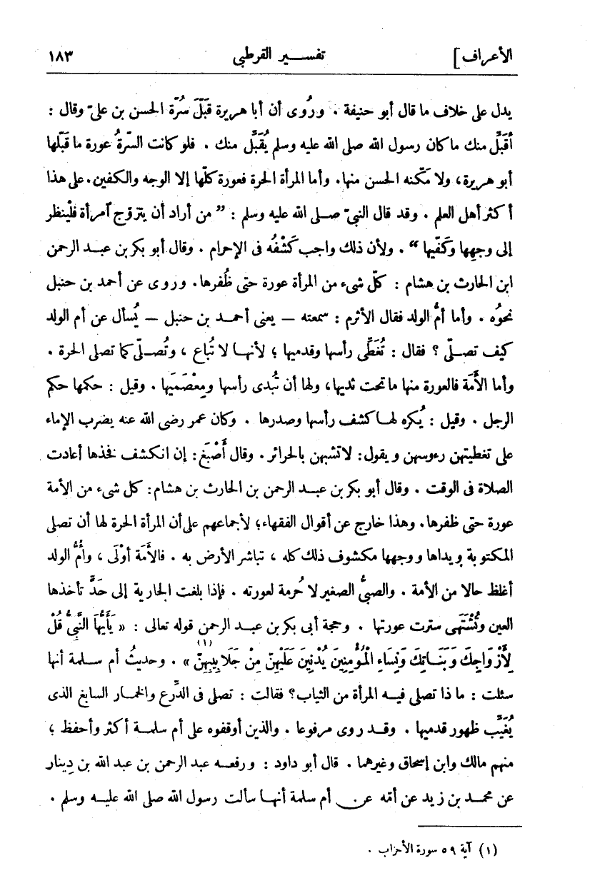 يَدُلُّ عَلَى خِلَافِ مَا قَالَ أَبُو حَنِيفَةَ. وَرُوِيَ أَنَّ أَبَا هُرَيْرَةَ قَبَّلَ سُرَّةَ الْحَسَنِ بْنِ عَلِيٍّ وَقَالَ: أُقَبِّلُ مِنْكَ مَا كَانَ رسول الله صلى عَلَيْهِ وَسَلَّمَ يُقَبِّلُ مِنْكَ. فَلَوْ كَانَتِ السُّرَّةُ عَوْرَةً مَا قَبَّلَهَا أَبُو هُرَيْرَةَ، وَلَا مَكَّنَهُ الْحَسَنُ مِنْهَا. وَأَمَّا الْمَرْأَةُ الْحُرَّةُ فَعَوْرَةٌ كُلُّهَا إِلَّا الْوَجْهَ وَالْكَفَّيْنِ. عَلَى هَذَا أَكْثَرُ أَهْلِ العلم. وقد قال النبي صلى: (مَنْ أَرَادَ أَنْ يَتَزَوَّجَ امْرَأَةً فَلْيَنْظُرْ إِلَى وَجْهِهَا وَكَفَّيْهَا). وَلِأَنَّ ذَلِكَ وَاجِبٌ كَشْفُهُ فِي الْإِحْرَامِ. وَقَالَ أَبُو بَكْرِ بْنِ عَبْدِ الرَّحْمَنِ بْنِ الْحَارِثِ بْنِ هشام: كشيء مِنَ الْمَرْأَةِ عَوْرَةٌ حَتَّى ظُفْرَهَا. وَرُوِيَ عَنْ أَحْمَدَ بْنِ حَنْبَلٍ نَحْوُهُ. وَأَمَّا أُمُّ الْوَلَدِ فَقَالَ الْأَثْرَمُ: سَمِعْتُهُ- يَعْنِي أَحْمَدَ بْنَ حَنْبَلٍ- يُسْأَلُ عَنْ أُمِّ الْوَلَدِ كَيْفَ تُصَلِّي؟ فَقَالَ: تُغَطِّي رَأْسَهَا وَقَدَمَيْهَا، لِأَنَّهَا لَا تُبَاعُ، وَتُصَلِّي كَمَا تُصَلِّي الْحُرَّةُ. وَأَمَّا الْأَمَةُ فَالْعَوْرَةُ مِنْهَا ما تحت ثديها، وَلَهَا أَنْ تُبْدِيَ رَأْسَهَا وَمِعْصَمَيْهَا. وَقِيلَ: حُكْمُهَا حُكْمُ الرَّجُلِ. وَقِيلَ: يُكْرَهُ لَهَا كَشْفُ رَأْسِهَا وَصَدْرِهَا. وَكَانَ عُمَرُ رَضِيَ اللَّهُ عَنْهُ يَضْرِبُ الْإِمَاءَ عَلَى تَغْطِيَتِهِنَّ رُءُوسَهُنَّ وَيَقُولُ: لَا تَشَبَّهْنَ بِالْحَرَائِرِ. وَقَالَ أَصْبَغُ: إِنِ انْكَشَفَ فَخِذُهَا أَعَادَتِ الصَّلَاةَ فِي الْوَقْتِ. وَقَالَ أَبُو بَكْرِ بْنِ عَبْدِ الرَّحْمَنِ بْنِ الْحَارِثِ بْنِ هِشَامٍ: كُلُّ شي مِنَ الْأَمَةِ عَوْرَةٌ حَتَّى ظُفْرَهَا. وَهَذَا خَارِجٌ عَنْ أَقْوَالِ الْفُقَهَاءِ، لِإِجْمَاعِهِمْ عَلَى أَنَّ الْمَرْأَةَ الْحُرَّةَ لَهَا أَنْ تُصَلِّيَ الْمَكْتُوبَةَ وَيَدَاهَا وَوَجْهُهَا مَكْشُوفٌ ذَلِكَ كُلُّهُ، تُبَاشِرُ الْأَرْضَ بِهِ. فَالْأَمَةُ أَوْلَى، وَأُمُّ الْوَلَدِ أَغْلَظُ حَالًا مِنَ الْأَمَةِ. وَالصَّبِيُّ الصَّغِيرُ لَا حُرْمَةَ لِعَوْرَتِهِ. فَإِذَا بَلَغَتِ الْجَارِيَةُ إِلَى حَدٍّ تَأْخُذُهَا الْعَيْنُ وَتُشْتَهَى سَتَرَتْ عَوْرَتَهَا. وَحُجَّةُ أَبِي بَكْرِ بْنِ عَبْدِ الرَّحْمَنِ قول تَعَالَى:" يَا أَيُّهَا النَّبِيُّ قُلْ لِأَزْواجِكَ وَبَناتِكَ وَنِساءِ الْمُؤْمِنِينَ يُدْنِينَ عَلَيْهِنَّ مِنْ جَلَابِيبِهِنَّ «١» ". وَحَدِيثُ أُمِّ سَلَمَةَ أَنَّهَا سُئِلَتْ: مَاذَا تُصَلِّي فِيهِ الْمَرْأَةُ مِنَ الثِّيَابِ؟ فقالت: تصلي الدِّرْعِ وَالْخِمَارِ السَّابِغِ الَّذِي يُغَيِّبُ ظُهُورَ قَدَمَيْهَا. وَقَدْ رُوِيَ مَرْفُوعًا. وَالَّذِينَ أَوْقَفُوهُ عَلَى أُمِّ سَلَمَةَ أَكْثَرُ وَأَحْفَظُ، مِنْهُمْ مَالِكٌ وَابْنُ إِسْحَاقَ وَغَيْرُهُمَا. قَالَ أَبُو دَاوُدَ: وَرَفَعَهُ عَبْدُ الرَّحْمَنِ بْنُ عَبْدِ اللَّهِ بْنِ دِينَارٍ عَنْ مُحَمَّدِ بْنِ زَيْدٍ عَنْ أُمِّهِ «٢» عَنْ أُمِّ سَلَمَةَ أَنَّهَا سَأَلَتْ رَسُولَ اللَّهِ صَلَّى اللَّهُ عَلَيْهِ وَسَلَّمَ.