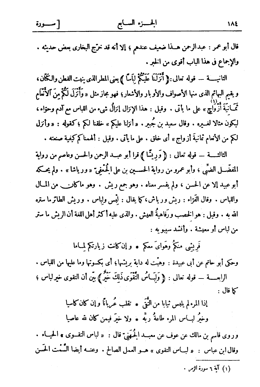 قَالَ أَبُو عُمَرَ: عَبْدُ الرَّحْمَنِ هَذَا ضَعِيفٌ عِنْدَهُمْ، إِلَّا أَنَّهُ قَدْ خَرَّجَ الْبُخَارِيُّ بَعْضَ حَدِيثِهِ. وَالْإِجْمَاعُ فِي هَذَا الْبَابِ أَقْوَى مِنَ الْخَبَرِ. الثَّانِيَةُ- قَوْلُهُ تَعَالَى:" أَنْزَلْنا عَلَيْكُمْ لِباساً" يَعْنِي الْمَطَرَ الَّذِي يُنْبِتُ الْقُطْنَ وَالْكَتَّانَ، وَيُقِيمُ الْبَهَائِمَ «١» الَّذِي مِنْهَا الْأَصْوَافُ وَالْأَوْبَارُ وَالْأَشْعَارُ، فَهُوَ مَجَازٌ مِثْلُ" وَأَنْزَلَ لَكُمْ مِنَ الْأَنْعامِ ثَمانِيَةَ أَزْواجٍ «٢» " عَلَى مَا يَأْتِي. وَقِيلَ: هَذَا الْإِنْزَالُ إنزال شي اللِّبَاسِ مَعَ آدَمَ وَحَوَّاءَ، لِيَكُونَ مِثَالًا لِغَيْرِهِ. وَقَالَ سَعِيدُ بْنُ جُبَيْرٍ:" أَنْزَلْنا عَلَيْكُمْ" (أَيْ «٣») خَلَقْنَا لَكُمْ، كَقَوْلِهِ:" وَأَنْزَلَ لَكُمْ مِنَ الْأَنْعامِ ثَمانِيَةَ أَزْواجٍ" أَيْ خَلَقَ. عَلَى مَا يَأْتِي. وَقِيلَ: أَلْهَمْنَاكُمْ كَيْفِيَّةَ صَنْعَتِهِ. الثَّالِثَة- قَوْلُهُ تَعَالَى: (وَرِيشاً) قَرَأَ أَبُو عَبْدِ الرَّحْمَنِ وَالْحَسَنُ وَعَاصِمٌ مِنْ رِوَايَةِ الْمُفَضَّلِ الضَّبِّيِّ، وَأَبُو عَمْرٍو مِنْ رِوَايَةِ الْحُسَيْنِ بْنِ عَلِيٍّ الْجُعْفِيِّ" وَرِيَاشًا". وَلَمْ يَحْكِهِ أَبُو عُبَيْدٍ «٤» إِلَّا عَنِ الْحَسَنِ، وَلَمْ يُفَسِّرْ مَعْنَاهُ. وَهُوَ جَمْعُ رِيشٍ. وَهُوَ مَا كَانَ مِنَ الْمَالِ وَاللِّبَاسِ. وَقَالَ الْفَرَّاءُ: رِيشٌ وَرِيَاشٌ، كَمَا يُقَالُ: لِبْسٌ وَلِبَاسٌ. وَرِيشُ الطَّائِرِ مَا سَتَرَهُ اللَّهُ بِهِ. وَقِيلَ: هُوَ الْخِصْبُ وَرَفَاهِيَةُ الْعَيْشِ. وَالَّذِي عَلَيْهِ أَكْثَرُ أَهْلِ اللُّغَةِ أَنَّ الرِّيشَ مَا سَتَرَ مِنْ لِبَاسٍ أَوْ مَعِيشَةٍ. وَأَنْشَدَ سِيبَوَيْهِ: