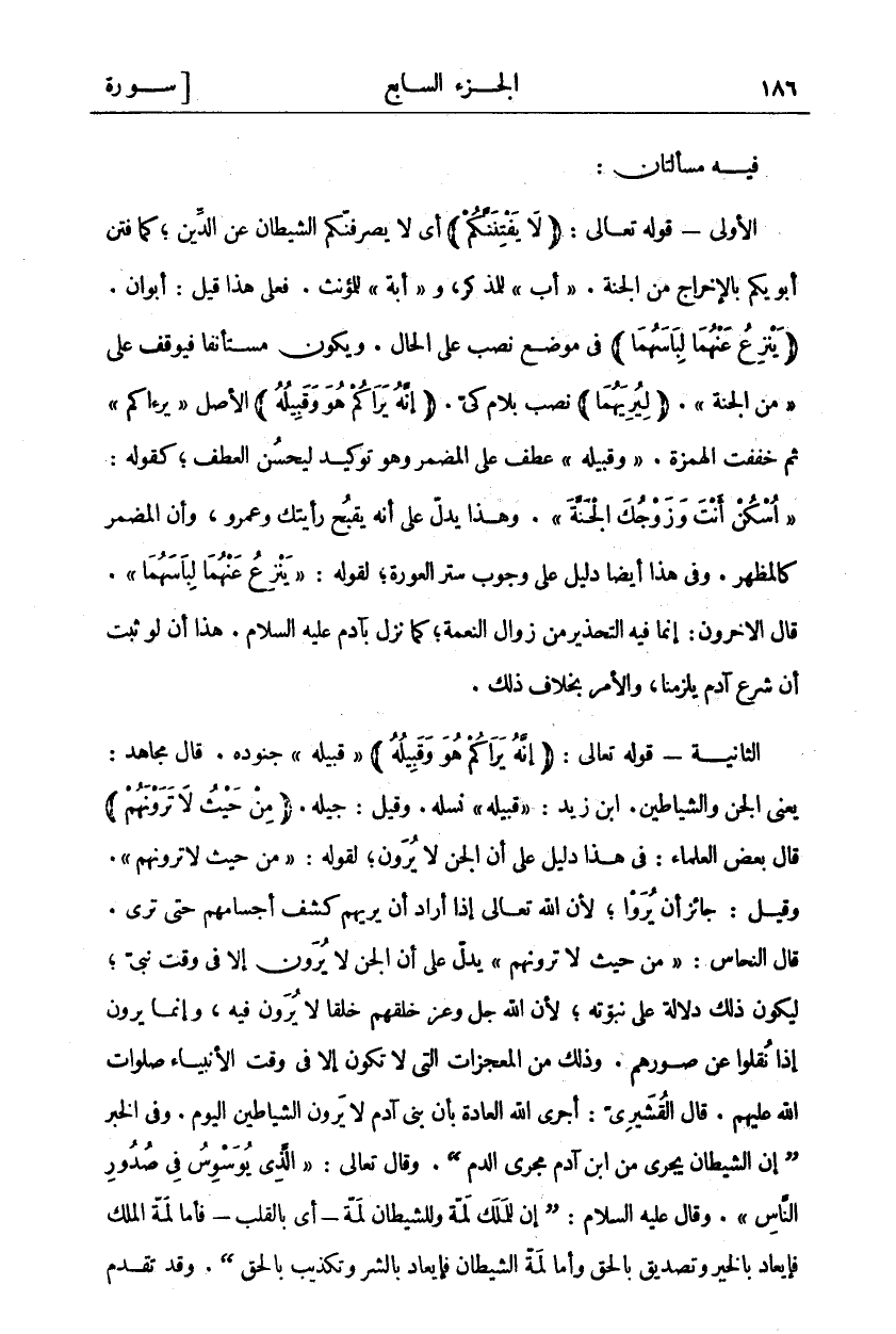 فِيهِ مَسْأَلَتَانِ: الْأُولَى- قَوْلُهُ تَعَالَى: (لَا يَفْتِنَنَّكُمُ) أَيْ لَا يَصْرِفَنَّكُمُ الشَّيْطَانُ عَنِ الدِّينِ، كَمَا فَتَنَ أَبَوَيْكُمْ بِالْإِخْرَاجِ مِنَ الْجَنَّةِ." أَبٌ" لِلْمُذَكَّرِ، وَ" أَبَةٌ" لِلْمُؤَنَّثِ. فَعَلَى هَذَا قِيلَ: أَبَوَانِ (ينزع عنهما لباسهما) فِي مَوْضِعِ نَصْبٍ عَلَى الْحَالِ. وَيَكُونُ مُسْتَأْنَفًا فَيُوقَفُ عَلَى" مِنَ الْجَنَّةِ"." لِيُرِيَهُما" نُصِبَ بِلَامِ كي. (إِنَّهُ يَراكُمْ هُوَ وَقَبِيلُهُ) الأصل يرءاكم ثم خففت الهمزة. وقبيله عطف على المضمر وهو توكيد ليحسن العطف كقوله: (اسْكُنْ أَنْتَ وَزَوْجُكَ الْجَنَّةَ) وهذا يدل على أنه يقبح رأيتك وعمرو، وأن المضمر كالمظهر وَفِي هَذَا أَيْضًا دَلِيلٌ عَلَى وُجُوبِ سَتْرِ الْعَوْرَةِ، لِقَوْلِهِ: (يَنْزِعُ عَنْهُما لِباسَهُما). قَالَ الْآخَرُونَ: إِنَّمَا فِيهِ التَّحْذِيرُ مِنْ زَوَالِ النِّعْمَةِ، كَمَا نَزَلَ بِآدَمَ. هَذَا أَنْ لَوْ ثَبَتَ أَنَّ شَرْعَ آدَمَ يَلْزَمُنَا، وَالْأَمْرُ بِخِلَافِ ذَلِكَ. الثَّانِيَةُ- قَوْلُهُ تَعَالَى: (إِنَّهُ يَراكُمْ هُوَ وَقَبِيلُهُ) " قَبِيلُهُ" جُنُودُهُ. قَالَ مُجَاهِدٌ: يَعْنِي الْجِنَّ وَالشَّيَاطِينَ. ابْنُ زَيْدٍ:" قَبِيلُهُ" نَسْلُهُ. وَقِيلَ: جِيلُهُ. مِنْ حَيْثُ لَا تَرَوْنَهُمْ قَالَ بَعْضُ الْعُلَمَاءِ: فِي هَذَا دَلِيلٌ عَلَى أَنَّ الْجِنَّ لَا يُرَوْنَ، لِقَوْلِهِ" مِنْ حَيْثُ لَا تَرَوْنَهُمْ" قِيلَ: جَائِزٌ أَنْ يُرَوْا، لِأَنَّ اللَّهَ تَعَالَى إِذَا أَرَادَ أَنْ يُرِيَهُمْ كَشَفَ أَجْسَامَهُمْ حَتَّى تُرَى. قَالَ النَّحَّاسُ:" مِنْ حَيْثُ لَا تَرَوْنَهُمْ" يَدُلُّ عَلَى أَنَّ الْجِنَّ لَا يُرَوْنَ إِلَّا فِي وَقْتِ نَبِيٍّ، لِيَكُونَ ذَلِكَ دَلَالَةً عَلَى نُبُوَّتِهِ، لِأَنَّ اللَّهَ جَلَّ وَعَزَّ خَلَقَهُمْ خَلْقًا لَا يُرَوْنَ فِيهِ، وَإِنَّمَا يُرَوْنَ إِذَا نُقِلُوا عَنْ صُوَرِهِمْ. وَذَلِكَ مِنَ الْمُعْجِزَاتِ الَّتِي لَا تَكُونُ إِلَّا فِي وَقْتِ الْأَنْبِيَاءِ صَلَوَاتُ اللَّهِ وَسَلَامُهُ عَلَيْهِمْ. قَالَ الْقُشَيْرِيُّ: أَجْرَى اللَّهُ الْعَادَةَ بِأَنَّ بَنِي آدَمَ لَا يَرَوْنَ الشَّيَاطِينَ الْيَوْمَ. وَفِي الْخَبَرِ (إِنَّ الشَّيْطَانَ يَجْرِي مِنَ ابْنِ آدَمَ مَجْرَى الدَّمِ). وَقَالَ تَعَالَى:" الَّذِي يُوَسْوِسُ فِي صُدُورِ النَّاسِ «١» ". وَقَالَ عَلَيْهِ السَّلَامُ: (إِنَّ لِلْمَلَكِ لَمَّةً وَلِلشَّيْطَانِ لَمَّةً- أَيْ بِالْقَلْبِ- فَأَمَّا لَمَّةُ الْمَلَكِ فَإِيعَادٌ بِالْخَيْرِ وَتَصْدِيقٌ بِالْحَقِّ وَأَمَّا لَمَّةُ الشَّيْطَانِ فَإِيعَادٌ بالشر وتكذيب بالحق (. وقد تقدم