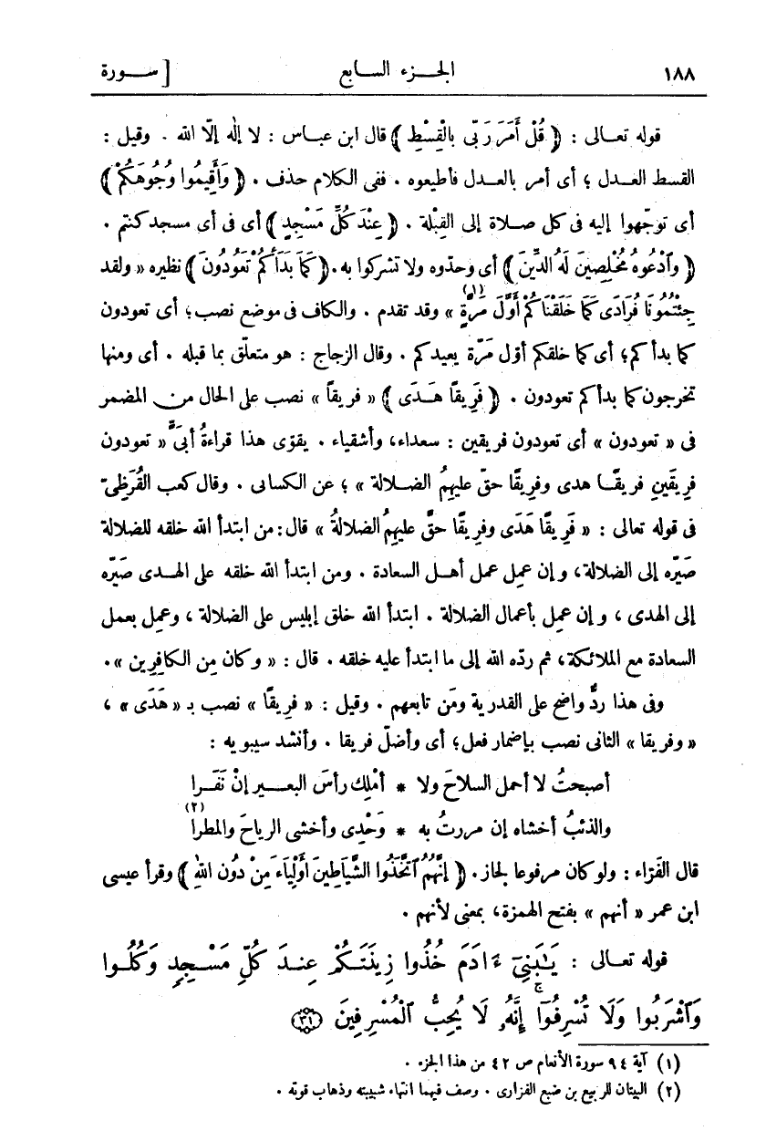 قَوْلُهُ تَعَالَى: (قُلْ أَمَرَ رَبِّي بِالْقِسْطِ) قَالَ ابْنُ عَبَّاسٍ: لَا إِلَهَ إِلَّا اللَّهُ. وَقِيلَ: القسط العدل، أي أمر: العدل فَأَطِيعُوهُ. فَفِي الْكَلَامِ حَذْفٌ. (وَأَقِيمُوا وُجُوهَكُمْ) أَيْ تَوَجَّهُوا إِلَيْهِ فِي كُلِّ صَلَاةٍ إِلَى الْقِبْلَةِ. (عِنْدَ كُلِّ مَسْجِدٍ) أَيْ فِي أَيِّ مَسْجِدٍ كُنْتُمْ. (وَادْعُوهُ مُخْلِصِينَ لَهُ) الدِّينَ أَيْ وَحِّدُوهُ وَلَا تُشْرِكُوا بِهِ. (كَما بَدَأَكُمْ تَعُودُونَ) نَظِيرُهُ" وَلَقَدْ جِئْتُمُونا فُرادى كَما خَلَقْناكُمْ أَوَّلَ مَرَّةٍ «١» " وَقَدْ تَقَدَّمَ. وَالْكَافُ فِي مَوْضِعِ نَصْبٍ، أَيْ تَعُودُونَ كَمَا بَدَأَكُمْ، أَيْ كَمَا خَلَقَكُمْ أَوَّلَ مَرَّةٍ يُعِيدُكُمْ. وَقَالَ الزَّجَّاجُ: هُوَ مُتَعَلِّقٌ بِمَا قَبْلَهُ. أَيْ وَمِنْهَا تُخْرَجُونَ كَمَا بَدَأَكُمْ تَعُودُونَ. (فَرِيقاً هَدى) " فَرِيقاً" نُصِبَ عَلَى الْحَالِ مِنَ الْمُضْمَرِ فِي" تَعُودُونَ" أَيْ تَعُودُونَ فَرِيقَيْنِ: سُعَدَاءَ، وَأَشْقِيَاءَ. يُقَوِّي هَذَا قِرَاءَةُ أُبَيٍّ" تَعُودُونَ فَرِيقَيْنِ فَرِيقًا هَدَى وَفَرِيقًا حَقَّ عَلَيْهِمُ الضَّلَالَةُ"، عَنِ الْكِسَائِيِّ. وَقَالَ مُحَمَّدُ بْنُ «٢» كَعْبٍ الْقُرَظِيُّ فِي قَوْلِهِ تَعَالَى" فَرِيقاً هَدى وَفَرِيقاً حَقَّ عَلَيْهِمُ الضَّلالَةُ" قَالَ: مَنِ ابْتَدَأَ اللَّهُ خَلْقَهُ لِلضَّلَالَةِ صَيَّرَهُ إِلَى الضَّلَالَةِ، وَإِنْ عَمِلَ بِأَعْمَالِ الْهُدَى. وَمَنِ ابْتَدَأَ اللَّهَ خَلْقَهُ عَلَى الْهُدَى صَيَّرَهُ إِلَى الْهُدَى، وَإِنْ عَمِلَ بِأَعْمَالِ الضَّلَالَةِ. ابْتَدَأَ اللَّهُ خَلْقَ إِبْلِيسَ عَلَى الضَّلَالَةِ، وَعَمِلَ بِأَعْمَالِ السَّعَادَةِ مَعَ الْمَلَائِكَةِ، ثُمَّ رَدَّهُ اللَّهُ إِلَى مَا ابْتَدَأَ عَلَيْهِ خَلْقَهُ. قَالَ:" وَكانَ مِنَ الْكافِرِينَ" وَفِي هَذَا رَدٌّ وَاضِحٌ عَلَى الْقَدَرِيَّةِ وَمَنْ تَابِعْهُمْ. وَقِيلَ:" فَرِيقاً" نُصِبَ بِ" هَدى "،" وَفَرِيقاً" الثَّانِي نُصِبَ بِإِضْمَارِ فِعْلٍ، أَيْ وَأَضَلَّ فَرِيقًا. وَأَنْشَدَ سِيبَوَيْهِ: