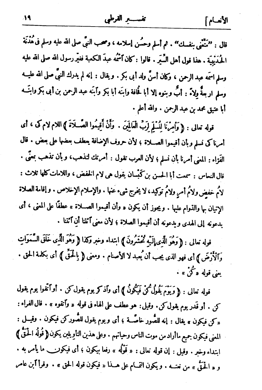 قَالَ (لَهُ) «١» " مَتِّعْنِي بِنَفْسِكَ". ثُمَّ أَسْلَمَ وَحَسُنَ إِسْلَامُهُ، وَصَحِبَ النَّبِيَّ صَلَّى اللَّهُ عَلَيْهِ وَسَلَّمَ فِي هُدْنَةِ الْحُدَيْبِيَةِ. هَذَا قَوْلُ أَهْلِ السِّيَرِ. قَالُوا: كَانَ اسْمُهُ عَبْدَ الْكَعْبَةِ فَغَيَّرَ رَسُولُ اللَّهِ صَلَّى اللَّهُ عَلَيْهِ وَسَلَّمَ اسْمَهُ عَبْدَ الرحمن، وكان أسن ولد أبي بكر. قال: إِنَّهُ لَمْ يُدْرِكِ النَّبِيَّ صَلَّى اللَّهُ عَلَيْهِ وَسَلَّمَ أَرْبَعَةُ وِلَاءٍ: أَبٌ وَبَنُوهُ إِلَّا أَبَا قُحَافَةَ وَابْنَهُ أَبَا بَكْرٍ وَابْنَهُ عَبْدَ الرَّحْمَنِ بْنَ أَبِي بَكْرٍ وَابْنَهُ أَبَا عَتِيقٍ مُحَمَّدَ بْنَ عَبْدِ الرَّحْمَنِ. وَاللَّهُ أَعْلَمُ. قَوْلُهُ تَعَالَى: (وَأُمِرْنا لِنُسْلِمَ لِرَبِّ الْعالَمِينَ وَأَنْ أَقِيمُوا الصَّلاةَ وَاتَّقُوهُ) اللَّامُ لَامُ كَيْ، أَيْ أُمِرْنَا كَيْ نُسْلِمَ وَبِأَنْ أَقِيمُوا الصَّلَاةَ، لِأَنَّ حُرُوفَ الْإِضَافَةِ يُعْطَفُ بَعْضُهَا عَلَى بَعْضٍ. قَالَ الْفَرَّاءُ: الْمَعْنَى أُمِرْنَا بِأَنْ نُسْلِمَ، لِأَنَّ الْعَرَبَ تَقُولُ: أَمَرْتُكَ لِتَذْهَبَ، وَبِأَنْ تَذْهَبَ بِمَعْنًى. قَالَ النَّحَّاسُ: سَمِعْتُ أَبَا الْحَسَنِ بْنَ كَيْسَانَ يَقُولُ هِيَ لَامُ الْخَفْضِ، وَاللَّامَاتُ كُلُّهَا ثَلَاثٌ: لَامُ خَفْضٍ وَلَامُ أمر ولام توكيد، لا يخرج شي عنها. والإسلام الإخلاص. وَإِقَامَةُ الصَّلَاةِ الْإِتْيَانُ بِهَا وَالدَّوَامُ عَلَيْهَا. وَيَجُوزُ أَنْ يَكُونَ" وَأَنْ أَقِيمُوا الصَّلاةَ" عَطْفًا عَلَى الْمَعْنَى، أَيْ يَدْعُونَهُ إِلَى الْهُدَى وَيَدْعُونَهُ أَنْ أَقِيمُوا الصَّلَاةَ، لِأَنَّ مَعْنَى ائْتِنَا أَنِ ائْتِنَا. قَوْلُهُ تَعَالَى: (وَهُوَ الَّذِي إِلَيْهِ تُحْشَرُونَ) ابْتِدَاءٌ وخبر وكذا (هُوَ الَّذِي خَلَقَ السَّماواتِ وَالْأَرْضَ) أَيْ فَهُوَ الَّذِي يَجِبُ أَنْ يُعْبَدَ لَا الْأَصْنَامُ. وَمَعْنَى (بِالْحَقِّ) أَيْ بِكَلِمَةِ الْحَقِّ. يَعْنِي قَوْلَهُ" كُنْ". قَوْلُهُ تَعَالَى: (وَيَوْمَ يَقُولُ كُنْ فَيَكُونُ) أَيْ وَاذْكُرْ يَوْمَ يَقُولُ كُنْ. أَوِ اتَّقُوا يَوْمَ يَقُولُ كن. أو قدر يَوْمَ يَقُولُ كُنْ. أَوْ قَدِّرْ يَوْمَ يَقُولُ كُنْ. وَقِيلَ: هُوَ عَطْفٌ عَلَى الْهَاءِ فِي قول:" وَاتَّقُوهُ" قَالَ الْفَرَّاءُ:" كُنْ فَيَكُونُ" يُقَالُ: إِنَّهُ لِلصُّوَرِ خَاصَّةً، أَيْ وَيَوْمُ يَقُولُ لِلصُّوَرِ كُنْ فَيَكُونُ. وَقِيلَ: الْمَعْنَى فَيَكُونُ جَمِيعُ مَا أَرَادَ مِنْ مَوْتِ النَّاسِ وَحَيَاتِهِمْ. وَعَلَى هَذَيْنِ التَّأْوِيلَيْنِ يكون (قَوْلُهُ الْحَقُّ) ابتداء وخبرا. وقيل: إن قول تعالى:" قَوْلُهُ" رفع بيكون، أي فيكون ما يأمر به." الْحَقُّ" مِنْ نَعْتِهِ. وَيَكُونُ التَّمَامُ عَلَى هَذَا" فَيَكُونُ قوله الحق". وقرأ ابن عامر
