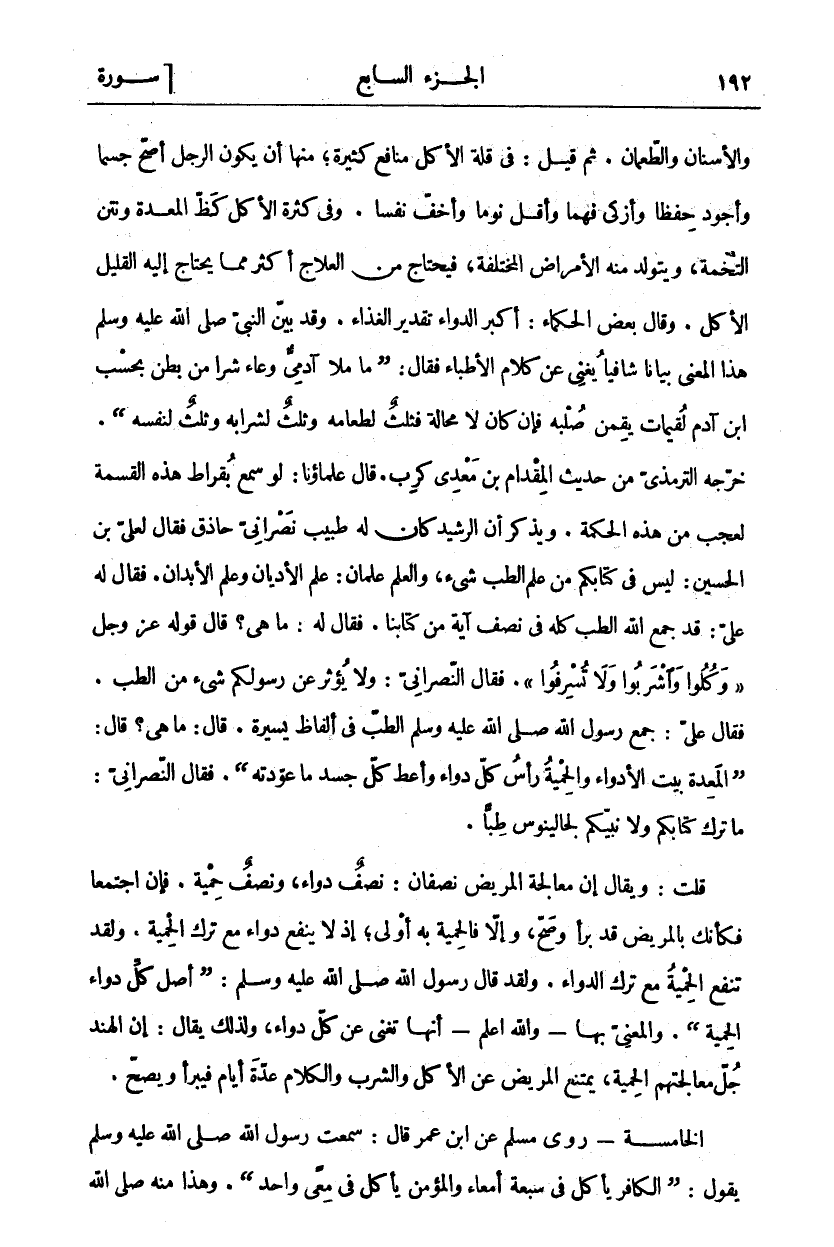 وَالْأَسْنَانِ وَالطُّعْمَانِ. ثُمَّ قِيلَ: فِي قِلَّةِ الْأَكْلِ مَنَافِعُ كَثِيرَةٌ، مِنْهَا أَنْ يَكُونَ الرَّجُلُ أَصَحَّ جِسْمًا وَأَجْوَدَ حِفْظًا وَأَزْكَى فَهْمًا وَأَقَلَّ نَوْمًا وَأَخَفَّ نَفْسًا. وَفِي كَثْرَةِ الْأَكْلِ كَظُّ الْمَعِدَةِ وَنَتَنُ التُّخْمَةِ «١»، وَيَتَوَلَّدُ مِنْهُ الْأَمْرَاضُ الْمُخْتَلِفَةُ، فَيَحْتَاجُ مِنَ الْعِلَاجِ أَكْثَرَ مِمَّا يَحْتَاجُ إِلَيْهِ الْقَلِيلُ الْأَكْلِ. وَقَالَ بَعْضُ الْحُكَمَاءِ: أَكْبَرُ الدَّوَاءِ تَقْدِيرُ الْغِذَاءِ. وَقَدْ بَيَّنَ النَّبِيُّ صَلَّى اللَّهُ عَلَيْهِ وَسَلَّمَ هَذَا الْمَعْنَى بَيَانًا شَافِيًا يُغْنِي عَنْ كَلَامِ الْأَطِبَّاءِ فَقَالَ: (مَا مَلَأَ آدَمِيٌّ وِعَاءً شَرًّا مِنْ بَطْنٍ بِحَسْبِ ابْنِ آدَمَ لُقَيْمَاتٍ يُقِمْنَ صُلْبَهُ فَإِنْ كَانَ لَا مَحَالَةَ فَثُلُثٌ لِطَعَامِهِ وَثُلُثٌ لِشَرَابِهِ وَثُلُثٌ لِنَفَسِهِ (. خَرَّجَهُ التِّرْمِذِيُّ مِنْ حَدِيثِ الْمِقْدَامِ بْنِ مَعْدِي كَرِبَ. قَالَ عُلَمَاؤُنَا: لَوْ سَمِعَ بُقْرَاطُ هَذِهِ الْقِسْمَةَ لَعَجِبَ مِنْ هَذِهِ الْحِكْمَةِ. وَيُذْكَرُ أَنَّ الرَّشِيدَ كَانَ لَهُ طَبِيبٌ نَصْرَانِيٌّ حَاذِقٌ فَقَالَ لِعَلِيِّ بْنِ الْحُسَيْنِ: لَيْسَ فِي كِتَابِكُمْ مِنْ عِلْمِ الطب شي، وَالْعِلْمُ عِلْمَانِ: عِلْمُ الْأَدْيَانِ وَعِلْمُ الْأَبَدَانِ. فَقَالَ لَهُ عَلِيٌّ: قَدْ جَمَعَ اللَّهُ الطِّبَّ كُلَّهُ فِي نِصْفِ آيَةٍ مِنْ كِتَابِنَا. فَقَالَ لَهُ: مَا هِيَ؟ قَالَ قَوْلُهُ عَزَّ وَجَلَّ:" وَكُلُوا وَاشْرَبُوا وَلا تُسْرِفُوا". فَقَالَ النَّصْرَانِيُّ: وَلَا يُؤْثَرُ عن رسولكم شي مِنَ الطِّبِّ. فَقَالَ عَلِيٌّ: جَمَعَ رَسُولُ اللَّهِ صَلَّى اللَّهُ عَلَيْهِ وَسَلَّمَ الطِّبَّ فِي أَلْفَاظٍ يَسِيرَةٍ «٢». قَالَ: مَا هِيَ؟ قَالَ: (الْمَعِدَةُ بَيْتُ الْأَدْوَاءِ وَالْحِمْيَةُ رَأْسُ كُلِّ دَوَاءٍ وَأَعْطِ كُلَّ جَسَدٍ مَا عَوَّدْتَهُ). فَقَالَ النَّصْرَانِيُّ: مَا تَرَكَ كِتَابُكُمْ وَلَا نَبِيُّكُمْ لِجَالِينُوسَ طِبًّا. قُلْتُ: وَيُقَالُ إِنَّ مُعَالَجَةَ الْمَرِيضِ نِصْفَانِ: نِصْفٌ دَوَاءٌ وَنِصْفٌ حمية: فإن اجتمعا فكأنك بالمريض قد برأ وصح. وإلا فالحمية به أولى، إذ يَنْفَعُ دَوَاءٌ مَعَ تَرْكِ الْحِمْيَةِ. وَلَقَدْ تَنْفَعُ الْحِمْيَةُ مَعَ تَرْكِ الدَّوَاءِ. وَلَقَدْ قَالَ رَسُولُ اللَّهِ صَلَّى اللَّهُ عَلَيْهِ وَسَلَّمَ: (أَصْلُ كُلِّ دَوَاءٍ الْحِمْيَةُ). وَالْمَعْنِيُّ بِهَا- وَاللَّهُ أَعْلَمُ- أَنَّهَا تُغْنِي عَنْ كُلِّ دَوَاءٍ، وَلِذَلِكَ يُقَالُ: إِنَّ الْهِنْدَ جُلُّ مُعَالَجَتِهِمُ الْحِمْيَةُ، يَمْتَنِعُ الْمَرِيضُ عَنِ الْأَكْلِ وَالشَّرَابِ وَالْكَلَامِ عِدَّةَ أَيَّامٍ فَيَبْرَأُ وَيَصِحُّ. الْخَامِسَةُ- رَوَى مُسْلِمٌ عَنِ ابْنِ عُمَرَ قَالَ: سَمِعْتُ رَسُولَ اللَّهِ صَلَّى اللَّهُ عَلَيْهِ وَسَلَّمَ يَقُولُ: (الْكَافِرُ يَأْكُلُ فِي سَبْعَةِ أَمْعَاءٍ وَالْمُؤْمِنُ يَأْكُلُ فِي مِعًى وَاحِدٍ). وَهَذَا مِنْهُ صَلَّى الله