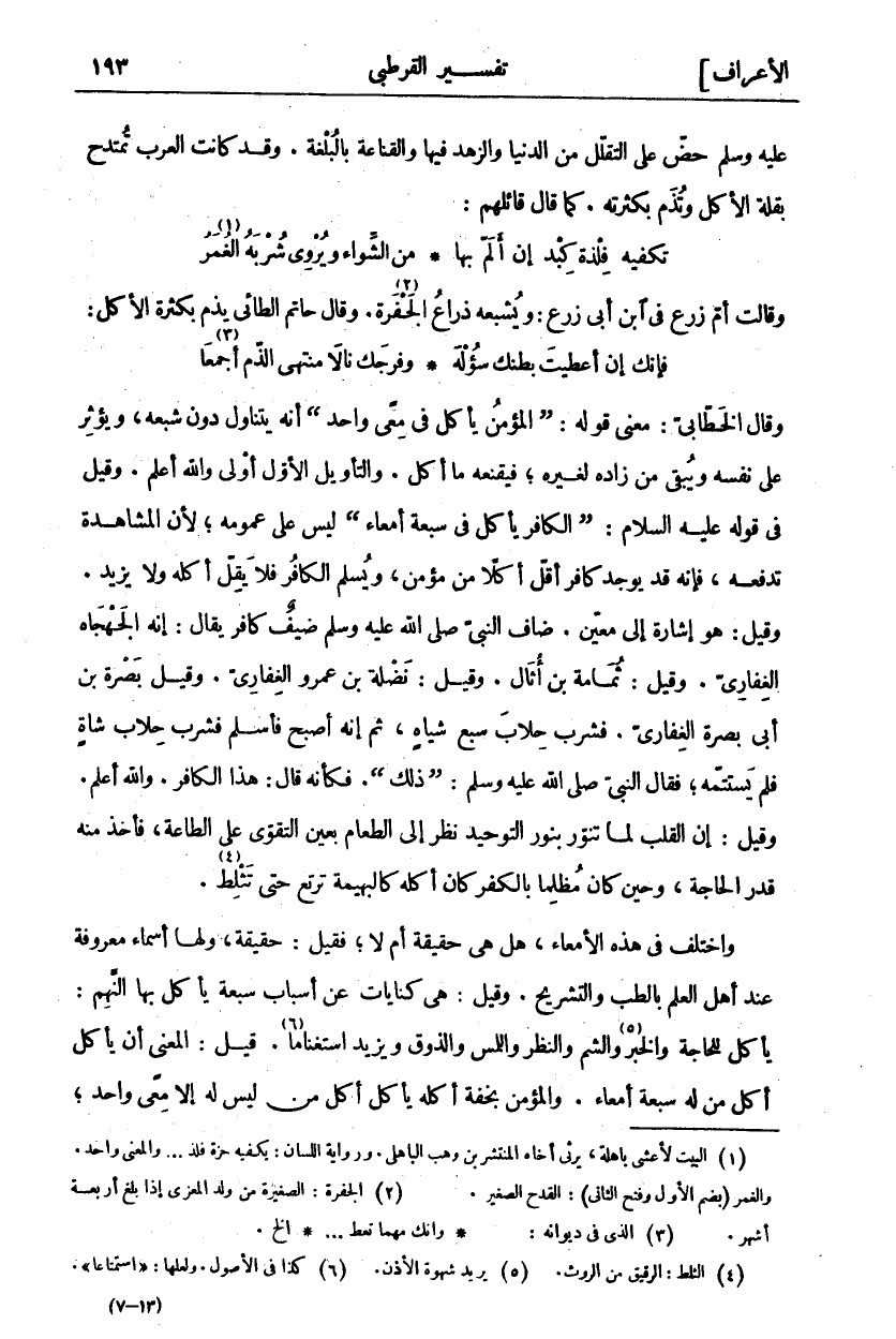 وقال الخطاب: مَعْنَى قَوْلِهِ (صَلَّى اللَّه عَلَيْهِ وَسَلَّمَ «٥»): الْمُؤْمِنُ يَأْكُلُ فِي مِعًى وَاحِدٍ أَنَّهُ يَتَنَاوَلُ دُونَ شِبَعِهِ، وَيُؤْثِرُ عَلَى نَفْسِهِ وَيُبْقِي مِنْ زَادِهِ لِغَيْرِهِ، فَيُقْنِعُهُ مَا أَكَلَ. وَالتَّأْوِيلُ الْأَوَّلُ أَوْلَى وَاللَّهُ أَعْلَمُ. وَقِيلَ فِي قَوْلِهِ عَلَيْهِ السَّلَامُ: (وَالْكَافِرُ يَأْكُلُ فِي سَبْعَةِ أَمْعَاءٍ) لَيْسَ عَلَى عُمُومِهِ، لِأَنَّ الْمُشَاهَدَةَ تَدْفَعُهُ، فَإِنَّهُ قَدْ يُوجَدُ كَافِرٌ أَقَلُّ أَكْلًا مِنْ مُؤْمِنٍ، وَيُسْلِمُ الْكَافِرُ فَلَا يَقِلُّ أَكْلُهُ وَلَا يَزِيدُ. وَقِيلَ: هُوَ إِشَارَةٌ إِلَى مُعَيَّنٍ. ضَافَ النَّبِيَّ صَلَّى اللَّهُ عَلَيْهِ وَسَلَّمَ ضَيْفٌ كَافِرٌ يُقَالُ: إِنَّهُ الْجَهْجَاهُ الْغِفَارِيُّ. وَقِيلَ: ثُمَامَةُ بْنُ أَثَالٍ. وَقِيلَ: نَضْلَةُ بْنُ عَمْرٍو الْغِفَارِيُّ. وَقِيلَ: بَصْرَةُ بْنُ أَبِي بَصْرَةَ الْغِفَارِيُّ. فَشَرِبَ حِلَابَ سَبْعِ شِيَاهٍ، ثُمَّ إِنَّهُ أَصْبَحَ فَأَسْلَمَ فَشَرِبَ حِلَابَ شَاةٍ فَلَمْ يَسْتَتِمَّهُ، فَقَالَ النَّبِيُّ صَلَّى اللَّهُ عَلَيْهِ وَسَلَّمَ ذَلِكَ. فَكَأَنَّهُ قَالَ: هَذَا الْكَافِرُ. وَاللَّهُ أَعْلَمُ. وَقِيلَ: إِنَّ الْقَلْبَ لَمَّا تَنَوَّرَ بِنُورِ التَّوْحِيدِ نَظَرَ إِلَى الطَّعَامِ بِعَيْنِ التَّقَوِّي عَلَى الطَّاعَةِ، فَأَخَذَ مِنْهُ قَدْرَ الْحَاجَةِ، وَحِينَ كَانَ مُظْلِمًا بِالْكُفْرِ كَانَ أَكْلُهُ كَالْبَهِيمَةِ تَرْتَعُ حَتَّى تَثْلِطَ «٦». وَاخْتُلِفَ فِي هَذِهِ الْأَمْعَاءِ، هَلْ هِيَ حَقِيقَةٌ أم لا؟ فقبل حَقِيقَةٌ، وَلَهَا أَسْمَاءٌ مَعْرُوفَةٌ عِنْدَ أَهْلِ الْعِلْمِ بِالطِّبِّ وَالتَّشْرِيحِ. وَقِيلَ: هِيَ كِنَايَاتٌ عَنْ أَسْبَابٍ سَبْعَةٍ يَأْكُلُ بِهَا النَّهِمُ: يَأْكُلُ لِلْحَاجَةِ وَالْخَبَرِ «٧» وَالشَّمِّ وَالنَّظَرِ وَاللَّمْسِ وَالذَّوْقِ وَيَزِيدُ اسْتِغْنَامًا «٨». وَقِيلَ: الْمَعْنَى أَنْ يَأْكُلَ أَكْلَ مَنْ لَهُ سَبْعَةُ أَمْعَاءٍ. وَالْمُؤْمِنُ بِخِفَّةِ أَكْلِهِ يَأْكُلُ أَكْلَ مَنْ ليس له إلا معى واحد،
