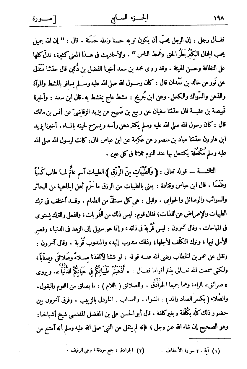 فَقَالَ رَجُلٌ: إِنَّ الرَّجُلَ يُحِبُّ أَنْ يَكُونَ ثَوْبُهُ حَسَنًا وَنَعْلُهُ حَسَنَةً. قَالَ: (إِنَّ اللَّهَ جَمِيلٌ يُحِبُّ الْجَمَالَ الْكِبْرُ بَطَرُ الْحَقِّ وَغَمْطُ النَّاسِ). وَالْأَحَادِيثُ فِي هَذَا الْمَعْنَى كَثِيرَةٌ، تَدُلُّ كُلُّهَا عَلَى النَّظَافَةِ وَحُسْنِ الْهَيْئَةِ. وَقَدْ رَوَى مُحَمَّدُ بْنُ سَعْدٍ أَخْبَرَنَا الْفَضْلُ بْنُ دُكَيْنٍ قَالَ حَدَّثَنَا مَنْدَلٌ عَنْ ثَوْرٍ عَنْ خَالِدِ بْنِ مَعْدَانَ قَالَ: كَانَ رَسُولُ اللَّهِ صَلَّى اللَّهُ عَلَيْهِ وَسَلَّمَ يُسَافِرُ بِالْمُشْطِ وَالْمِرْآةِ وَالدُّهْنِ وَالسِّوَاكِ وَالْكُحْلِ. وَعَنِ ابْنِ جُرَيْجٍ: مُشْطٌ عَاجٌ يَمْتَشِطُ بِهِ. قَالَ ابْنُ سَعْدٍ: وَأَخْبَرَنَا قَبِيصَةُ بْنُ عُقْبَةَ قَالَ حَدَّثَنَا سُفْيَانُ عَنْ رَبِيعِ بْنِ صُبَيْحٍ عَنْ يَزِيدَ الرَّقَاشِيِّ عَنْ أَنَسِ بْنِ مَالِكٍ قَالَ: كَانَ رَسُولُ اللَّهِ صَلَّى اللَّهُ عَلَيْهِ وَسَلَّمَ يُكْثِرُ دَهْنَ رَأْسِهِ وَيُسَرِّحُ لِحْيَتَهُ بِالْمَاءِ. أَخْبَرَنَا يَزِيدُ بْنُ هَارُونَ حَدَّثَنَا عَبَّادُ بْنُ مَنْصُورٍ عَنْ عِكْرِمَةَ عَنِ ابْنِ عَبَّاسٍ قَالَ: كَانَتْ لِرَسُولِ اللَّهِ صَلَّى اللَّهُ عَلَيْهِ وَسَلَّمَ مُكْحُلَةٌ يَكْتَحِلُ بِهَا عِنْدَ النَّوْمِ ثَلَاثًا فِي كُلِّ عَيْنٍ. الثَّالِثَةُ- قَوْلُهُ تَعَالَى: (وَالطَّيِّباتِ مِنَ الرِّزْقِ) الطَّيِّبَاتُ اسْمٌ عَامٌّ لِمَا طَابَ كَسْبًا وَطَعْمًا. قَالَ ابْنُ عَبَّاسٍ وَقَتَادَةُ: يَعْنِي بِالطَّيِّبَاتِ مِنَ الرِّزْقِ مَا حَرَّمَ أَهْلُ الْجَاهِلِيَّةِ مِنَ الْبَحَائِرِ وَالسَّوَائِبِ وَالْوَصَائِلِ وَالْحَوَامِي. وَقِيلَ: هِيَ كُلُّ مُسْتَلَذٍّ مِنَ الطَّعَامِ. وَقَدِ اخْتُلِفَ فِي تَرْكِ الطَّيِّبَاتِ وَالْإِعْرَاضِ عَنِ اللَّذَّاتِ، فَقَالَ قَوْمٌ: لَيْسَ ذَلِكَ مِنَ الْقُرُبَاتِ، وَالْفِعْلُ وَالتَّرْكُ يَسْتَوِي فِي الْمُبَاحَاتِ. وَقَالَ آخَرُونَ: لَيْسَ قُرْبَةً فِي ذَاتِهِ، وَإِنَّمَا هُوَ سَبِيلٌ إِلَى الزُّهْدِ فِي الدُّنْيَا، وَقِصَرِ الْأَمَلِ فِيهَا، وَتَرْكِ التَّكَلُّفِ لِأَجْلِهَا، وَذَلِكَ مَنْدُوبٌ إِلَيْهِ، وَالْمَنْدُوبُ قُرْبَةٌ. وَقَالَ آخَرُونَ: وَنُقِلَ عَنْ عُمَرَ بْنِ الْخَطَّابِ رَضِيَ اللَّهُ عَنْهُ قَوْلُهُ: لَوْ شِئْنَا لَاتَّخَذْنَا صِلَاءً وَصَلَائِقَ وَصِنَابًا، وَلَكِنِّي سَمِعْتُ اللَّهَ تَعَالَى يَذُمُّ أَقْوَامًا فَقَالَ:" أَذْهَبْتُمْ طَيِّباتِكُمْ فِي حَياتِكُمُ الدُّنْيا «١» " وَيُرْوَى" صَرَائِقُ" بِالرَّاءِ، وَهُمَا جَمِيعًا الْجَرَادِقُ «٢». وَالصَّلَائِقُ (باللام): ما يلصق مِنَ اللُّحُومِ وَالْبُقُولِ. وَالصِّلَاءُ (بِكَسْرِ الصَّادِ وَالْمَدِّ): الشِّوَاءُ: وَالصِّنَابُ: الْخَرْدَلُ بِالزَّبِيبِ. وَفَرَّقَ آخَرُونَ بَيْنَ حُضُورِ ذَلِكَ كُلِّهِ بِكُلْفَةٍ وَبِغَيْرِ كُلْفَةٍ. قَالَ أَبُو الْحَسَنِ عَلِيُّ بْنُ الْمُفَضَّلِ الْمَقْدِسِيُّ شَيْخُ أشياخنا: وهو الصحيح أشاء اللَّهُ عَزَّ وَجَلَّ، فَإِنَّهُ لَمْ يُنْقَلْ عَنِ النَّبِيِّ صَلَّى اللَّهُ عَلَيْهِ وَسَلَّمَ أَنَّهُ امْتَنَعَ من