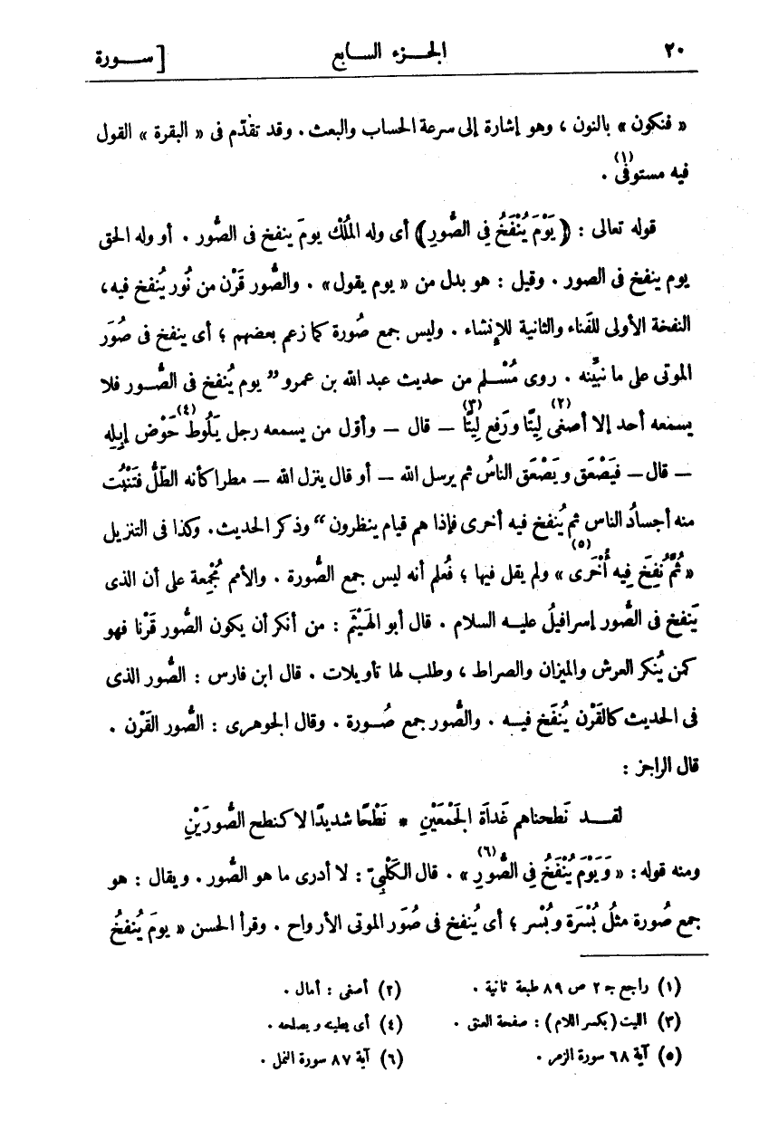 ومنه قول:" وَيَوْمَ يُنْفَخُ فِي الصُّورِ «٧» ". قَالَ الْكَلْبِيُّ: لَا أَدْرِي مَا هُوَ الصُّورُ. وَيُقَالُ: هُوَ جَمْعُ صُورَةٍ مِثْلَ بُسْرَةٍ وَبُسْرٍ، أَيْ يُنْفَخُ فِي صُوَرِ الْمَوْتَى وَالْأَرْوَاحِ. وَقَرَأَ الْحَسَنُ" يَوْمَ يُنْفَخُ