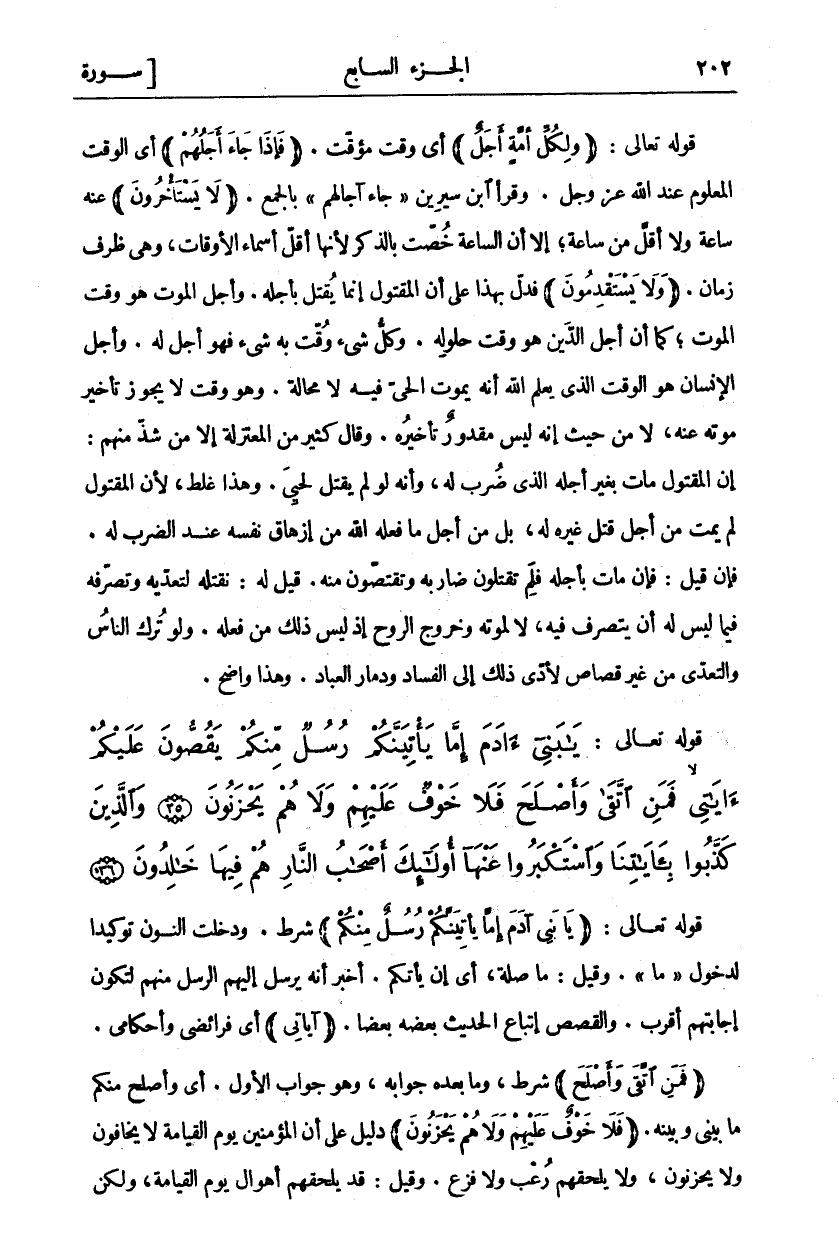 قَوْلُهُ تَعَالَى: (يا بَنِي آدَمَ إِمَّا يَأْتِيَنَّكُمْ رُسُلٌ مِنْكُمْ) شَرْطٌ. وَدَخَلَتِ النُّونُ تَوْكِيدًا لِدُخُولِ" مَا". وَقِيلَ: مَا صِلَةٌ، أَيْ إِنْ يَأْتِكُمْ. أَخْبَرَ أَنَّهُ يُرْسِلُ إِلَيْهِمُ الرُّسُلَ مِنْهُمْ لِتَكُونَ إِجَابَتُهُمْ أَقْرَبَ. وَالْقَصَصُ إِتْبَاعُ الْحَدِيثِ بَعْضَهُ بَعْضًا. (آياتِي) أَيْ فَرَائِضِي وَأَحْكَامِي. فَمَنِ اتَّقَى وَأَصْلَحَ شَرْطٌ، وَمَا بَعْدَهُ جَوَابُهُ، وَهُوَ جَوَابُ الْأَوَّلِ. أَيْ وَأَصْلَحَ مِنْكُمْ مَا بيني وبينه. فلا خوف عليهم ولاهم يَحْزَنُونَ دَلِيلٌ عَلَى أَنَّ الْمُؤْمِنِينَ يَوْمَ الْقِيَامَةِ لَا يَخَافُونَ وَلَا يَحْزَنُونَ، وَلَا يَلْحَقُهُمْ رُعْبٌ وَلَا فَزَعٌ. وَقِيلَ: قَدْ يَلْحَقُهُمْ أَهْوَالُ يَوْمِ القيامة، ولكن