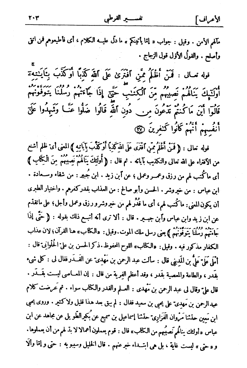 قَوْلُهُ تَعَالَى: (فَمَنْ أَظْلَمُ مِمَّنِ افْتَرى عَلَى اللَّهِ كَذِباً أَوْ كَذَّبَ بِآياتِهِ) الْمَعْنَى أَيُّ ظُلْمٍ أَشْنَعُ مِنَ الِافْتِرَاءِ عَلَى الله تعالى والتكذيب بآياته. ثم قال: (أُولئِكَ يَنالُهُمْ نَصِيبُهُمْ مِنَ الْكِتابِ) أَيْ مَا كُتِبَ لَهُمْ مِنْ رِزْقٍ وَعُمُرٍ وَعَمَلٍ، عَنِ ابْنِ زَيْدٍ. ابْنُ جُبَيْرٍ: مِنْ شَقَاءٍ وَسَعَادَةٍ. ابْنُ عَبَّاسٍ: مِنْ خَيْرٍ وَشَرٍّ. الْحَسَنُ وَأَبُو صَالِحٍ: مِنَ الْعَذَابِ بِقَدْرِ كُفْرِهِمْ. وَاخْتِيَارُ الطَّبَرِيِّ أَنْ يَكُونَ الْمَعْنَى: مَا كُتِبَ لَهُمْ، أَيْ مَا قُدِّرَ لَهُمْ مِنْ خَيْرٍ وَشَرٍّ وَرِزْقٍ وَعَمَلٍ وَأَجَلٍ، عَلَى مَا تَقَدَّمَ عَنِ ابْنِ زَيْدٍ وَابْنِ عَبَّاسٍ وَابْنِ جُبَيْرٍ. قَالَ: أَلَا تَرَى أَنَّهُ أَتْبَعَ ذَلِكَ بِقَوْلِهِ: (حَتَّى إِذا جاءَتْهُمْ رُسُلُنا يَتَوَفَّوْنَهُمْ) يَعْنِي رُسُلَ مَلَكِ الْمَوْتِ. وَقِيلَ:" الْكِتابِ" هُنَا الْقُرْآنُ، لِأَنَّ عَذَابَ الْكُفَّارِ مَذْكُورٌ فِيهِ. وَقِيلَ:" الْكِتابِ" اللَّوْحُ الْمَحْفُوظُ. ذَكَرَ الْحَسَنُ بْنُ عَلِيٍّ الْحُلْوَانِيُّ قَالَ: أَمْلَى عَلَيَّ عَلِيُّ بْنُ الْمَدِينِيِّ قَالَ: سَأَلْتُ عَبْدَ الرَّحْمَنِ بْنَ مَهْدِيٍّ عَنِ الْقَدَرِ فَقَالَ لِي: كُلُّ شي بِقَدَرٍ، وَالطَّاعَةُ وَالْمَعْصِيَةُ بِقَدَرٍ، وَقَدْ أَعْظَمَ الْفِرْيَةَ مَنْ قَالَ: إِنَّ الْمَعَاصِيَ لَيْسَتْ بِقَدَرٍ. قَالَ عَلِيٌّ وَقَالَ لِي عَبْدُ الرَّحْمَنِ بْنُ مَهْدِيٍّ: الْعِلْمُ وَالْقَدَرُ وَالْكِتَابُ سَوَاءٌ. ثُمَّ عَرَضْتُ كَلَامَ عَبْدِ الرَّحْمَنِ بْنِ مَهْدِيٍّ عَلَى يَحْيَى بْنِ سَعِيدٍ فَقَالَ: لَمْ يَبْقَ بَعْدَ هَذَا قَلِيلٌ وَلَا كَثِيرٌ. وَرَوَى يَحْيَى بْنُ مَعِينٍ حَدَّثَنَا مَرْوَانُ الْفَزَارِيُّ حَدَّثَنَا إِسْمَاعِيلُ بْنُ سُمَيْعٍ عَنْ بُكَيْرٍ الطَّوِيلِ عَنْ مُجَاهِدٍ عَنِ ابْنِ عَبَّاسٍ" أُولئِكَ يَنالُهُمْ نَصِيبُهُمْ مِنَ الْكِتابِ" قَالَ: قَوْمٌ يعملون أعمالا لأبد لَهُمْ مِنْ أَنْ يَعْمَلُوهَا. وَ" حَتَّى" لَيْسَتْ غَايَةً، بَلْ هِيَ ابْتِدَاءُ خَبَرٍ عَنْهُمْ. قَالَ الْخَلِيلُ وَسِيبَوَيْهِ: حَتَّى وَإِمَّا وَإِلَّا