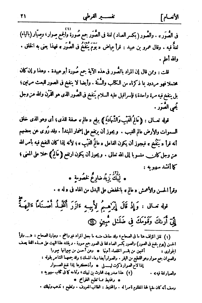 (١). نقل المؤلف هنا ما في الصحاح، وقد حذف منه ما جعل المراد غير واضح. وعبارة:" ... وقرأ الحسن (يوم ينفخ في الصور) وَالصِّوَرُ بِكَسْرِ الصَّادِ لُغَةٌ فِي الصُّوَرِ جَمْعُ صُورَةٍ. ينشد هَذَا الْبَيْتُ عَلَى هَذِهِ اللُّغَةِ يَصِفُ الْجَوَارِيَ: