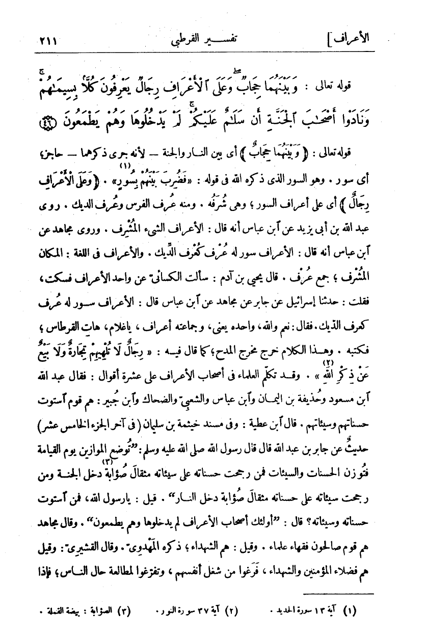 أَيْ بَيْنَ النَّارِ وَالْجَنَّةِ- لِأَنَّهُ جَرَى ذِكْرُهُمَا- حاجز، أسور. وَهُوَ السُّورُ الَّذِي ذَكَرَهُ اللَّهُ فِي قَوْلِهِ:" فَضُرِبَ بَيْنَهُمْ بِسُورٍ «١» ". (وَعَلَى الْأَعْرافِ رِجالٌ) أَيْ عَلَى أَعْرَافِ السُّورِ، وَهِيَ شُرَفُهُ. وَمِنْهُ عُرْفُ الْفَرَسِ وَعُرْفُ الدِّيكِ. رَوَى عَبْدُ اللَّهِ بْنُ أَبِي «٢» يَزِيدَ عَنِ ابْنِ عَبَّاسٍ أَنَّهُ قَالَ: الْأَعْرَافُ الشَّيْءُ الْمُشْرِفُ. وَرَوَى مُجَاهِدٌ عَنِ ابْنِ عَبَّاسٍ أَنَّهُ قَالَ: الْأَعْرَافُ سُورٌ لَهُ عُرْفٌ كَعُرْفِ الدِّيكِ. وَالْأَعْرَافُ فِي اللُّغَةِ: الْمَكَانُ الْمُشْرِفُ، جَمْعُ عُرْفٍ. قَالَ يَحْيَى بْنُ آدَمَ: سَأَلْتُ الْكِسَائِيَّ عَنْ وَاحِدِ الْأَعْرَافِ فَسَكَتَ، فَقُلْتُ: حَدَّثَنَا إِسْرَائِيلُ عَنْ جَابِرٍ عَنْ مُجَاهِدٍ عَنِ ابْنِ عَبَّاسٍ قَالَ: الْأَعْرَافُ سُورٌ لَهُ عُرْفٌ كَعُرْفِ الدِّيكِ. فَقَالَ: نَعَمْ وَاللَّهِ، وَاحِدُهُ يَعْنِي، وَجَمَاعَتُهُ أَعْرَافٌ، يَا غُلَامُ، هَاتِ الْقِرْطَاسَ، فَكَتَبَهُ. وَهَذَا الْكَلَامُ خَرَجَ مَخْرَجَ. الْمَدْحِ، كَمَا قَالَ فِيهِ:" رِجالٌ لَا تُلْهِيهِمْ تِجارَةٌ وَلا بَيْعٌ عَنْ ذِكْرِ اللَّهِ «٣» " وَقَدْ تَكَلَّمَ الْعُلَمَاءُ فِي أَصْحَابِ الْأَعْرَافِ عَلَى عَشَرَةِ أَقْوَالٍ: فَقَالَ عَبْدُ اللَّهِ بْنُ مَسْعُودٍ وَحُذَيْفَةُ بْنُ الْيَمَانِ وَابْنُ عَبَّاسٍ وَالشَّعْبِيُّ وَالضَّحَّاكُ وَابْنُ جُبَيْرٍ: هُمْ قَوْمٌ اسْتَوَتْ حَسَنَاتُهُمْ وَسَيِّئَاتُهُمْ. قَالَ ابْنُ عَطِيَّةَ: وَفِي مُسْنَدِ خَيْثَمَةَ بْنِ سُلَيْمَانَ (فِي آخِرِ الْجُزْءِ الْخَامِسَ عَشَرَ) حَدِيثٌ عَنْ جَابِرِ بْنِ عَبْدِ اللَّهِ قَالَ قَالَ رَسُولُ الله صَلَّى اللَّهُ عَلَيْهِ وَسَلَّمَ: (تُوضَعُ الْمَوَازِينُ يَوْمَ الْقِيَامَةِ فَتُوزَنُ الْحَسَنَاتُ وَالسَّيِّئَاتُ فَمَنْ رَجَحَتْ حَسَنَاتُهُ عَلَى سَيِّئَاتِهِ مِثْقَالَ صوابه «٤» دَخَلَ الْجَنَّةَ وَمَنْ رَجَحَتْ سَيِّئَاتُهُ عَلَى حَسَنَاتِهِ مثقال صوابه دخل النار). قيل: يا وسول اللَّهِ، فَمَنِ اسْتَوَتْ حَسَنَاتُهُ وَسَيِّئَاتُهُ؟ قَالَ: (أُولَئِكَ أَصْحَابُ الْأَعْرَافِ) (لَمْ يَدْخُلُوها وَهُمْ يَطْمَعُونَ). وَقَالَ مُجَاهِدٌ: هُمْ قَوْمٌ صَالِحُونَ فُقَهَاءُ عُلَمَاءُ. وَقِيلَ: هُمُ الشُّهَدَاءُ، ذَكَرَهُ الْمَهْدَوِيُّ. وَقَالَ الْقُشَيْرِيُّ: وَقِيلَ هُمْ فُضَلَاءُ الْمُؤْمِنِينَ وَالشُّهَدَاءِ، فَرَغُوا مِنْ شَغْلِ أنفسهم، وتفرغوا لمطالعة حال الناس، فإذا
