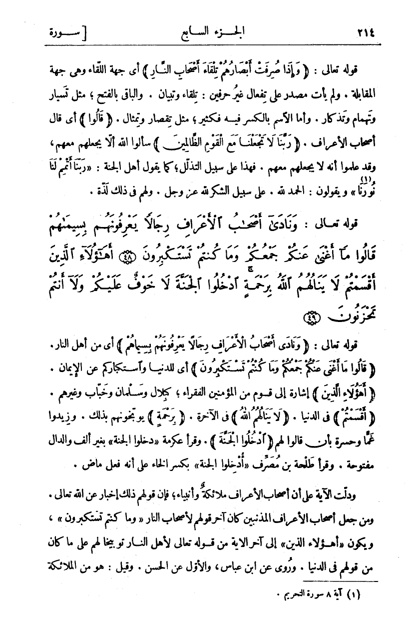 قَوْلُهُ تَعَالَى: (وَنادى أَصْحابُ الْأَعْرافِ رِجالًا يَعْرِفُونَهُمْ بِسِيماهُمْ) أَيْ مِنْ أَهْلِ النَّارِ. (قالُوا مَا أَغْنى عَنْكُمْ جَمْعُكُمْ وَما كُنْتُمْ تَسْتَكْبِرُونَ) أَيْ لِلدُّنْيَا وَاسْتِكْبَارُكُمْ عَنِ الْإِيمَانِ. (أَهؤُلاءِ الَّذِينَ) إِشَارَةٌ إِلَى قَوْمٍ مِنَ الْمُؤْمِنِينَ الْفُقَرَاءِ، كَبِلَالٍ وَسَلْمَانَ وَخَبَّابٍ وَغَيْرِهِمْ. (أَقْسَمْتُمْ) فِي الدُّنْيَا. (لَا يَنالُهُمُ اللَّهُ) فِي الْآخِرَةِ. (بِرَحْمَةٍ) يُوَبِّخُونَهُمْ بِذَلِكَ. وَزِيدُوا غَمًّا وَحَسْرَةً بِأَنْ قَالُوا لَهُمْ (ادْخُلُوا الْجَنَّةَ) وَقَرَأَ عِكْرِمَةُ" دَخَلُوا الْجَنَّةَ" بِغَيْرِ أَلِفٍ وَالدَّالُ مَفْتُوحَةٌ. وَقَرَأَ طَلْحَةُ بْنُ مُصَرِّفٍ" أُدْخِلُوا الْجَنَّةَ" بِكَسْرِ الْخَاءِ عَلَى أَنَّهُ فِعْلٌ مَاضٍ «٣». وَدَلَّتِ الْآيَةُ عَلَى أَنَّ أَصْحَابَ الْأَعْرَافِ مَلَائِكَةٌ أَوْ أَنْبِيَاءُ، فَإِنَّ قَوْلَهُمْ ذَلِكَ إِخْبَارٌ عَنِ اللَّهِ تَعَالَى وَمَنْ جَعَلَ أَصْحَابَ الْأَعْرَافِ الْمُذْنِبِينَ كَانَ آخِرَ قَوْلِهِمْ لِأَصْحَابِ النَّارِ" وَما كُنْتُمْ تَسْتَكْبِرُونَ" وَيَكُونُ" أَهؤُلاءِ الَّذِينَ" إِلَى آخِرِ الْآيَةِ مِنْ قَوْلِ اللَّهِ تَعَالَى لِأَهْلِ النَّارِ تَوْبِيخًا لَهُمْ عَلَى مَا كَانَ مِنْ قَوْلِهِمْ فِي الدُّنْيَا. وَرُوِيَ عَنِ ابْنِ عَبَّاسٍ، وَالْأَوَّلُ عَنِ الحسن. وقيل: هو من كلام الملائكة