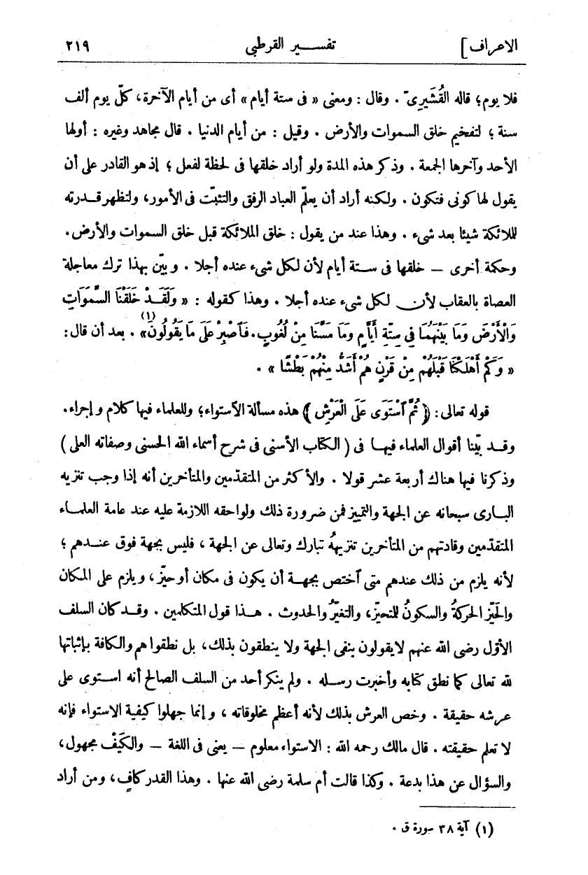 سادتا أيدل مِنَ السِّينِ تَاءً. وَالْيَوْمُ: مِنْ طُلُوعِ الشَّمْسِ إِلَى غُرُوبِهَا. فَإِنْ لَمْ يَكُنْ شَمْسٌ فَلَا يَوْمَ، قَالَ الْقُشَيْرِيُّ. وَقَالَ: وَمَعْنَى (فِي سِتَّةِ أَيَّامٍ) أَيْ مِنْ أَيَّامِ الْآخِرَةِ، كُلَّ يَوْمٍ أَلْفَ سَنَةٍ، لِتَفْخِيمِ خَلْقِ السَّمَاوَاتِ وَالْأَرْضِ. وَقِيلَ: مِنْ أَيَّامِ الدُّنْيَا. قَالَ مُجَاهِدٌ وَغَيْرُهُ: أَوَّلُهَا الْأَحَدُ وَآخِرُهَا الْجُمُعَةُ. وَذَكَرَ هَذِهِ الْمُدَّةَ وَلَوْ أَرَادَ خَلْقَهَا فِي لَحْظَةٍ لَفَعَلَ، إِذْ هُوَ الْقَادِرُ عَلَى أَنْ يَقُولَ لَهَا كُونِي فَتَكُونُ. وَلَكِنَّهُ أَرَادَ أَنْ يُعَلِّمَ الْعِبَادَ الرِّفْقَ وَالتَّثَبُّتَ فِي الْأُمُورِ، وَلِتَظْهَرَ قُدْرَتُهُ لِلْمَلَائِكَةِ شَيْئًا بَعْدَ شي. وَهَذَا عِنْدَ مَنْ يَقُولُ: خَلَقَ الْمَلَائِكَةَ قَبْلَ خَلْقِ السَّمَاوَاتِ وَالْأَرْضِ. وَحِكْمَةٌ أُخْرَى- خَلَقَهَا فِي ستة أيام لأن لكل شي عِنْدَهُ أَجَلًا. وَبَيَّنَ بِهَذَا تَرْكَ مُعَاجَلَةِ الْعُصَاةِ بالعقاب، لأن لكل شي عنده أجلا. وهذا كقول: (وَلَقَدْ خَلَقْنَا السَّماواتِ وَالْأَرْضَ وَما بَيْنَهُما فِي سِتَّةِ أَيَّامٍ وَما مَسَّنا مِنْ لُغُوبٍ. فَاصْبِرْ عَلى مَا يَقُولُونَ «١»). بَعْدَ أَنْ قَالَ:" وَكَمْ أَهْلَكْنا قَبْلَهُمْ مِنْ قَرْنٍ هُمْ أَشَدُّ مِنْهُمْ بَطْشاً" قَوْلُهُ تَعَالَى: (ثُمَّ اسْتَوى عَلَى الْعَرْشِ) هَذِهِ مَسْأَلَةُ الِاسْتِوَاءِ، وَلِلْعُلَمَاءِ فِيهَا كَلَامٌ وَإِجْرَاءٌ. وَقَدْ بَيَّنَّا أَقْوَالَ الْعُلَمَاءِ فِيهَا فِي الْكِتَابِ (الْأَسْنَى فِي شَرْحِ أَسْمَاءِ اللَّهِ الْحُسْنَى وَصِفَاتِهِ الْعُلَى) وَذَكَرْنَا فِيهَا هُنَاكَ أَرْبَعَةَ عَشَرَ قَوْلًا. وَالْأَكْثَرُ مِنَ الْمُتَقَدِّمِينَ وَالْمُتَأَخِّرِينَ أَنَّهُ إِذَا وَجَبَ تَنْزِيهُ الْبَارِي سُبْحَانَهُ عَنِ الْجِهَةِ وَالتَّحَيُّزِ فَمِنْ ضَرُورَةِ ذَلِكَ وَلَوَاحِقِهِ اللَّازِمَةِ عَلَيْهِ عِنْدَ عَامَّةِ الْعُلَمَاءِ الْمُتَقَدِّمِينَ وَقَادَتِهِمْ مِنَ الْمُتَأَخِّرِينَ تَنْزِيهُهُ تَبَارَكَ وَتَعَالَى عَنِ الْجِهَةِ، فَلَيْسَ بِجِهَةِ فَوْقٍ عِنْدَهُمْ، لِأَنَّهُ يَلْزَمُ مِنْ ذَلِكَ عِنْدَهُمْ مَتَى اخْتَصَّ بِجِهَةٍ أَنْ يَكُونَ فِي مَكَانٍ أَوْ حَيِّزٍ، وَيَلْزَمُ عَلَى الْمَكَانِ وَالْحَيِّزِ الْحَرَكَةُ وَالسُّكُونُ لِلْمُتَحَيِّزِ، وَالتَّغَيُّرُ وَالْحُدُوثُ. هَذَا قَوْلُ الْمُتَكَلِّمِينَ. وَقَدْ كَانَ السَّلَفُ الْأَوَّلُ رَضِيَ اللَّهُ عَنْهُمْ لَا يَقُولُونَ بِنَفْيِ الْجِهَةِ وَلَا يَنْطِقُونَ بِذَلِكَ، بَلْ نَطَقُوا هُمْ وَالْكَافَّةُ بِإِثْبَاتِهَا لِلَّهِ تَعَالَى كَمَا نَطَقَ كِتَابُهُ وَأَخْبَرَتْ رُسُلُهُ. وَلَمْ يُنْكِرْ أَحَدٌ مِنَ السَّلَفِ الصَّالِحِ أَنَّهُ اسْتَوَى عَلَى عَرْشِهِ حَقِيقَةً. وَخُصَّ الْعَرْشُ بِذَلِكَ لِأَنَّهُ أَعْظَمُ مَخْلُوقَاتِهِ، وَإِنَّمَا جَهِلُوا كَيْفِيَّةَ الِاسْتِوَاءِ فَإِنَّهُ لَا تُعْلَمُ حَقِيقَتُهُ. قَالَ مَالِكٌ رَحِمَهُ اللَّهُ: الِاسْتِوَاءُ مَعْلُومٌ- يَعْنِي في اللغة- والكيف