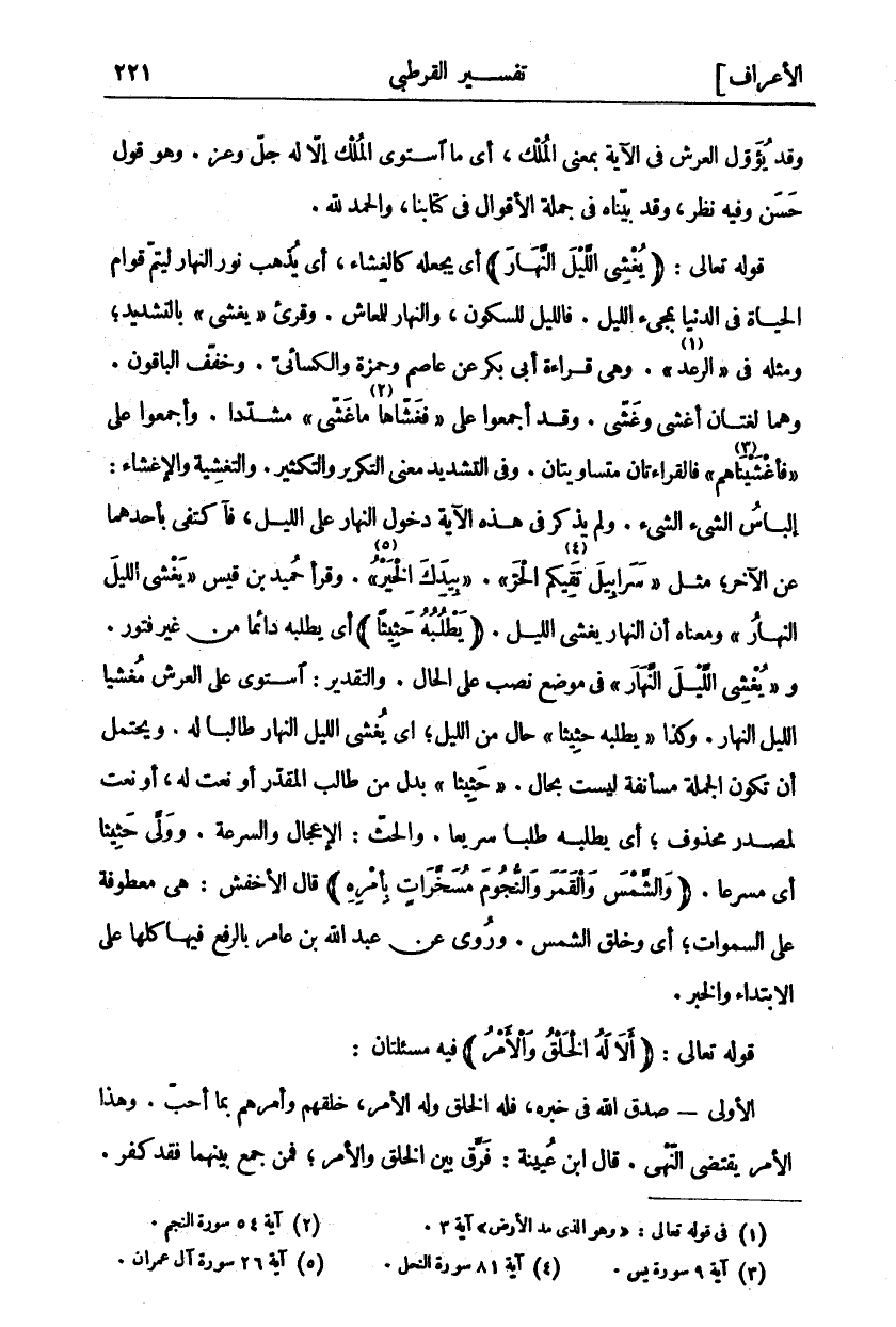 وقد يئول الْعَرْشُ فِي الْآيَةِ بِمَعْنَى الْمُلْكِ، أَيْ مَا اسْتَوَى الْمُلْكُ إِلَّا لَهُ جَلَّ وَعَزَّ. وَهُوَ قَوْلٌ حَسَنٌ وَفِيهِ نَظَرٌ، وَقَدْ بَيَّنَّاهُ فِي جُمْلَةِ الْأَقْوَالِ فِي كِتَابِنَا. وَالْحَمْدُ لِلَّهِ. قَوْلُهُ تَعَالَى: (يُغْشِي اللَّيْلَ النَّهارَ) أَيْ يَجْعَلُهُ كَالْغِشَاءِ، أَيْ يُذْهِبُ نُورَ النَّهَارِ لِيَتِمَّ قِوَامُ الْحَيَاةِ فِي الدُّنْيَا بِمَجِيءِ اللَّيْلِ. فَاللَّيْلُ لِلسُّكُونِ، وَالنَّهَارُ للمعاش. وقرى" يُغَشِّي" بِالتَّشْدِيدِ، وَمِثْلُهُ فِي" الرَّعْدِ «١» ". وَهِيَ قِرَاءَةُ أَبِي بَكْرٍ عَنْ عَاصِمٍ وَحَمْزَةَ وَالْكِسَائِيِّ. وَخَفَّفَ الْبَاقُونَ. وَهُمَا لُغَتَانِ أَغْشَى وَغَشَّى. وَقَدْ أَجْمَعُوا عَلَى" فَغَشَّاها «٢» مَا غَشَّى" مُشَدَّدًا. وَأَجْمَعُوا عَلَى" فَأَغْشَيْناهُمْ «٣» " فَالْقِرَاءَتَانِ مُتَسَاوِيَتَانِ. وَفِي التَّشْدِيدِ مَعْنَى التَّكْرِيرِ وَالتَّكْثِيرِ. وَالتَّغْشِيَةُ وَالْإِغْشَاءُ: إِلْبَاسُ الشَّيْءِ الشَّيْءَ. وَلَمْ يَذْكُرْ فِي هَذِهِ الْآيَةِ دُخُولَ النَّهَارِ عَلَى اللَّيْلِ، فَاكْتَفَى بِأَحَدِهِمَا عَنِ الْآخَرِ، مِثْلَ" سَرابِيلَ تَقِيكُمُ «٤» الْحَرَّ"." بِيَدِكَ الْخَيْرُ «٥» ". وَقَرَأَ حُمَيْدُ بْنُ قَيْسٍ" يُغْشِي اللَّيْلَ النَّهارَ" وَمَعْنَاهُ أَنَّ النَّهَارَ يُغْشِي اللَّيْلَ. (يَطْلُبُهُ حَثِيثاً) أَيْ يَطْلُبُهُ دَائِمًا مِنْ غَيْرِ فُتُورٍ. وَ" يُغْشِي اللَّيْلَ النَّهارَ" فِي مَوْضِعِ نَصْبٍ عَلَى الْحَالِ. وَالتَّقْدِيرُ: اسْتَوَى عَلَى الْعَرْشِ مُغْشِيًا اللَّيْلَ النَّهَارَ. وَكَذَا" يَطْلُبُهُ حَثِيثاً" حَالٌ مِنَ اللَّيْلِ، أَيْ يُغْشِي اللَّيْلَ النَّهَارَ طَالِبًا لَهُ. وَيَحْتَمِلُ أَنْ تَكُونَ الْجُمْلَةُ مُسْتَأْنَفَةً لَيْسَتْ بِحَالٍ." حَثِيثاً" بَدَلٌ مِنْ طَالِبٍ الْمُقَدَّرِ أَوْ نَعْتٌ لَهُ، أَوْ نَعْتٌ لِمَصْدَرٍ مَحْذُوفٍ، أَيْ يَطْلُبُهُ طَلَبًا سَرِيعًا. وَالْحَثُّ: الْإِعْجَالُ وَالسُّرْعَةُ. وَوَلَّى حَثِيثًا أَيْ مُسْرِعًا. (وَالشَّمْسَ وَالْقَمَرَ وَالنُّجُومَ مُسَخَّراتٍ بِأَمْرِهِ) قَالَ الْأَخْفَشُ: هِيَ مَعْطُوفَةٌ عَلَى السَّمَاوَاتِ، أَيْ وَخَلَقَ الشَّمْسَ. وَرُوِيَ عَنْ عَبْدِ اللَّهِ بْنِ عَامِرٍ بِالرَّفْعِ فِيهَا كُلِّهَا عَلَى الِابْتِدَاءِ وَالْخَبَرِ. قَوْلُهُ تَعَالَى: (أَلا لَهُ الْخَلْقُ وَالْأَمْرُ) فِيهِ مَسْأَلَتَانِ الْأُولَى- صِدْقُ اللَّهِ فِي خَبَرِهِ، فَلَهُ الْخَلْقُ وَلَهُ الْأَمْرُ، خَلَقَهُمْ وَأَمَرَهُمْ بِمَا أَحَبَّ. وَهَذَا الْأَمْرُ يَقْتَضِي النَّهْيَ. قَالَ ابْنُ عُيَيْنَةَ: فَرَّقَ بَيْنَ الْخَلْقِ وَالْأَمْرِ، فمن جمع بينهما فقد كفر.