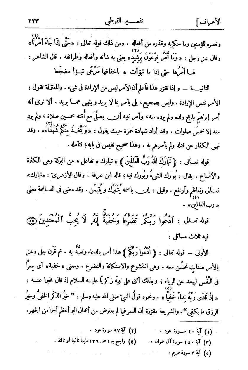 فِيهِ ثَلَاثُ مَسَائِلَ: الْأُولَى- قَوْلُهُ تَعَالَى: (ادْعُوا رَبَّكُمْ) هَذَا أَمْرٌ بِالدُّعَاءِ وَتَعَبُّدٌ بِهِ. ثُمَّ قَرَنَ جَلَّ وَعَزَّ بِالْأَمْرِ صِفَاتٍ تَحْسُنُ مَعَهُ، وَهِيَ الْخُشُوعُ وَالِاسْتِكَانَةُ وَالتَّضَرُّعُ. وَمَعْنَى" خُفْيَةً" أَيْ سِرًّا فِي النَّفْسِ لِيَبْعُدَ عَنِ الرِّيَاءِ، وَبِذَلِكَ أَثْنَى عَلَى نَبِيِّهِ زَكَرِيَّا عَلَيْهِ السَّلَامُ إِذْ قَالَ مُخْبِرًا عَنْهُ:" إِذْ نَادَى رَبَّهُ نِداءً خَفِيًّا «٤» ". وَنَحْوَهُ قَوْلُ النَّبِيِّ صَلَّى اللَّهُ عَلَيْهِ وَسَلَّمَ: (خَيْرُ الذِّكْرِ الْخَفِيُّ وَخَيْرُ الرِّزْقِ مَا يَكْفِي). وَالشَّرِيعَةُ مُقَرِّرَةٌ أَنَّ السِّرَّ فِيمَا لَمْ يَعْتَرِضْ مِنْ أَعْمَالِ الْبِرِّ أَعْظَمُ أَجْرًا من الجهر.