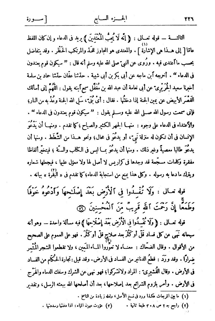 الثَّالِثَةُ- قَوْلُهُ تَعَالَى: (إِنَّهُ لَا يُحِبُّ الْمُعْتَدِينَ) يُرِيدُ فِي الدُّعَاءِ وَإِنْ كَانَ اللَّفْظُ عَامًّا (إِلَى هَذَا هِيَ الْإِشَارَةُ «١». وَالْمُعْتَدِي هُوَ الْمُجَاوِزُ لِلْحَدِّ وَمُرْتَكِبُ الْحَظْرِ. وَقَدْ يَتَفَاضَلُ بِحَسَبِ مَا اعْتَدَى فِيهِ. وَرُوِيَ عَنِ النَّبِيِّ صَلَّى اللَّهُ عَلَيْهِ وَسَلَّمَ أَنَّهُ قَالَ: (سَيَكُونُ قَوْمٌ يَعْتَدُونَ فِي الدُّعَاءِ). أَخْرَجَهُ ابْنُ مَاجَهْ عَنْ أَبِي بَكْرِ بْنِ أَبِي شَيْبَةَ. حَدَّثَنَا عَفَّانُ حَدَّثَنَا حَمَّادُ بْنُ سَلَمَةَ أَخْبَرَنَا سَعِيدٌ الْجَرِيرِيُّ عَنْ أَبِي نَعَامَةَ أَنَّ عَبْدَ اللَّهِ بْنَ مُغَفَّلٍ سَمِعَ ابْنَهُ يَقُولُ: اللَّهُمَّ إِنِّي أَسْأَلُكَ الْقَصْرَ الْأَبْيَضَ عَنْ يَمِينِ الْجَنَّةِ إِذَا دَخَلْتُهَا. فَقَالَ: أي بني، سل الله الجنة وعذبه مِنَ النَّارِ، فَإِنِّي سَمِعْتُ رَسُولَ اللَّهِ صَلَّى اللَّهُ عَلَيْهِ وَسَلَّمَ يَقُولُ: (سَيَكُونُ قَوْمٌ يَعْتَدُونَ فِي الدُّعَاءِ). وَالِاعْتِدَاءُ فِي الدُّعَاءِ عَلَى وُجُوهٍ: مِنْهَا الْجَهْرُ الْكَثِيرُ وَالصِّيَاحُ، كَمَا تَقَدَّمَ. وَمِنْهَا أَنْ يَدْعُوَ الْإِنْسَانُ فِي أَنْ تَكُونَ لَهُ مَنْزِلَةُ نَبِيٍّ، أَوْ يَدْعُوَ فِي مُحَالٍ، وَنَحْوَ هَذَا مِنَ الشَّطَطِ. وَمِنْهَا أَنْ يَدْعُوَ طَالِبًا مَعْصِيَةً وَغَيْرَ ذَلِكَ. وَمِنْهَا أَنْ يَدْعُوَ بِمَا لَيْسَ فِي الْكِتَابِ وَالسُّنَّةِ، فَيَتَخَيَّرُ أَلْفَاظًا مُفَقَّرَةً «٢» وَكَلِمَاتٍ مُسَجَّعَةً قَدْ وَجَدَهَا فِي كَرَارِيسَ لَا أَصْلَ لَهَا وَلَا مُعَوِّلَ عَلَيْهَا، فَيَجْعَلُهَا شِعَارَهُ وَيَتْرُكُ مَا دَعَا بِهِ رَسُولُهُ عَلَيْهِ السَّلَامُ. وَكُلُّ هَذَا يَمْنَعُ مِنِ اسْتِجَابَةِ الدُّعَاءِ. كَمَا تقدم في البقرة بيانه «٣».