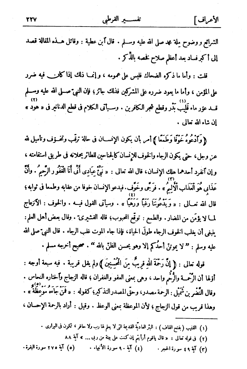الشَّرَائِعِ وَوُضُوحِ مِلَّةِ مُحَمَّدٍ صَلَّى اللَّهُ عَلَيْهِ وَسَلَّمَ. قَالَ ابْنُ عَطِيَّةَ: وَقَائِلُ هَذِهِ الْمَقَالَةِ قَصَدَ إِلَى أَكْبَرِ فَسَادٍ بَعْدَ أَعْظَمِ صَلَاحٍ فَخَصَّهُ بِالذِّكْرِ. قُلْتُ: وَأَمَّا مَا ذَكَرَهُ الضَّحَّاكُ فَلَيْسَ عَلَى عُمُومِهِ، وَإِنَّمَا ذَلِكَ إِذَا كَانَ فِيهِ ضَرَرٌ عَلَى الْمُؤْمِنِ، وَأَمَّا مَا يَعُودُ ضَرَرُهُ عَلَى الْمُشْرِكِينَ فَذَلِكَ جَائِزٌ، فَإِنَّ النَّبِيَّ صَلَّى اللَّهُ عَلَيْهِ وَسَلَّمَ قَدْ عَوَّرَ مَاءَ قَلِيبِ «١» بَدْرٍ وَقَطَعَ شَجَرَ الْكَافِرِينَ. وَسَيَأْتِي الْكَلَامُ فِي قَطْعِ الدَّنَانِيرِ فِي" هُودٍ «٢» " إِنْ شَاءَ اللَّهُ تَعَالَى. (وَادْعُوهُ خَوْفاً وَطَمَعاً) أَمْرٌ بِأَنْ يَكُونَ الْإِنْسَانُ فِي حَالَةِ تَرَقُّبٍ وَتَخَوُّفٍ وَتَأْمِيلٍ لِلَّهِ عَزَّ وَجَلَّ، حَتَّى يَكُونَ الرَّجَاءُ وَالْخَوْفُ لِلْإِنْسَانِ كَالْجَنَاحَيْنِ لِلطَّائِرِ يَحْمِلَانِهِ فِي طَرِيقِ اسْتِقَامَتِهِ، وَإِنِ انْفَرَدَ أَحَدُهُمَا هَلَكَ الْإِنْسَانُ، قَالَ اللَّهُ تَعَالَى:" نَبِّئْ عِبادِي أَنِّي أَنَا الْغَفُورُ الرَّحِيمُ. وَأَنَّ عَذابِي هُوَ الْعَذابُ الْأَلِيمُ «٣» ". فَرَجَّى وَخَوَّفَ. فَيَدْعُو الْإِنْسَانُ خَوْفًا مِنْ عِقَابِهِ وَطَمَعًا فِي ثَوَابِهِ، قَالَ اللَّهُ تَعَالَى:" وَيَدْعُونَنا رَغَباً وَرَهَباً «٤» ". وَسَيَأْتِي الْقَوْلُ فِيهِ. وَالْخَوْفُ: الِانْزِعَاجُ لِمَا لَا يُؤْمَنُ مِنَ الْمَضَارِّ. وَالطَّمَعُ: تَوَقُّعُ الْمَحْبُوبِ، قَالَ الْقُشَيْرِيُّ. وَقَالَ بَعْضُ أَهْلِ الْعِلْمِ: يَنْبَغِي أَنْ يَغْلِبَ «٥» الْخَوْفُ الرَّجَاءَ طُولَ الْحَيَاةِ، فَإِذَا جَاءَ الْمَوْتُ غَلَبَ الرَّجَاءُ. قَالَ النَّبِيُّ صَلَّى اللَّهُ عَلَيْهِ وَسَلَّمَ: (لَا يَمُوتَنَّ أَحَدُكُمْ إِلَّا وَهُوَ يُحْسِنُ الظَّنَّ بِاللَّهِ). صَحِيحٌ أَخْرَجَهُ مُسْلِمٌ. قَوْلُهُ تعالى: (إِنَّ رَحْمَتَ اللَّهِ قَرِيبٌ مِنَ الْمُحْسِنِينَ) وَلَمْ يَقُلْ قَرِيبَةٌ. فَفِيهِ سَبْعَةُ أَوْجُهٍ: أَوَّلُهَا أَنَّ الرَّحْمَةَ وَالرُّحُمَ واحد، وهي بمعنى العفو الغفران، قَالَهُ الزَّجَّاجُ وَاخْتَارَهُ النَّحَّاسُ. وَقَالَ النَّضْرُ بْنُ شُمَيْلٍ: الرَّحْمَةُ مَصْدَرٌ، وَحَقُّ الْمَصْدَرِ التَّذْكِيرُ، كَقَوْلِهِ:" فَمَنْ جاءَهُ مَوْعِظَةٌ «٦» ". وَهَذَا قَرِيبٌ مِنْ قَوْلِ الزَّجَّاجِ، لِأَنَّ الْمَوْعِظَةَ بِمَعْنَى الْوَعْظِ. وَقِيلَ: أَرَادَ بالرحمة الإحسان،
