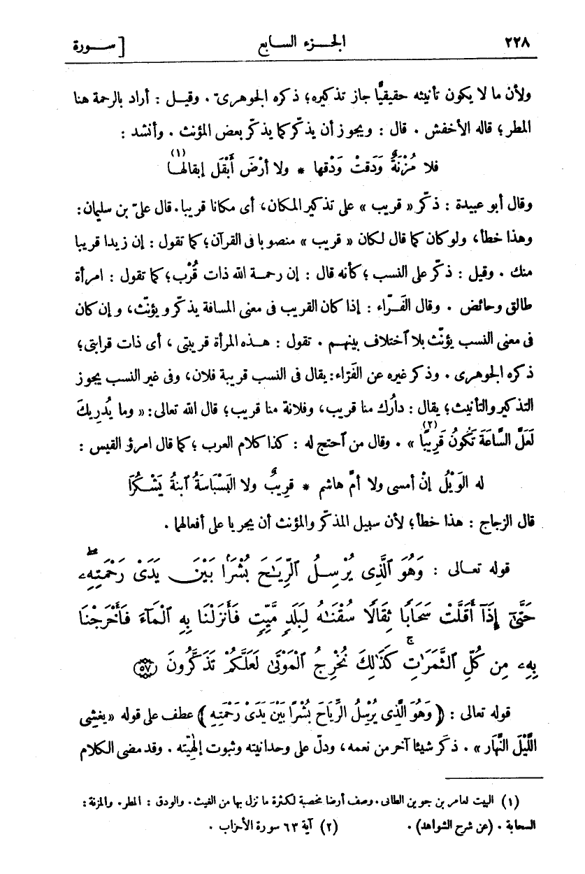 وَقَالَ أَبُو عُبَيْدَةَ: ذُكِّرَ" قَرِيبٌ" عَلَى تَذْكِيرِ الْمَكَانِ، أَيْ مَكَانًا قَرِيبًا. قَالَ عَلِيُّ بْنُ سُلَيْمَانَ: وَهَذَا خَطَأٌ، وَلَوْ كَانَ كَمَا قَالَ لَكَانَ" قَرِيبٌ" مَنْصُوبًا فِي الْقُرْآنِ، كَمَا تَقُولُ: إِنَّ زَيْدًا قَرِيبًا مِنْكَ. وَقِيلَ: ذُكِّرَ عَلَى النَّسَبِ، كَأَنَّهُ قَالَ: إِنَّ رَحْمَةَ اللَّهِ ذَاتُ قُرْبٍ، كَمَا تَقُولُ: امْرَأَةٌ طَالِقٌ وَحَائِضٌ. وَقَالَ الْفَرَّاءُ: إِذَا كَانَ الْقَرِيبُ فِي مَعْنَى الْمَسَافَةِ يُذَكَّرُ مؤنث، إن كَانَ فِي مَعْنَى النَّسَبِ يُؤَنَّثُ بِلَا اخْتِلَافٍ بَيْنَهُمْ. تَقُولُ: هَذِهِ الْمَرْأَةُ قَرِيبَتِي، أَيْ ذَاتُ قَرَابَتِي، ذَكَرَهُ الْجَوْهَرِيُّ. وَذَكَرَهُ غَيْرُهُ عَنِ الْفَرَّاءِ: يُقَالُ فِي النَّسَبِ قَرِيبَةُ فُلَانٍ، وَفِي غَيْرِ النَّسَبِ يَجُوزُ التَّذْكِيرُ وَالتَّأْنِيثُ، يُقَالُ: دَارُكَ مِنَّا قَرِيبٌ، وَفُلَانَةُ مِنَّا قَرِيبٌ، قَالَ اللَّهُ تَعَالَى:" وَما يُدْرِيكَ لَعَلَّ السَّاعَةَ تَكُونُ قَرِيباً «٢» ". وَقَالَ مَنِ احْتَجَّ لَهُ: كَذَا كَلَامُ الْعَرَبِ، كَمَا قَالَ امْرُؤُ الْقَيْسِ:
