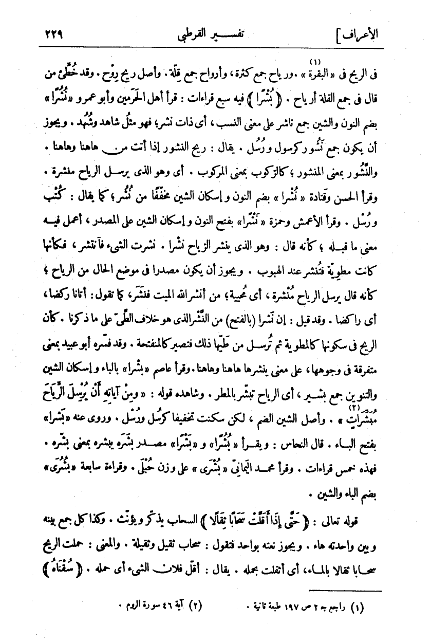 فِي الرِّيحِ فِي الْبَقَرَةِ «١». وَرِيَاحٌ جَمْعُ كَثْرَةٍ وَأَرْوَاحٌ جَمْعُ قِلَّةٍ. وَأَصْلُ رِيحٍ رِوْحٌ. وَقَدْ خُطِّئَ مَنْ قَالَ فِي جَمْعِ الْقِلَّةِ أَرْيَاحٌ." بُشْراً" فِيهِ سَبْعُ قِرَاءَاتٍ: قَرَأَ أَهْلُ الْحَرَمَيْنِ وَأَبُو عَمْرٍو" نُشُرًا" بِضَمِّ النُّونِ وَالشِّينِ جَمْعُ نَاشِرٍ عَلَى مَعْنَى النَّسَبِ، أَيْ ذَاتُ نَشْرٍ، فَهُوَ مِثْلُ شَاهِدٍ وَشُهُدٍ. وَيَجُوزُ أَنْ يَكُونَ جَمْعَ نَشُورٍ كَرَسُولٍ وَرُسُلٍ. يُقَالُ: رِيحُ النَّشُورِ إذا أتت من هاهنا وهاهنا. وَالنَّشُورُ بِمَعْنَى الْمَنْشُورِ، كَالرَّكُوبِ بِمَعْنَى الْمَرْكُوبِ. أَيْ وَهُوَ الَّذِي يُرْسِلُ الرِّيَاحَ مُنْشَرَةً. وَقَرَأَ الْحَسَنُ وَقَتَادَةُ" نُشْرًا" بِضَمِّ النُّونِ وَإِسْكَانِ الشِّينِ مُخَفَّفًا مِنْ نُشُرٍ، كَمَا يُقَالُ: كُتْبٌ وَرُسْلٌ. وَقَرَأَ الْأَعْمَشُ وَحَمْزَةُ" نَشْرًا" بِفَتْحِ النُّونِ وَإِسْكَانِ الشِّينِ عَلَى الْمَصْدَرِ، أَعْمَلَ فِيهِ مَعْنَى مَا قَبْلَهُ، كَأَنَّهُ قَالَ: وَهُوَ الَّذِي يَنْشُرُ الرِّيَاحَ نَشْرًا. نَشَرْتُ الشَّيْءَ فَانْتَشَرَ، فَكَأَنَّهَا كَانَتْ مَطْوِيَّةً فَنُشِرَتْ عِنْدَ الْهُبُوبِ. وَيَجُوزُ أَنْ يَكُونَ مَصْدَرًا فِي مَوْضِعِ الْحَالِ مِنَ الرِّيَاحِ، كَأَنَّهُ قَالَ يُرْسِلُ الرِّيَاحَ مُنْشَرَةً، أَيْ مُحْيَيَةً، مِنْ أَنَشَرَ اللَّهُ الْمَيِّتَ فَنُشِرَ، كَمَا تَقُولُ أَتَانَا رَكْضًا، أَيْ رَاكِضًا. وَقَدْ قِيلَ: إِنَّ نَشْرًا (بِالْفَتْحِ) مِنَ النَّشْرِ الَّذِي هُوَ خِلَافُ الطَّيِّ عَلَى مَا ذَكَرْنَا. كَأَنَّ الرِّيحَ فِي سُكُونِهَا كَالْمَطْوِيَّةِ ثُمَّ تُرْسَلُ مِنْ طَيِّهَا ذَلِكَ فَتَصِيرُ كَالْمُنْفَتِحَةِ. وَقَدْ فَسَّرَهُ أَبُو عُبَيْدٍ بِمَعْنَى مُتَفَرِّقَةٍ فِي وُجُوهِهَا، على معنى ينشرها هاهنا وهاهنا. وَقَرَأَ عَاصِمٌ:" بُشْرًا" بِالْبَاءِ وَإِسْكَانِ الشِّينِ وَالتَّنْوِينِ جَمْعُ بَشِيرٍ، أَيِ الرِّيَاحُ تُبَشِّرُ بِالْمَطَرِ. وَشَاهِدُهُ قَوْلُهُ:" وَمِنْ آياتِهِ أَنْ يُرْسِلَ الرِّياحَ مُبَشِّراتٍ «٢» ". وَأَصْلُ الشِّينِ الضَّمُّ، لَكِنْ سُكِّنَتْ تَخْفِيفًا كَرُسُلٍ وَرُسْلٍ. وَرُوِيَ عَنْهُ" بَشْرًا" بِفَتْحِ الْبَاءِ. قَالَ النَّحَّاسُ: وَيُقْرَأُ" بُشُرًا" وَ" بَشْرٌ مَصْدَرُ بَشَرَهُ يَبْشُرُهُ بِمَعْنَى بَشَّرَهُ" فَهَذِهِ خَمْسُ قِرَاءَاتٍ. وَقَرَأَ مُحَمَّدُ الْيَمَانِيُّ" بُشْرَى" عَلَى وَزْنِ حُبْلَى. وَقِرَاءَةٌ سابعة" بشرى" بضم الباء والشين. (حَتَّى إِذا أَقَلَّتْ سَحاباً ثِقالًا) السَّحَابُ يُذَكَّرُ وَيُؤَنَّثُ. وَكَذَا كُلُّ جَمْعٍ بَيْنَهُ وَبَيْنَ وَاحِدَتِهِ هَاءٌ. وَيَجُوزُ نَعْتُهُ بِوَاحِدٍ فَتَقُولُ: سَحَابٌ ثَقِيلٌ وَثَقِيلَةٌ. وَالْمَعْنَى: حَمَلَتِ الرِّيحُ سَحَابًا ثِقَالًا بِالْمَاءِ، أَيْ أَثْقَلَتْ بِحَمْلِهِ. يُقَالُ: أَقَلَّ فُلَانٌ الشَّيْءَ أي حمله. سقناه