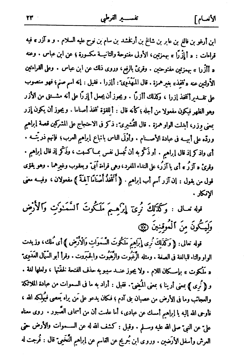 ابن أوغو بْنِ فَالِغَ بْنِ عَابِرَ بْنِ شَالِخَ بْنِ أَرْفَخْشَدَ بْنِ سام بن نوح عليه السلام. وَ" آزَرَ" فِيهِ قِرَاءَاتٌ:" أَإِزْرًا" بِهَمْزَتَيْنِ، الْأُولَى مَفْتُوحَةٌ وَالثَّانِيَةُ مَكْسُورَةٌ، عَنِ ابْنِ عَبَّاسٍ. وَعَنْهُ" أأزرا" بهمزتين مفتوحتين. وقرى بِالرَّفْعِ، وَرُوِيَ ذَلِكَ عَنِ ابْنِ عَبَّاسٍ. وَعَلَى الْقِرَاءَتَيْنِ الْأُولَيَيْنِ عَنْهُ" تَتَّخِذُ" بِغَيْرِ هَمْزَةٍ. قَالَ الْمَهْدَوِيُّ: (أَإِزْرًا)؟ فَقِيلَ: إِنَّهُ اسْمُ صَنَمٍ، فَهُوَ مَنْصُوبٌ عَلَى تَقْدِيرِ أَتَتَّخِذُ إِزْرًا، وَكَذَلِكَ أَأَزْرًا. وَيَجُوزُ أَنْ يُجْعَلَ أَإِزْرًا عَلَى أَنَّهُ مُشْتَقٌّ مِنَ الْأَزْرِ وَهُوَ الظَّهْرُ فَيَكُونُ مَفْعُولًا مِنْ أَجْلِهِ، كَأَنَّهُ قَالَ: أَلِلْقُوَّةِ تَتَّخِذُ أَصْنَامًا. وَيَجُوزُ أَنْ يَكُونَ إِزْرُ بِمَعْنَى وِزْرٍ، أُبْدِلَتِ الْوَاوُ هَمْزَةً. قَالَ الْقُشَيْرِيُّ: ذَكَرَ فِي الِاحْتِجَاجِ عَلَى المشركين قصة إبراهيم ووده عَلَى أَبِيهِ فِي عِبَادَةِ الْأَصْنَامِ. وَأَوْلَى النَّاسِ بِاتِّبَاعِ إِبْرَاهِيمَ الْعَرَبُ، فَإِنَّهُمْ ذُرِّيَّتُهُ. أَيْ وَاذْكُرْ إِذْ قَالَ إِبْرَاهِيمُ. أَوْ" وَذَكِّرْ بِهِ أَنْ تُبْسَلَ نَفْسٌ بِما كَسَبَتْ" وَذَكِّرْ إِذْ قَالَ إبراهيم. وقرى" آزَرَ" أَيْ يَا آزَرُ، عَلَى النِّدَاءِ الْمُفْرَدِ، وَهِيَ قِرَاءَةُ أُبَيٍّ وَيَعْقُوبَ وَغَيْرِهِمَا. وَهُوَ يُقَوِّي قول من يقول: إن آزر اسم أب إِبْرَاهِيمَ" أَتَتَّخِذُ أَصْناماً آلِهَةً" مَفْعُولَانِ لِتَتَّخِذُ «١» وَهُوَ استفهام) فيه معنى الإنكار.