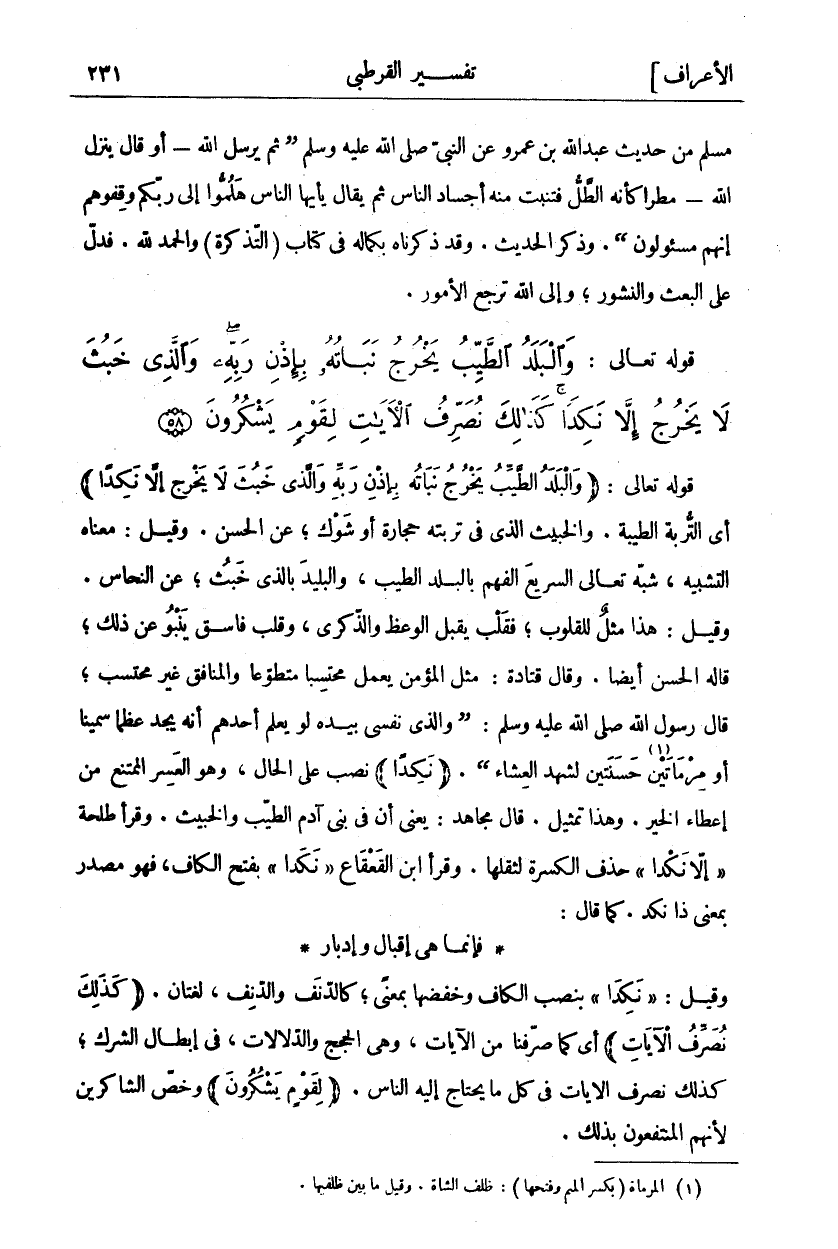 قَوْلُهُ تَعَالَى: (وَالْبَلَدُ الطَّيِّبُ يَخْرُجُ نَباتُهُ بِإِذْنِ رَبِّهِ وَالَّذِي خَبُثَ لَا يَخْرُجُ إِلَّا نَكِداً) أَيِ التُّرْبَةُ الطَّيِّبَةُ. وَالْخَبِيثُ الَّذِي فِي تُرْبَتِهِ حِجَارَةٌ أَوْ شَوْكٌ، عَنِ الْحَسَنِ. وَقِيلَ: مَعْنَاهُ التَّشْبِيهُ، شَبَّهَ تَعَالَى السَّرِيعَ الْفَهْمَ بِالْبَلَدِ الطَّيِّبِ، وَالْبَلِيدَ بِالَّذِي خَبُثَ، عَنِ النَّحَّاسِ. وَقِيلَ: هَذَا مَثَلٌ لِلْقُلُوبِ، فَقَلْبٌ يَقْبَلُ الْوَعْظَ وَالذِّكْرَى، وَقَلْبٌ فَاسِقٌ يَنْبُو عَنْ ذَلِكَ، قال الْحَسَنُ أَيْضًا. وَقَالَ قَتَادَةُ: مَثَلٌ لِلْمُؤْمِنِ يَعْمَلُ مُحْتَسِبًا مُتَطَوِّعًا، وَالْمُنَافِقُ غَيْرُ مُحْتَسِبٍ، قَالَ رَسُولُ اللَّهِ صَلَّى اللَّهُ عَلَيْهِ وَسَلَّمَ: (وَالَّذِي نَفْسِي بِيَدِهِ لَوْ يَعْلَمُ أَحَدُهُمْ أَنَّهُ يَجِدُ عَظْمًا سَمِينًا أَوْ مِرْمَاتَيْنِ «١» حَسَنَتَيْنِ لَشَهِدَ الْعِشَاءَ)." نَكِداً" نُصِبَ عَلَى الْحَالِ، وَهُوَ الْعَسِرُ الْمُمْتَنِعُ مِنْ إِعْطَاءِ الْخَيْرِ. وَهَذَا تَمْثِيلٌ. قَالَ مُجَاهِدٌ: يَعْنِي أَنَّ فِي بَنِي آدَمَ الطَّيِّبَ وَالْخَبِيثَ. وَقَرَأَ طَلْحَةُ" إِلَّا نَكِداً" حَذَفَ الْكَسْرَةِ لِثِقَلِهَا. وَقَرَأَ ابْنُ الْقَعْقَاعِ" نَكَدًا" بِفَتْحِ الْكَافِ، فَهُوَ مَصْدَرٌ بِمَعْنَى ذَا نَكَدٍ. كَمَا قَالَ:
