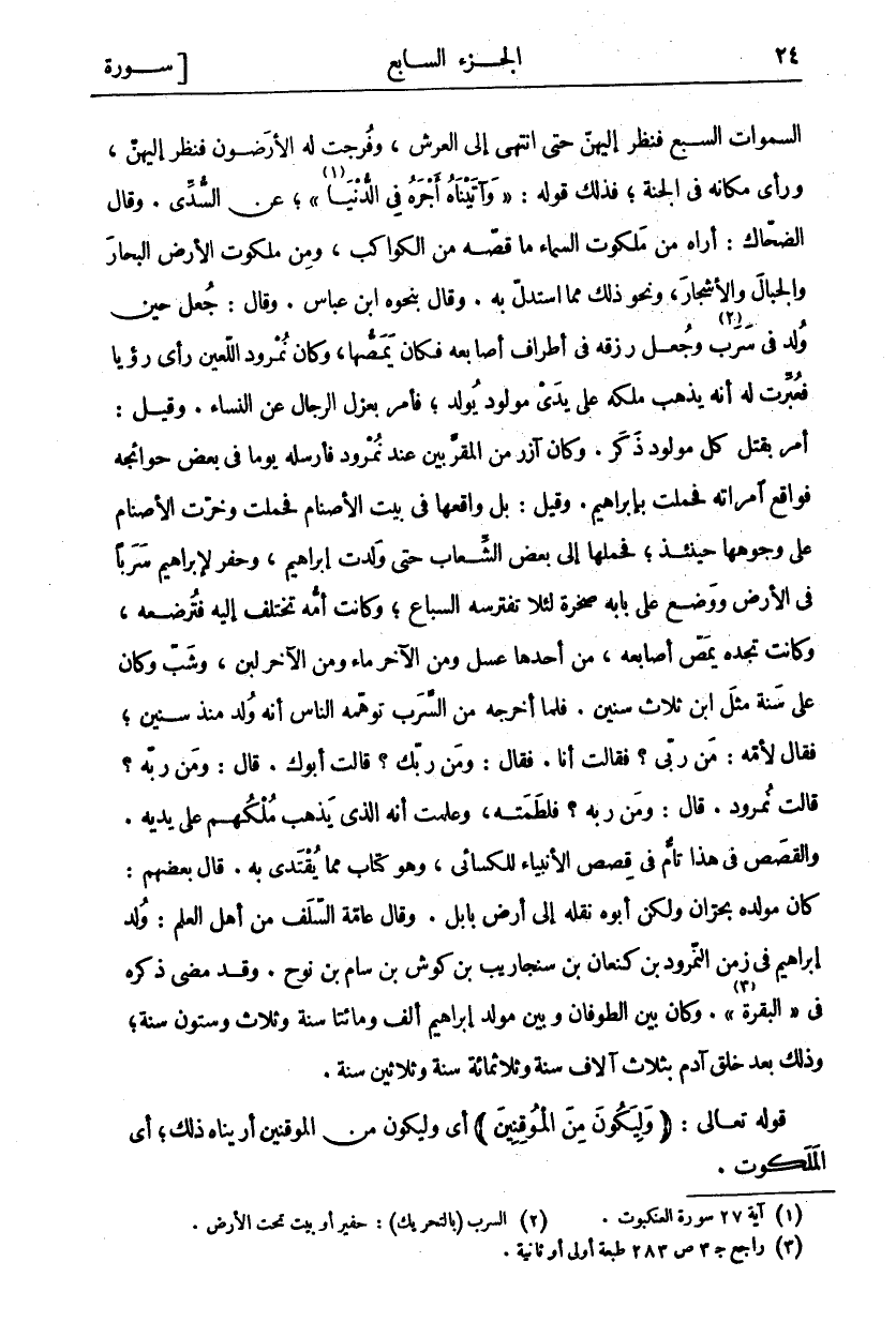 الْعَرْشِ وَأَسْفَلَ الْأَرَضِينَ. وَرَوَى ابْنُ جُرَيْجٍ عَنِ الْقَاسِمِ عَنْ إِبْرَاهِيمَ النَّخَعِيِّ قَالَ: فُرِّجَتْ لَهُ السَّمَاوَاتُ السَّبْعُ فَنَظَرَ إِلَيْهِنَّ حَتَّى انْتَهَى إِلَى الْعَرْشِ، وَفُرِّجَتْ لَهُ الْأَرَضُونَ فَنَظَرَ إِلَيْهِنَّ، وَرَأَى مكانه في الجنة، فذلك قول:" وَآتَيْناهُ أَجْرَهُ فِي الدُّنْيا" «١»، عَنِ السُّدِّيِّ .. وَقَالَ الضحاك: أراه مَلَكُوتِ السَّمَاءِ مَا قَصَّهُ مِنَ الْكَوَاكِبِ، وَمِنْ مَلَكُوتِ الْأَرْضِ الْبِحَارَ وَالْجِبَالَ وَالْأَشْجَارَ، وَنَحْوَ ذَلِكَ مِمَّا اسْتَدَلَّ بِهِ. وَقَالَ بِنَحْوِهِ ابْنُ عَبَّاسٍ. وَقَالَ: جُعِلَ حِينَ وُلِدَ فِي سَرَبٍ «٢» وَجُعِلَ رِزْقُهُ فِي أَطْرَافِ أَصَابِعِهِ فَكَانَ يَمُصُّهَا، وَكَانَ نُمْرُوذُ اللَّعِينُ رَأَى رُؤْيَا فَعُبِّرَتْ لَهُ أَنَّهُ يَذْهَبُ مُلْكُهُ عَلَى يَدَيْ مَوْلُودٍ يُولَدُ، فَأَمَرَ بِعَزْلِ الرِّجَالِ عَنِ النِّسَاءِ. وَقِيلَ: أَمَرَ بِقَتْلِ كُلِّ مَوْلُودٍ ذَكَرٍ. وَكَانَ آزَرُ مِنَ الْمُقَرَّبِينَ عِنْدَ (الْمَلِكِ) «٣» نُمْرُوذَ فَأَرْسَلَهُ يَوْمًا فِي بَعْضِ حَوَائِجِهِ فَوَاقَعَ امْرَأَتَهُ فَحَمَلَتْ بِإِبْرَاهِيمَ. وَقِيلَ: بَلْ وَاقَعَهَا فِي بَيْتِ الْأَصْنَامِ فَحَمَلَتْ وَخَرَّتِ الْأَصْنَامُ عَلَى وُجُوهِهَا حِينَئِذٍ، فَحَمَلَهَا إِلَى بَعْضِ الشِّعَابِ حَتَّى وَلَدَتْ إِبْرَاهِيمَ، وَحَفَرَ لِإِبْرَاهِيمَ سَرَبًا فِي الْأَرْضِ وَوَضَعَ عَلَى بَابِهِ صَخْرَةً لِئَلَّا تَفْتَرِسَهُ السِّبَاعُ، وَكَانَتْ أُمُّهُ تَخْتَلِفُ إِلَيْهِ فَتُرْضِعُهُ، وَكَانَتْ تَجِدُهُ يَمُصُّ أَصَابِعَهُ، مِنْ أَحَدِهَا عَسَلٌ وَمِنَ الْآخَرِ مَاءٌ وَمِنَ الْآخَرِ لَبَنٌ، وَشَبَّ فَكَانَ عَلَى سَنَةٍ مِثْلَ ابْنِ ثَلَاثَ سِنِينَ. فَلَمَّا أَخْرَجَهُ مِنَ السَّرَبِ تَوَهَّمَهُ النَّاسُ أَنَّهُ وُلِدَ مُنْذُ سِنِينَ، فَقَالَ لِأُمِّهِ: مَنْ رَبِّي؟ فَقَالَتْ أَنَا. فَقَالَ: وَمَنْ رَبُّكِ؟ قَالَتْ أَبُوكَ. قَالَ: وَمَنْ رَبُّهُ؟ قَالَتْ نُمْرُوذُ. قَالَ: وَمَنْ رَبُّهُ «٤»؟ فَلَطَمَتْهُ، وَعَلِمَتْ أَنَّهُ الَّذِي يَذْهَبُ مُلْكُهُمْ عَلَى يَدَيْهِ. وَالْقَصَصُ فِي هَذَا تَامٌّ فِي قَصَصِ الْأَنْبِيَاءِ لِلْكِسَائِيِّ، وَهُوَ كِتَابٌ «٥» مِمَّا يُقْتَدَى بِهِ. وَقَالَ بَعْضُهُمْ: كَانَ مَوْلِدُهُ بِحَرَّانَ وَلَكِنْ أَبُوهُ نَقَلَهُ إِلَى أَرْضِ بَابِلَ. وَقَالَ عَامَّةُ السَّلَفِ مِنْ أَهْلِ الْعِلْمِ: وُلِدَ إِبْرَاهِيمُ فِي زَمَنِ النُّمْرُوذِ بْنِ كَنْعَانَ بْنِ سَنْجَارِيبَ بْنِ كَوْشَ بْنِ سَامَ بْنِ نُوحٍ. وَقَدْ مَضَى ذِكْرُهُ فِي" الْبَقَرَةِ" «٦». وَكَانَ بَيْنَ الطُّوفَانِ وَبَيْنَ مَوْلِدِ إِبْرَاهِيمَ أَلْفٌ وَمِائَتَا سَنَةٍ وَثَلَاثٌ وَسِتُّونَ سَنَةً، وذلك بعد خلق آدم بثلاث آلَافِ سَنَةٍ وَثَلَاثمِائَةِ سَنَةٍ وَثَلَاثِينَ سَنَةً. قَوْلُهُ تَعَالَى: (وَلِيَكُونَ مِنَ الْمُوقِنِينَ)