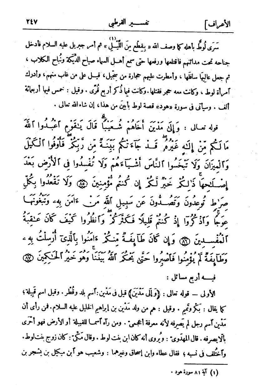 وَإِلى مَدْيَنَ أَخاهُمْ شُعَيْباً قالَ يَا قَوْمِ اعْبُدُوا اللَّهَ مَا لَكُمْ مِنْ إِلهٍ غَيْرُهُ قَدْ جاءَتْكُمْ بَيِّنَةٌ مِنْ رَبِّكُمْ فَأَوْفُوا الْكَيْلَ وَالْمِيزانَ وَلا تَبْخَسُوا النَّاسَ أَشْياءَهُمْ وَلا تُفْسِدُوا فِي الْأَرْضِ بَعْدَ إِصْلاحِها ذلِكُمْ خَيْرٌ لَكُمْ إِنْ كُنْتُمْ مُؤْمِنِينَ (٨٥) وَلا تَقْعُدُوا بِكُلِّ صِراطٍ تُوعِدُونَ وَتَصُدُّونَ عَنْ سَبِيلِ اللَّهِ مَنْ آمَنَ بِهِ وَتَبْغُونَها عِوَجاً وَاذْكُرُوا إِذْ كُنْتُمْ قَلِيلاً فَكَثَّرَكُمْ وَانْظُرُوا كَيْفَ كانَ عاقِبَةُ الْمُفْسِدِينَ (٨٦) وَإِنْ كانَ طائِفَةٌ مِنْكُمْ آمَنُوا بِالَّذِي أُرْسِلْتُ بِهِ وَطائِفَةٌ لَمْ يُؤْمِنُوا فَاصْبِرُوا حَتَّى يَحْكُمَ اللَّهُ بَيْنَنا وَهُوَ خَيْرُ الْحاكِمِينَ (٨٧)