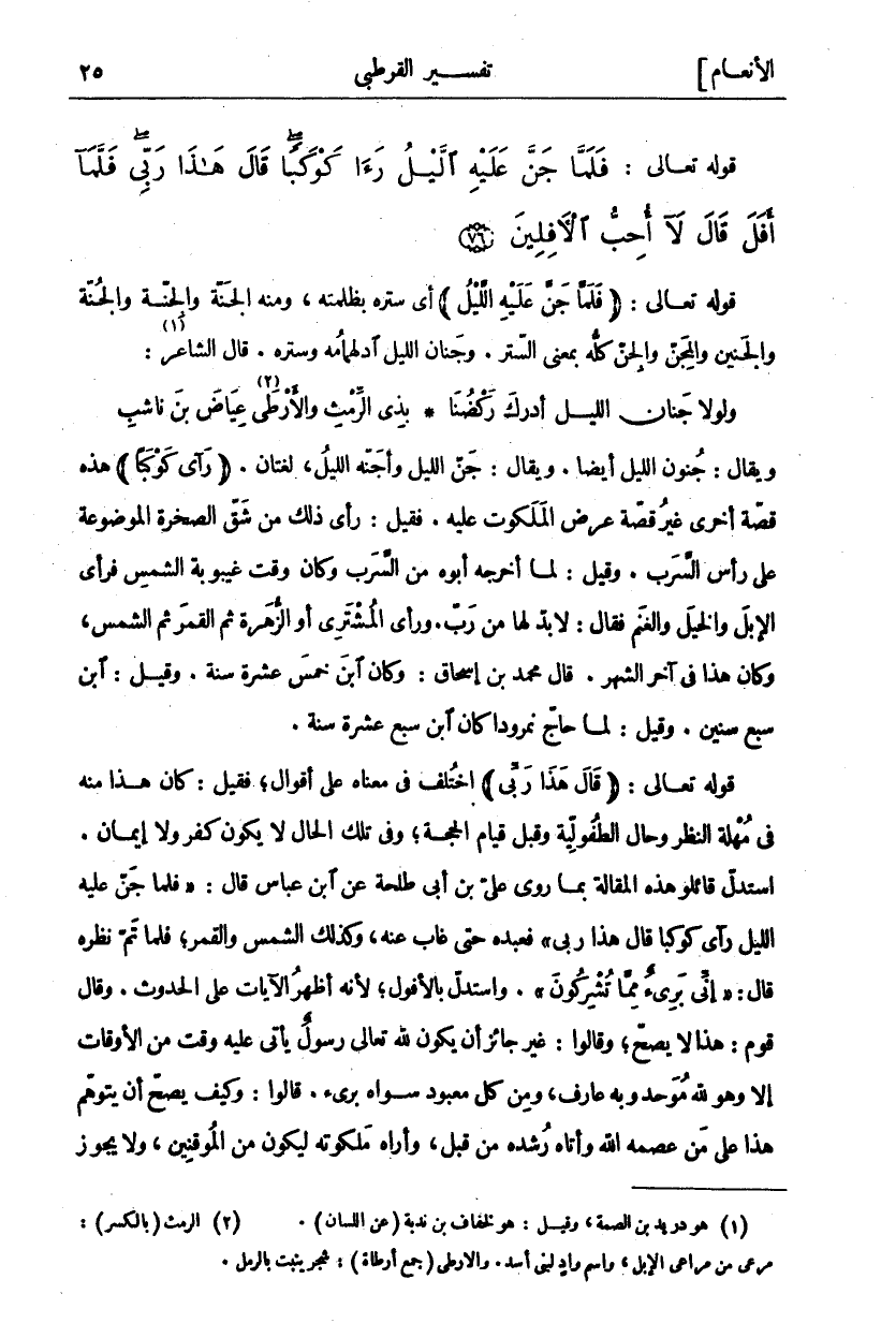 وَيُقَالُ: جُنُونُ اللَّيْلِ أَيْضًا. وَيُقَالُ: جَنَّهُ اللَّيْلُ وَأَجَنَّهُ اللَّيْلُ لُغَتَانِ. (رَأى كَوْكَباً) هَذِهِ قِصَّةٌ أُخْرَى، غَيْرُ قِصَّةِ عَرْضِ الْمَلَكُوتِ عَلَيْهِ. فَقِيلَ: رَأَى ذَلِكَ مِنْ شِقِّ الصَّخْرَةِ الْمَوْضُوعَةِ عَلَى رَأْسِ السَّرَبِ. وَقِيلَ: لَمَّا أَخْرَجَهُ أَبُوهُ مِنَ السَّرَبِ وَكَانَ وَقْتَ غَيْبُوبَةِ الشَّمْسِ فَرَأَى الْإِبِلَ وَالْخَيْلَ وَالْغَنَمَ فَقَالَ: لَا بُدَّ لَهَا مِنْ رَبٍّ. وَرَأَى الْمُشْتَرِيَ أَوِ الزُّهْرَةَ ثُمَّ الْقَمَرَ ثُمَّ الشَّمْسَ، وَكَانَ هَذَا فِي آخِرِ الشَّهْرِ. قَالَ مُحَمَّدُ بْنُ إِسْحَاقَ: وَكَانَ ابْنَ خَمْسَ عَشْرَةَ سَنَةً. وَقِيلَ: ابْنُ سَبْعِ سِنِينَ. وَقِيلَ: لَمَّا حَاجَّ نُمْرُوذًا كَانَ ابْنَ سَبْعَ عَشْرَةَ سَنَةً. قَوْلُهُ تَعَالَى: (قالَ هَذَا رَبِّي) اخْتُلِفَ فِي مَعْنَاهُ عَلَى أَقْوَالٍ، فَقِيلَ: كَانَ هَذَا مِنْهُ فِي مُهْلَةِ النَّظَرِ وَحَالِ الطُّفُولِيَّةِ وَقَبْلَ قِيَامِ الْحُجَّةِ، وَفِي تِلْكَ الْحَالِ لَا يَكُونُ كُفْرٌ وَلَا إِيمَانٌ. فَاسْتَدَلَّ قَائِلُو هَذِهِ الْمَقَالَةِ بِمَا رُوِيَ عَنْ عَلِيُّ بْنُ أَبِي طَلْحَةَ عَنِ ابْنِ عَبَّاسٍ قَالَ:" فَلَمَّا جَنَّ عَلَيْهِ اللَّيْلُ رَأى كَوْكَباً قالَ هَذَا رَبِّي" فَعَبَدَهُ حَتَّى غَابَ عَنْهُ، وَكَذَلِكَ الشَّمْسُ والقمر، فلما تم نظره قال:" إِنِّي بَرِيءٌ مِمَّا تُشْرِكُونَ" وَاسْتَدَلَّ بِالْأُفُولِ، لِأَنَّهُ أَظْهَرُ الْآيَاتِ عَلَى الْحُدُوثِ. وَقَالَ قَوْمٌ: هَذَا لَا يَصِحُّ، وَقَالُوا: غَيْرُ جَائِزٍ أَنْ يَكُونَ لِلَّهِ تَعَالَى رَسُولٌ يَأْتِي عَلَيْهِ وَقْتٌ مِنَ الْأَوْقَاتِ إِلَّا وَهُوَ لِلَّهِ تَعَالَى مُوَحِّدٌ وَبِهِ عَارِفٌ، وَمِنْ كل معبود سواه برئ. قَالُوا: وَكَيْفَ يَصِحُّ أَنْ يُتَوَهَّمَ هَذَا عَلَى مَنْ عَصَمَهُ اللَّهُ وَآتَاهُ رُشْدَهُ مِنْ قَبْلُ، وَأَرَاهُ مَلَكُوتَهُ لِيَكُونَ مِنَ الْمُوقِنِينَ، وَلَا يَجُوزُ