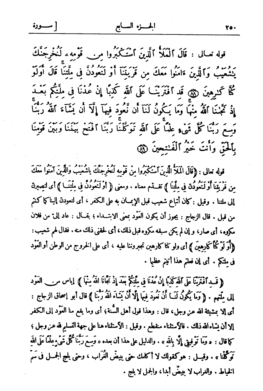 قالَ الْمَلَأُ الَّذِينَ اسْتَكْبَرُوا مِنْ قَوْمِهِ لَنُخْرِجَنَّكَ يَا شُعَيْبُ وَالَّذِينَ آمَنُوا مَعَكَ مِنْ قَرْيَتِنا أَوْ لَتَعُودُنَّ فِي مِلَّتِنا قالَ أَوَلَوْ كُنَّا كارِهِينَ (٨٨) قَدِ افْتَرَيْنا عَلَى اللَّهِ كَذِباً إِنْ عُدْنا فِي مِلَّتِكُمْ بَعْدَ إِذْ نَجَّانَا اللَّهُ مِنْها وَما يَكُونُ لَنا أَنْ نَعُودَ فِيها إِلاَّ أَنْ يَشاءَ اللَّهُ رَبُّنا وَسِعَ رَبُّنا كُلَّ شَيْءٍ عِلْماً عَلَى اللَّهِ تَوَكَّلْنا رَبَّنَا افْتَحْ بَيْنَنا وَبَيْنَ قَوْمِنا بِالْحَقِّ وَأَنْتَ خَيْرُ الْفاتِحِينَ (٨٩)