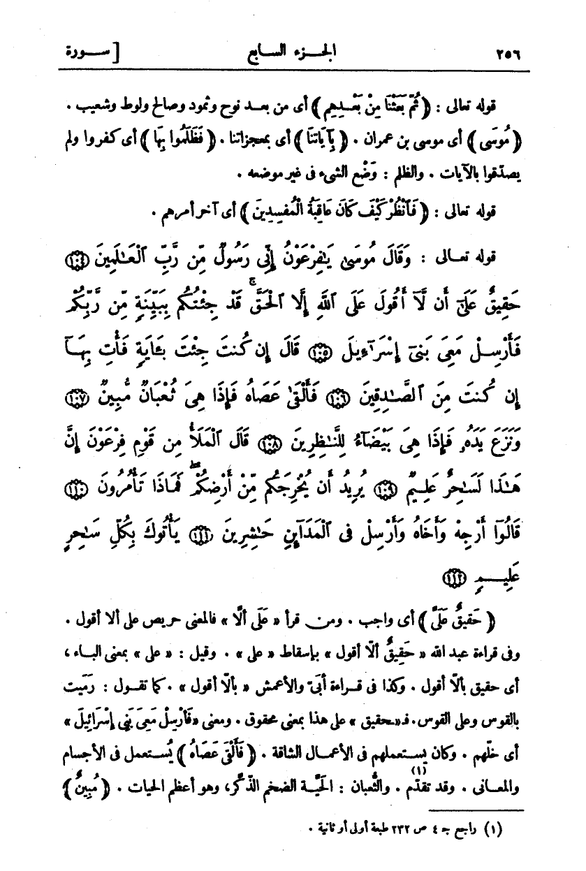 حَقِيقٌ عَلى «٢» أَيْ وَاجِبٌ. وَمَنْ قَرَأَ" عَلَى أَلَّا" فَالْمَعْنَى حَرِيصٌ عَلَى أَلَّا أَقُولَ. وَفِي قِرَاءَةِ عَبْدِ اللَّهِ" حَقِيقٌ أَلَّا أَقُولَ" بِإِسْقَاطِ" عَلَى". وَقِيلَ:" عَلى " بِمَعْنَى الْبَاءِ، أَيْ حَقِيقٌ بِأَلَّا أَقُولَ. وَكَذَا فِي قِرَاءَةِ أُبَيٍّ وَالْأَعْمَشِ" بِأَلَّا أَقُولَ". كَمَا تَقُولُ: رَمَيْتُ بِالْقَوْسِ وَعَلَى الْقَوْسِ. فَ" حَقِيقٌ" على هذا بمعنى محقوق. ومعنى" فَأَرْسِلْ مَعِيَ بَنِي إِسْرائِيلَ" أَيْ خَلِّهِمْ. وَكَانَ يَسْتَعْمِلُهُمْ «٣» فِي الْأَعْمَالِ الشَّاقَّةِ. (فَأَلْقى عَصاهُ) يُسْتَعْمَلُ فِي الْأَجْسَامِ وَالْمَعَانِي. وَقَدْ تَقَدَّمَ «٤». وَالثُّعْبَانُ: الْحَيَّةُ الضخم الذكر، وهو أعظم الحيات. (مبين)