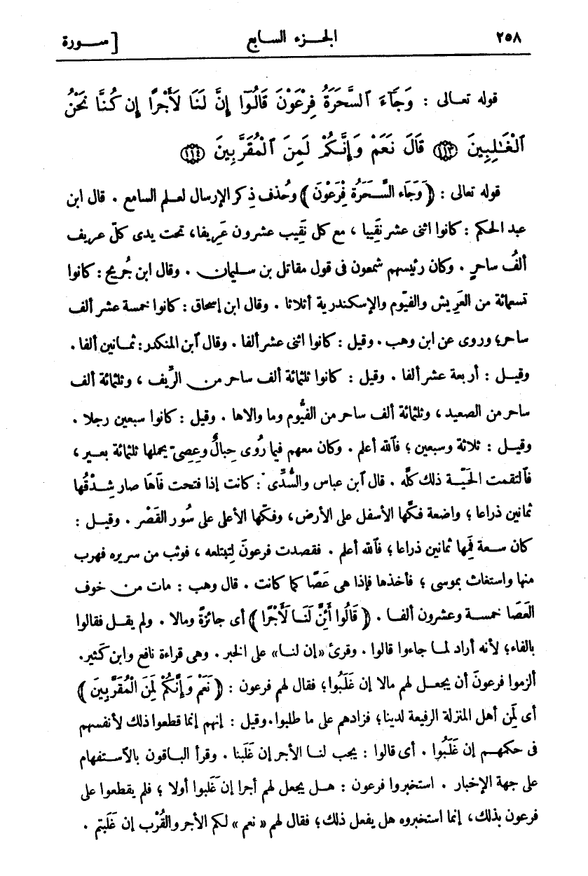 قَوْلُهُ تَعَالَى: (وَجاءَ السَّحَرَةُ فِرْعَوْنَ) وَحُذِفَ ذِكْرُ الْإِرْسَالِ لِعِلْمِ السَّامِعِ. قَالَ ابْنُ عَبْدِ الْحَكَمِ: كَانُوا اثْنَيْ عَشَرَ نَقِيبًا، مَعَ كُلِّ نَقِيبٍ عِشْرُونَ عَرِيفًا، تَحْتَ يَدَيْ كُلِّ عَرِيفٍ أَلْفُ سَاحِرٍ. وَكَانَ رَئِيسَهُمْ شَمْعُونُ فِي قَوْلِ مُقَاتِلِ بْنِ سُلَيْمَانَ. وَقَالَ ابْنُ جُرَيْجٍ: كَانُوا تِسْعَمِائَةٍ مِنَ الْعَرِيشِ وَالْفَيُّومِ وَالْإِسْكَنْدَرِيَّةِ أَثْلَاثًا. وَقَالَ ابْنُ إِسْحَاقَ: كَانُوا خَمْسَةَ عَشَرَ أَلْفَ سَاحِرٍ، وَرُوِيَ عَنْ وَهْبٍ. وَقِيلَ: كَانُوا اثْنَيْ عَشَرَ أَلْفًا. وَقَالَ ابْنُ الْمُنْكَدِرِ: ثَمَانِينَ أَلْفًا. وَقِيلَ: أَرْبَعَةَ عَشَرَ أَلْفًا. وَقِيلَ: كَانُوا ثَلَاثَمِائَةِ أَلْفِ سَاحِرٍ مِنَ الرِّيفِ، وَثَلَاثَمِائَةِ أَلْفِ سَاحِرٍ مِنَ الصَّعِيدِ، وَثَلَاثَمِائَةِ أَلْفِ سَاحِرٍ مِنَ الْفَيُّومِ وَمَا وَالَاهَا. وَقِيلَ: كَانُوا سَبْعِينَ رَجُلًا. وَقِيلَ: ثَلَاثَةً وَسَبْعِينَ، فَاللَّهُ أَعْلَمُ. وَكَانَ مَعَهُمْ فِيمَا رُوِيَ حِبَالٌ وَعِصِيٌّ يَحْمِلُهَا ثَلَاثُمِائَةِ بَعِيرٍ. فَالْتَقَمَتِ الْحَيَّةُ ذَلِكَ كُلَّهُ. قَالَ ابْنُ عَبَّاسٍ وَالسُّدِّيُّ: كَانَتْ إِذَا فَتَحَتْ فَاهَا صَارَ شِدْقُهَا ثَمَانِينَ ذِرَاعًا، وَاضِعَةً فَكَّهَا الْأَسْفَلَ عَلَى الْأَرْضِ، وَفَكَّهَا الْأَعْلَى عَلَى سُورِ الْقَصْرِ. وَقِيلَ: كَانَ سِعَةُ فَمِهَا أَرْبَعِينَ ذِرَاعًا، فَاللَّهُ أَعْلَمُ. فَقَصَدَتْ فِرْعَوْنَ لِتَبْتَلِعَهُ، فَوَثَبَ مِنْ سَرِيرِهِ فَهَرَبَ مِنْهَا وَاسْتَغَاثَ بِمُوسَى، فَأَخَذَهَا فَإِذَا هِيَ عَصًا كَمَا كَانَتْ. قَالَ وَهْبٌ: مَاتَ مِنْ خَوْفِ الْعَصَا خَمْسَةٌ وعشرون ألفا. (قالُوا لِفِرْعَوْنَ أَإِنَّ لَنا لَأَجْراً) أَيْ جَائِزَةً وَمَالًا. وَلَمْ يَقُلْ فَقَالُوا بِالْفَاءِ، لِأَنَّهُ أَرَادَ لَمَّا جَاءُوا قَالُوا. وقرى" إِنَّ لَنَا" عَلَى الْخَبَرِ. وَهِيَ قِرَاءَةُ نَافِعٍ وَابْنِ كَثِيرٍ. أَلْزَمُوا فِرْعَوْنَ أَنْ يَجْعَلَ لَهُمْ مالا إن غلبوا. فقال لهم فرعون: (نَعَمْ وَإِنَّكُمْ لَمِنَ الْمُقَرَّبِينَ) أَيْ لَمِنْ أَهْلِ الْمَنْزِلَةِ الرَّفِيعَةِ لَدَيْنَا، فَزَادَهُمْ عَلَى مَا طَلَبُوا. وَقِيلَ: إِنَّهُمْ إِنَّمَا قَطَعُوا ذَلِكَ لِأَنْفُسِهِمْ فِي حُكْمِهِمْ إِنْ غَلَبُوا. أَيْ قَالُوا: يَجِبُ لَنَا الْأَجْرُ إِنْ غَلَبْنَا. وَقَرَأَ الْبَاقُونَ بِالِاسْتِفْهَامِ عَلَى جِهَةِ الِاسْتِخْبَارِ. اسْتَخْبَرُوا فِرْعَوْنَ: هَلْ يَجْعَلُ لَهُمْ أَجْرًا إِنْ غَلَبُوا أَوْ لَا، فَلَمْ يَقْطَعُوا عَلَى فِرْعَوْنَ بِذَلِكَ، إِنَّمَا اسْتَخْبَرُوهُ هَلْ يَفْعَلُ ذَلِكَ، فَقَالَ لَهُمْ" نَعَمْ" لَكُمُ الْأَجْرُ وَالْقُرْبُ إن غلبتم.