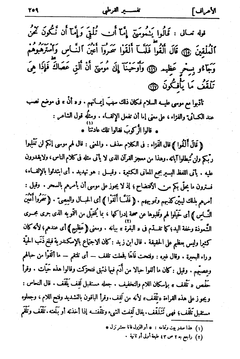 قالُوا يا مُوسى إِمَّا أَنْ تُلْقِيَ وَإِمَّا أَنْ نَكُونَ نَحْنُ الْمُلْقِينَ (١١٥) قالَ أَلْقُوا فَلَمَّا أَلْقَوْا سَحَرُوا أَعْيُنَ النَّاسِ وَاسْتَرْهَبُوهُمْ وَجاؤُ بِسِحْرٍ عَظِيمٍ (١١٦) وَأَوْحَيْنا إِلى مُوسى أَنْ أَلْقِ عَصاكَ فَإِذا هِيَ تَلْقَفُ مَا يَأْفِكُونَ (١١٧)